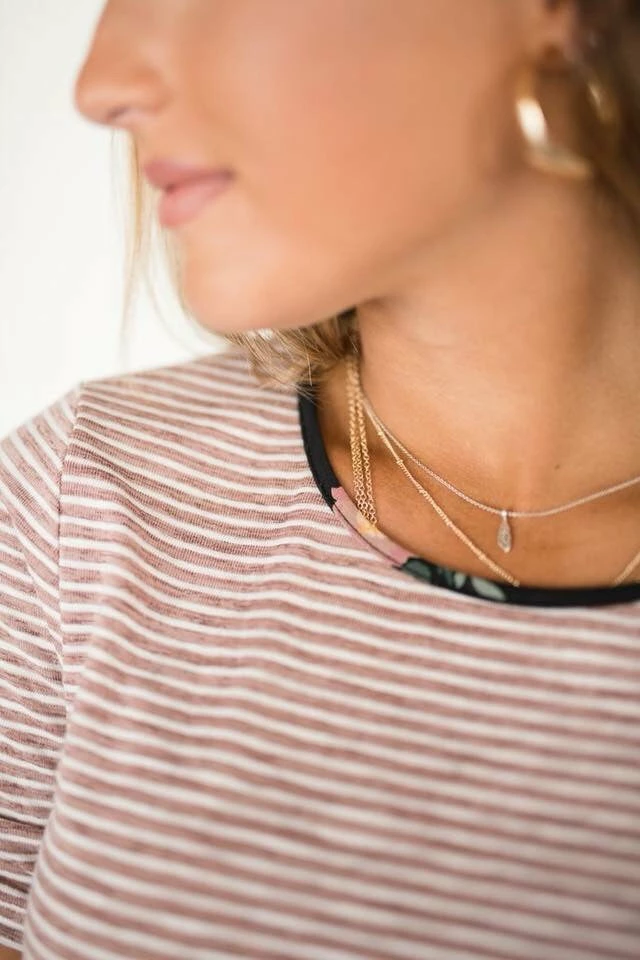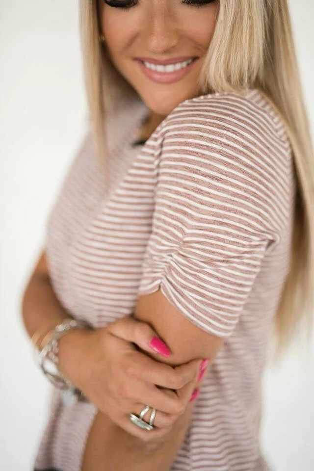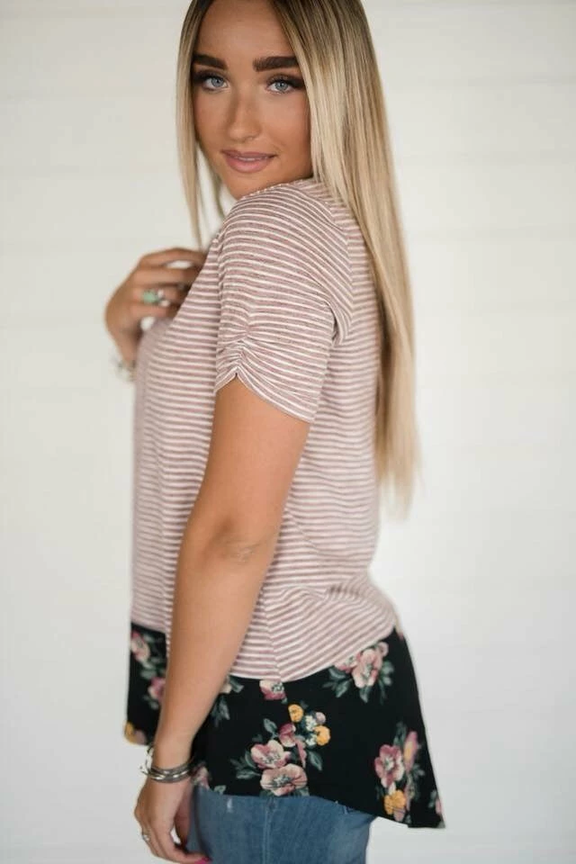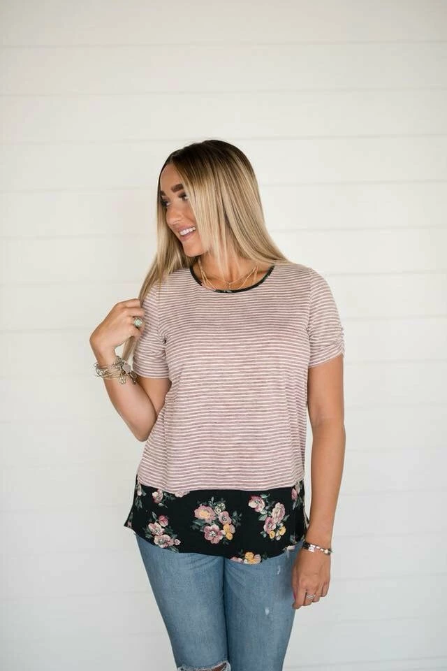 The Benton Harbor Top. This striped top has a floral hemline and is longer in the back to cover the booty. Would also be super cute paired with leggings and boots. 80% cotton and 20% polyester. Slight relaxed fit.ย