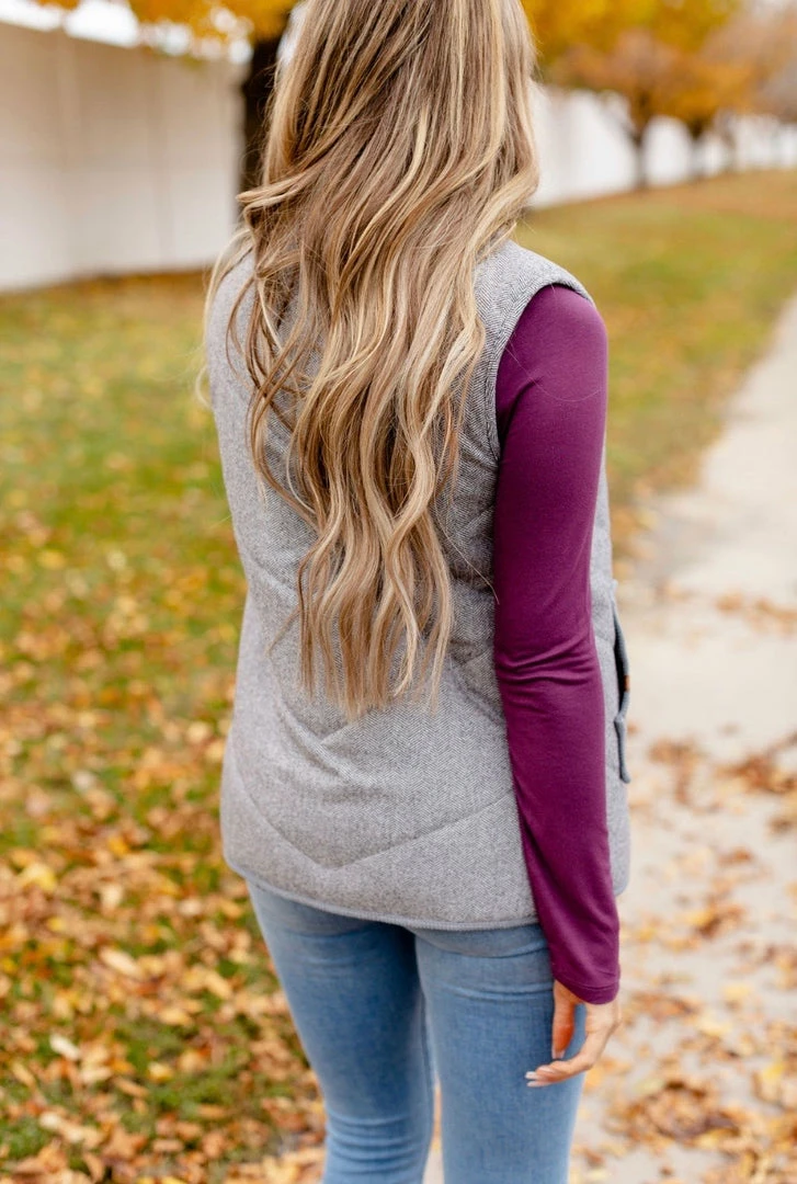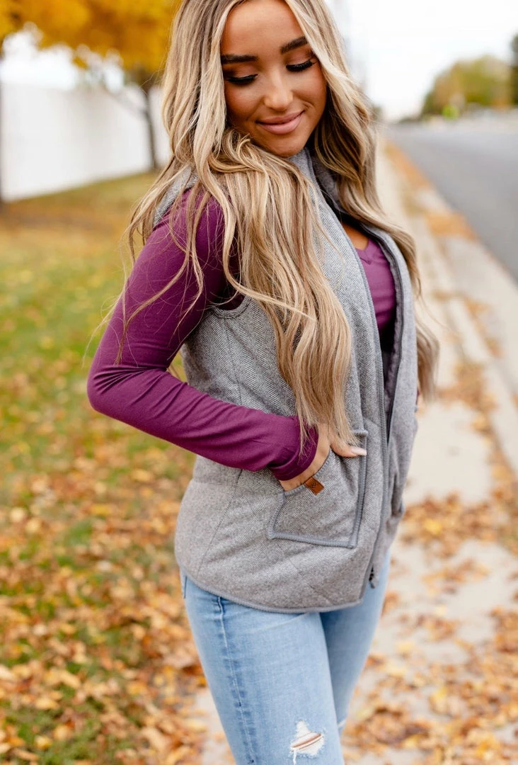 Perfect vest for transitioning into seasons. Grey herringbone vest that warm and is fabulous to layer with. Goes well with so many things. True to size.