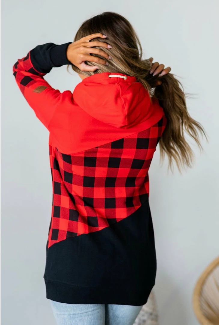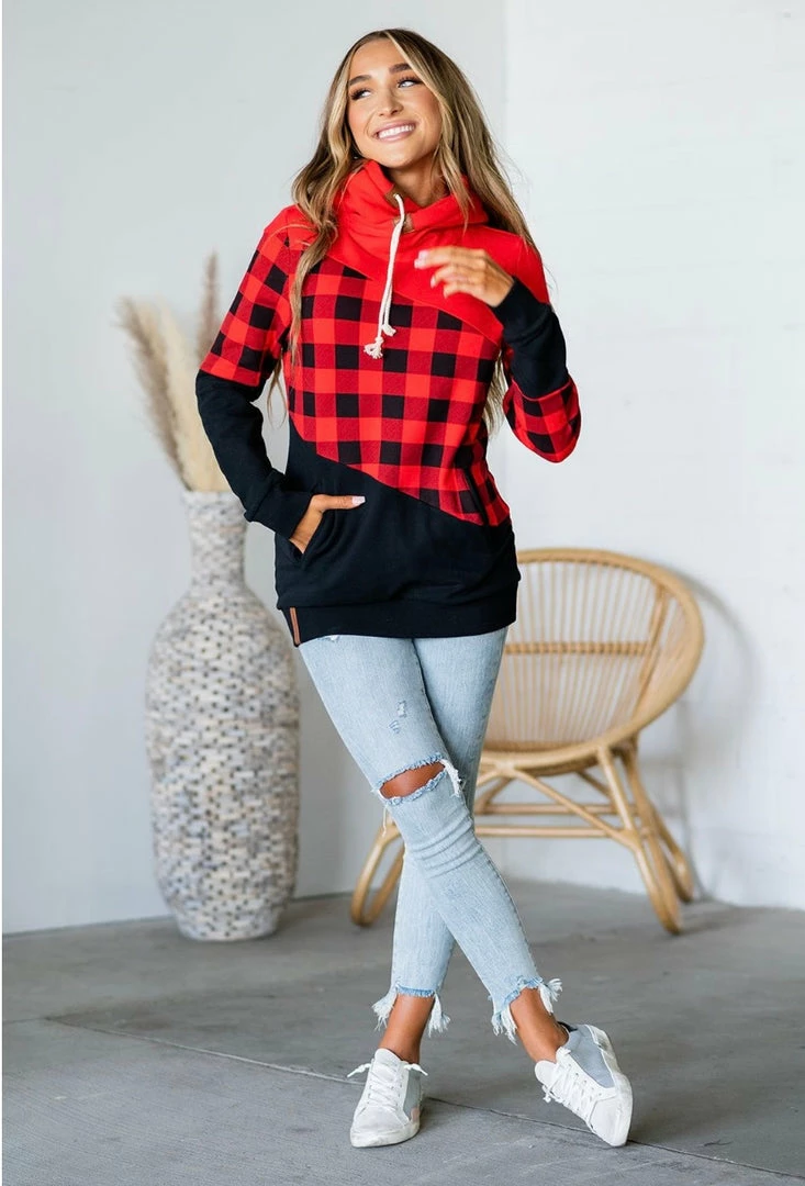 We love our Buffalo plaid around here. This singlehood is no exception. Red, Buffalo plaid and black tri-panel design with fleece lining and rope detail. Stretchy material. Size up if you prefer a looser look.ย