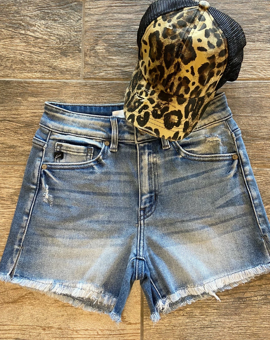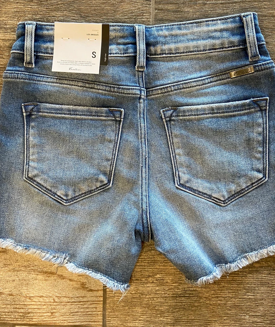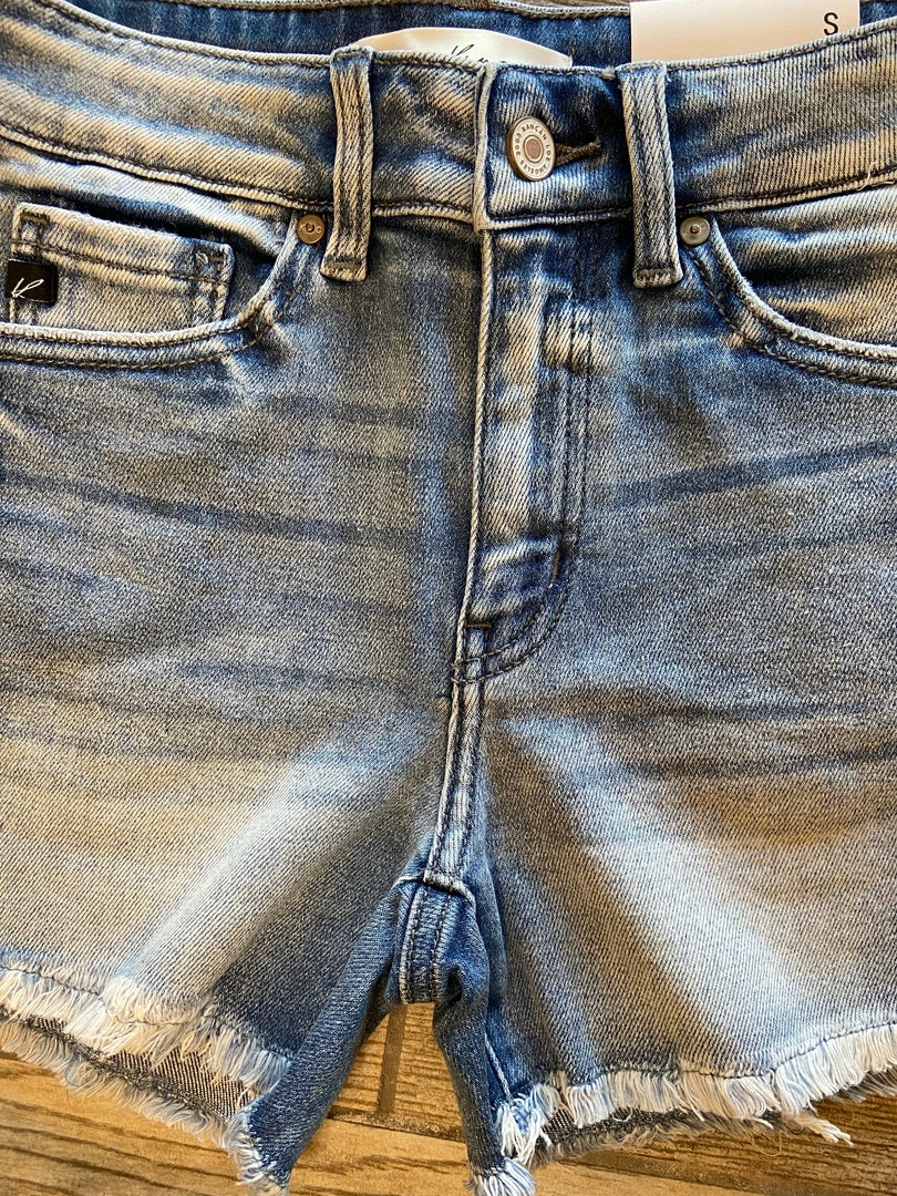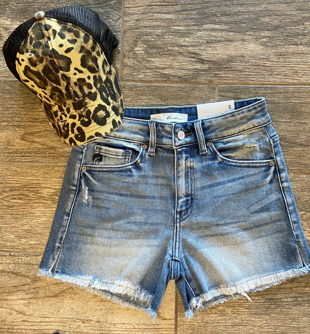 Summers not canceled. Flirty medium wash hi-rise jean shorts with frayed hem. Slight distressing with slots in the side. True to size.