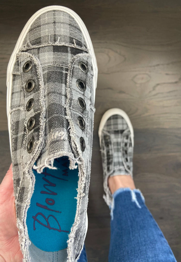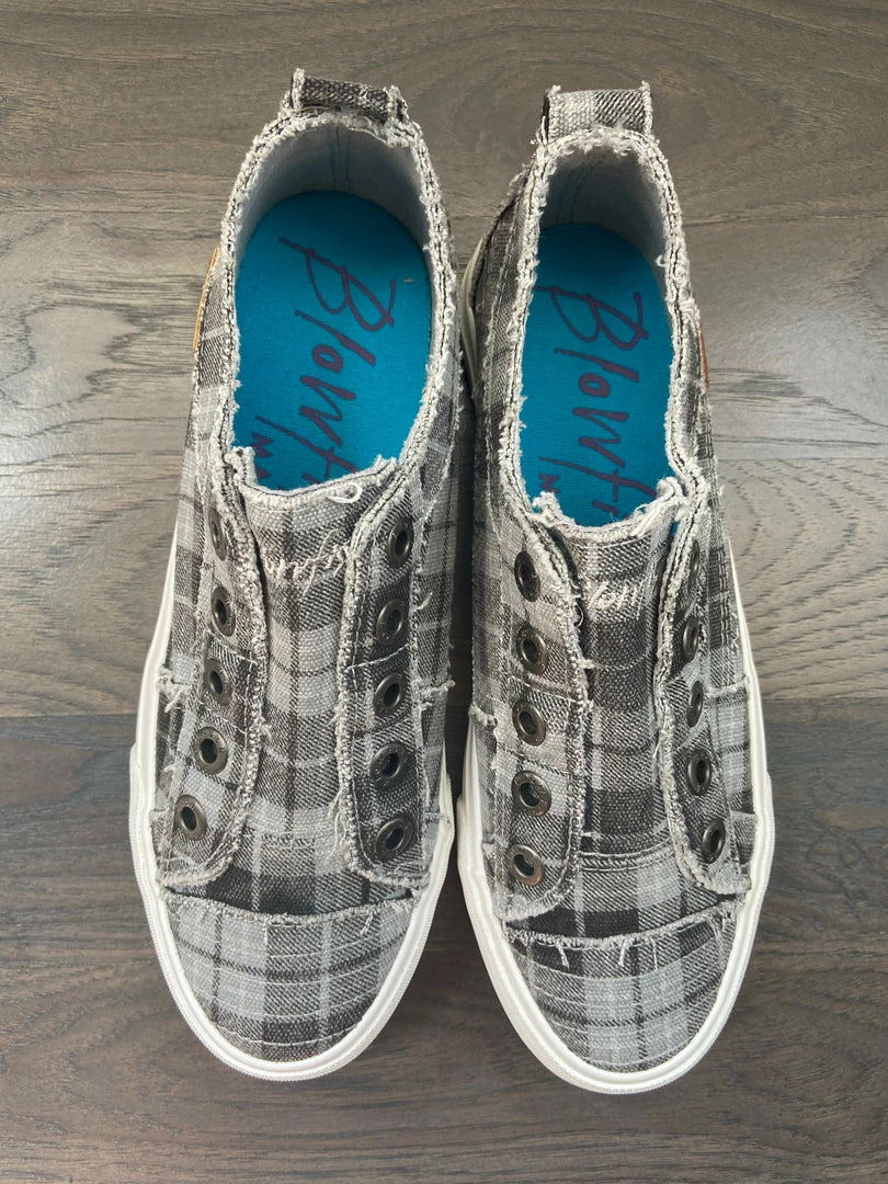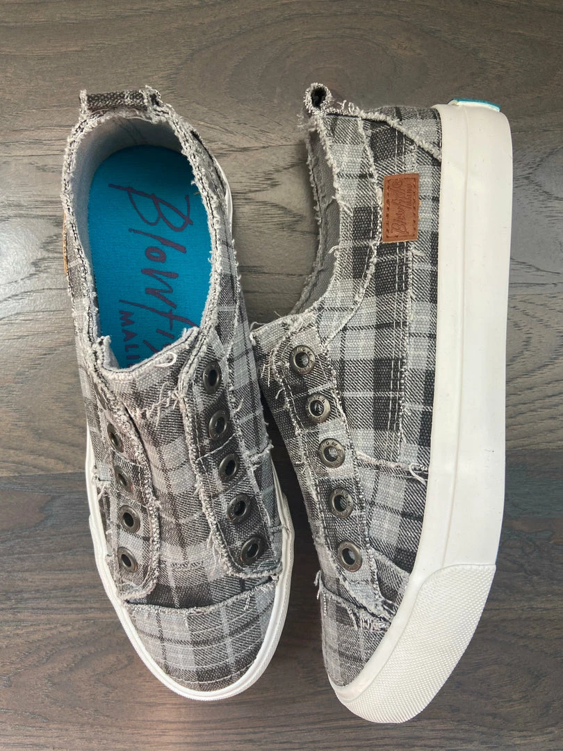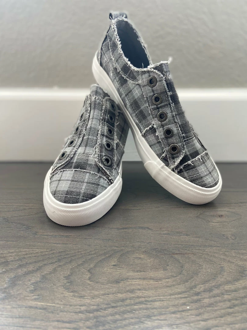 Our favorite Blowfish Play Sneaker in a gray plaid. Pre-distress and laceless for easy in and out access. You won’t want to miss out on these. True to size.
