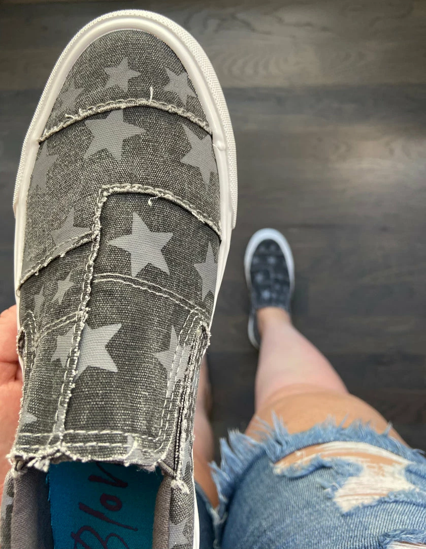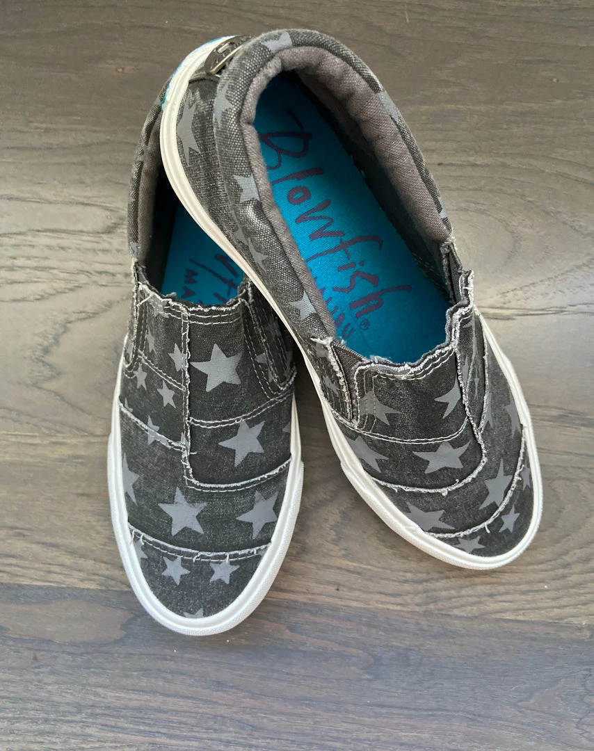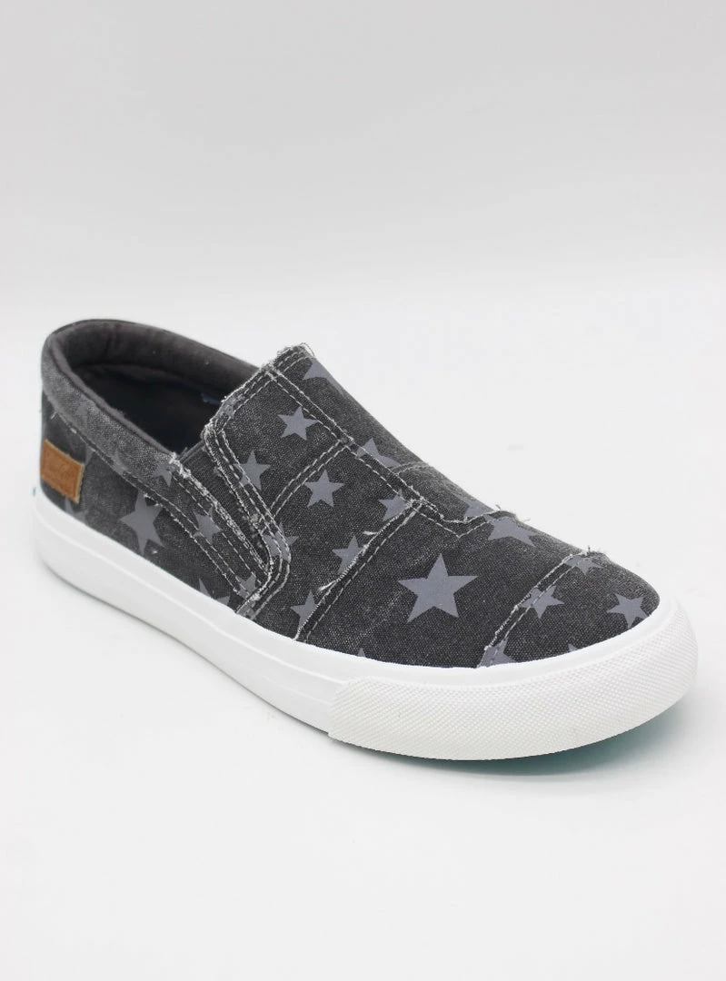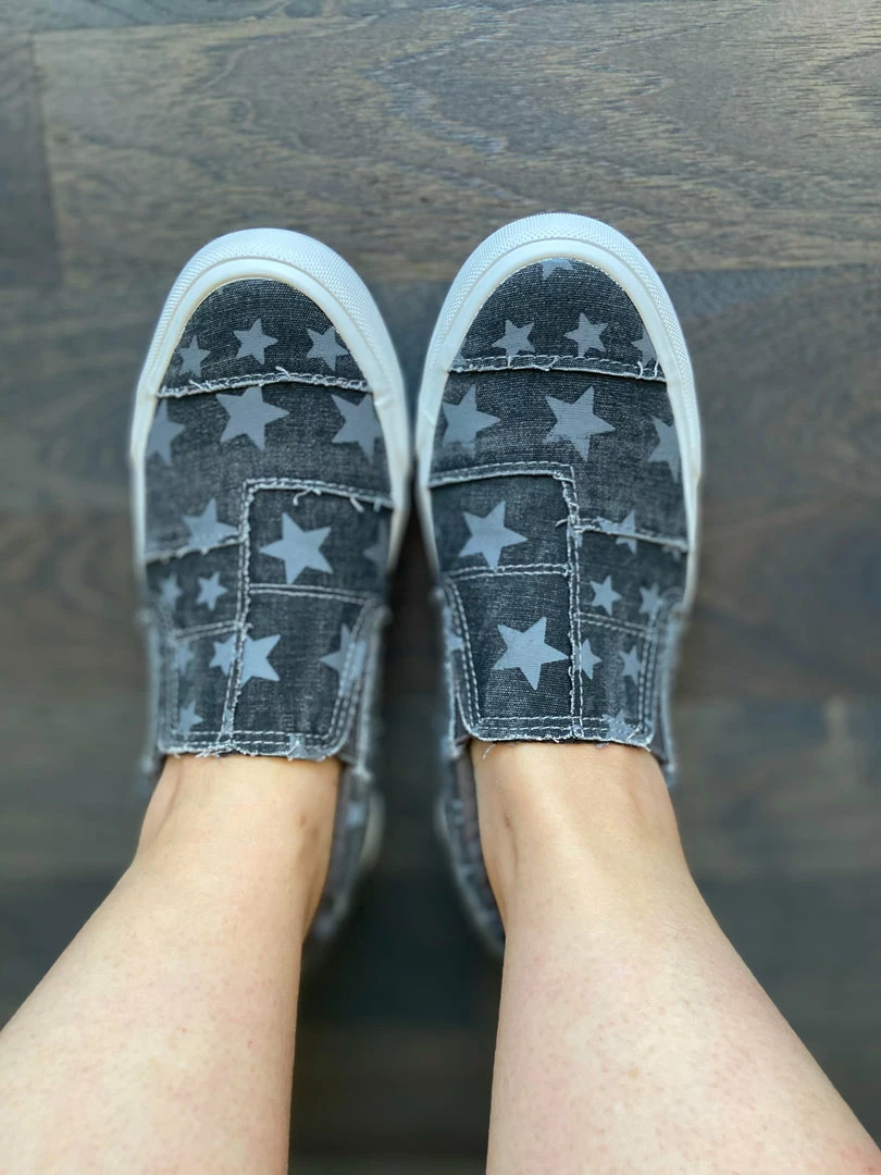 These fun slip on sneakers have a fun star print along with a distressed patch design. You wonโt want to miss out on these. Fits true to size.