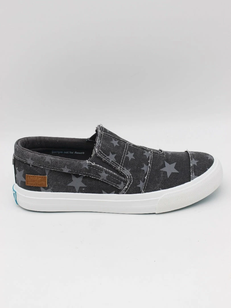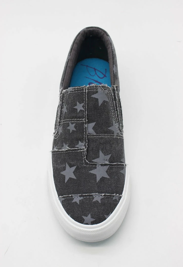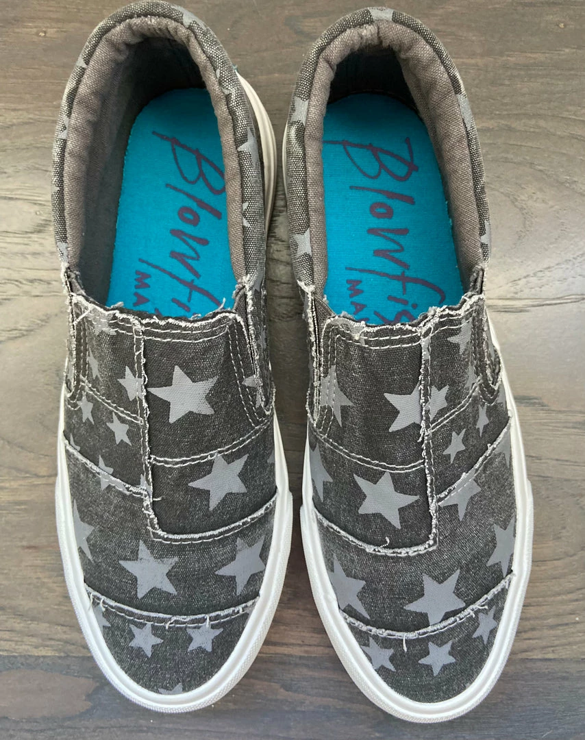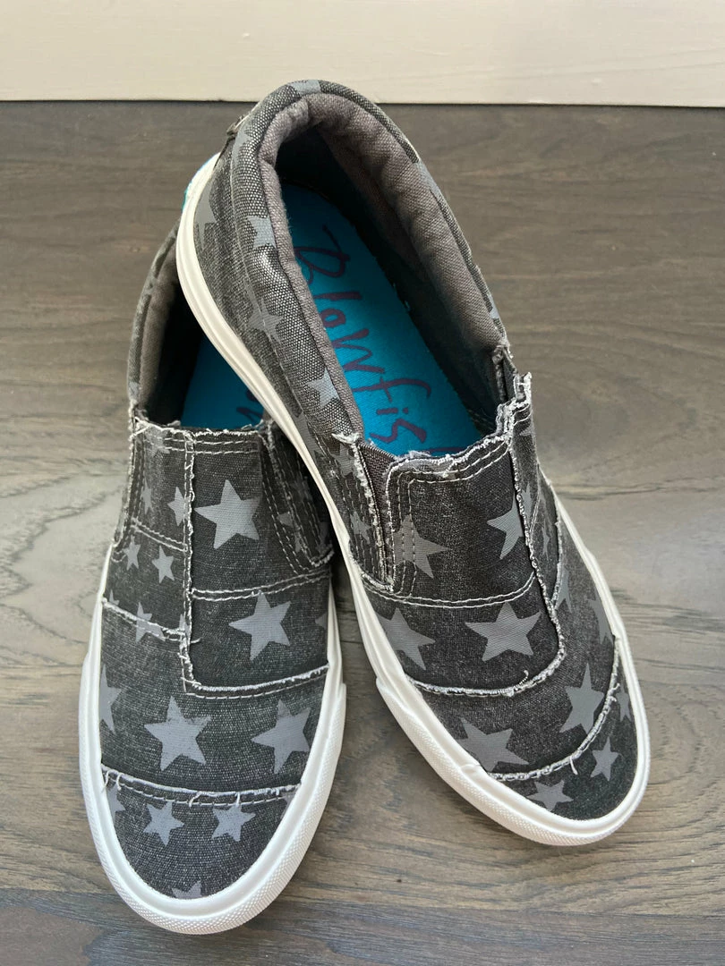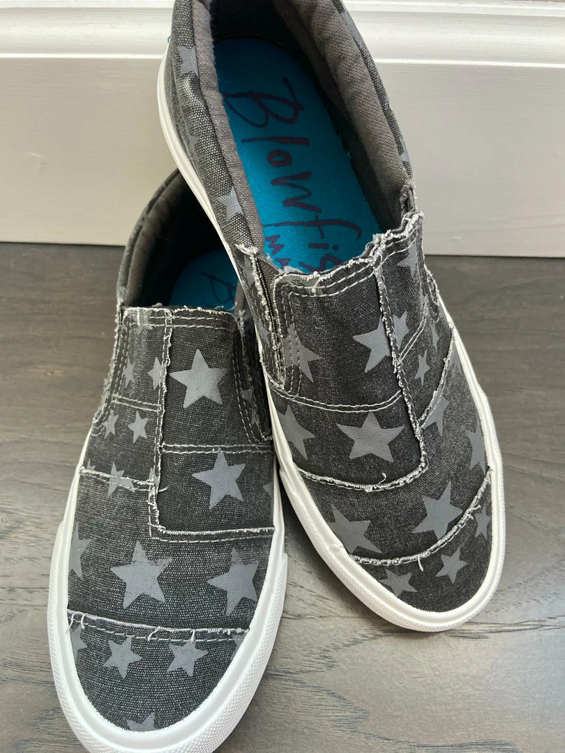 These fun slip on sneakers have a fun star print along with a distressed patch design. You wonโt want to miss out on these. Fits true to size.