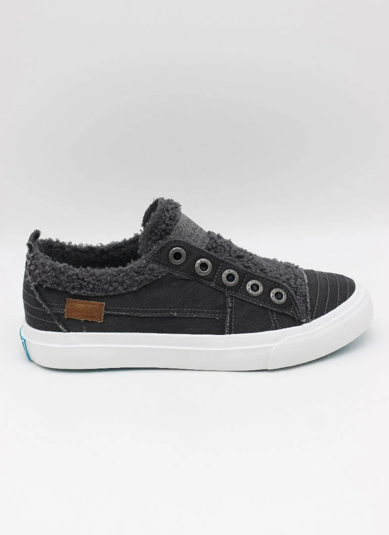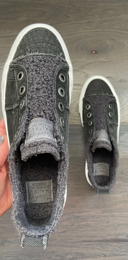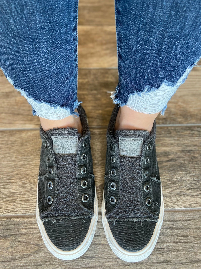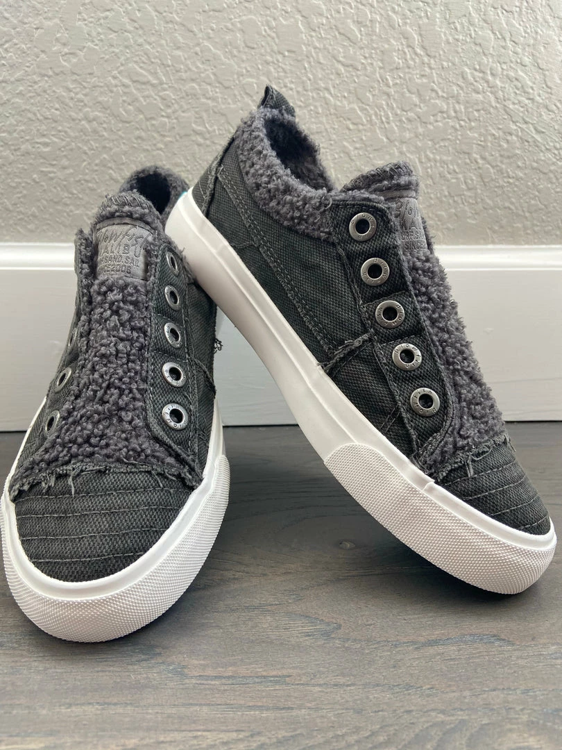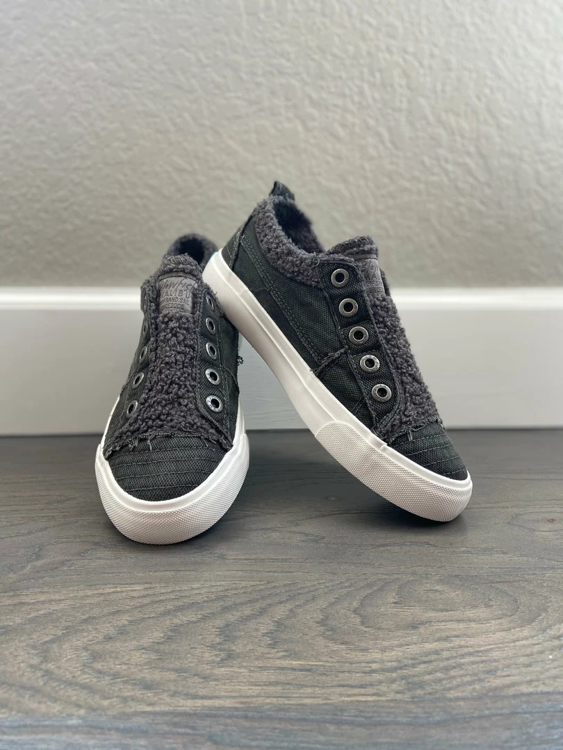 Our favorite Blowfish Playdoe Sneaker in a black smoke canvas with a faux sherpa accents. Pre-distress and laceless for easy in and out access. You won’t want to miss out on these. True to size.