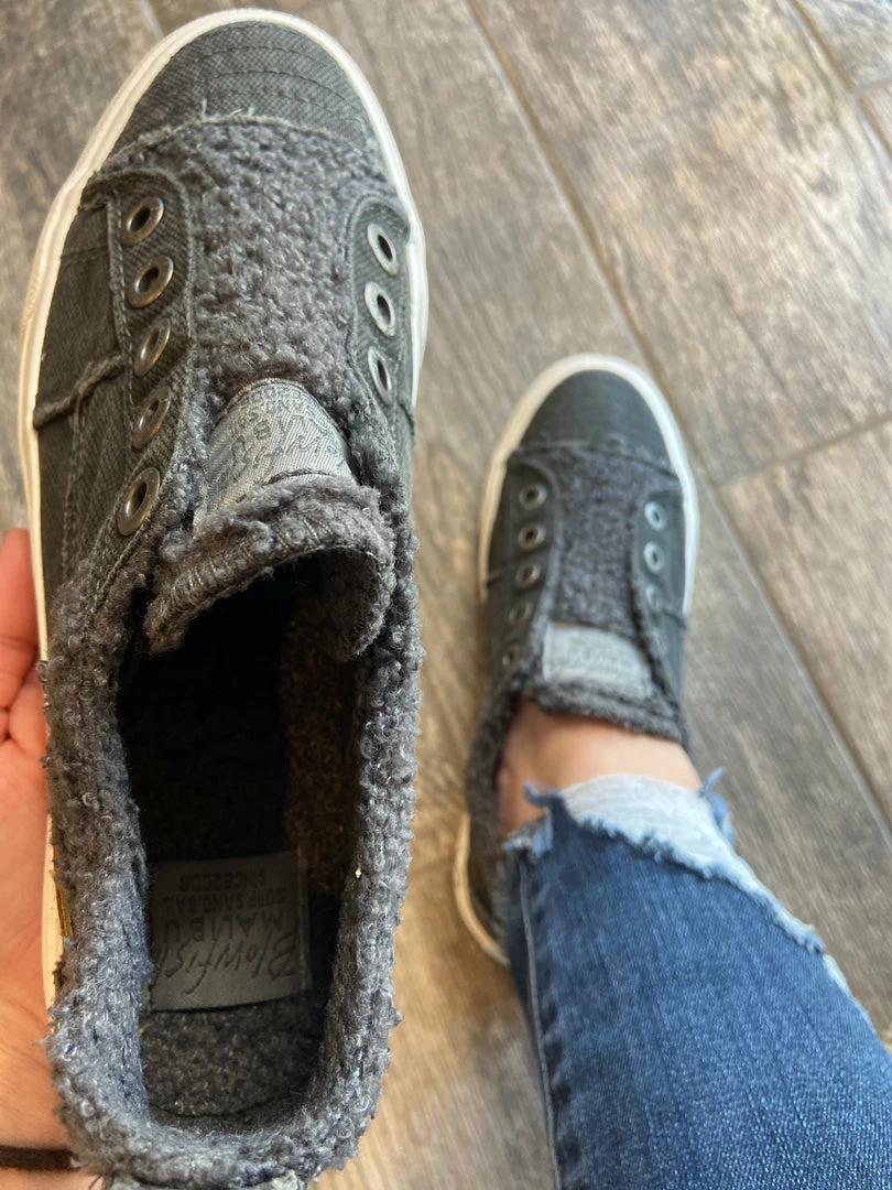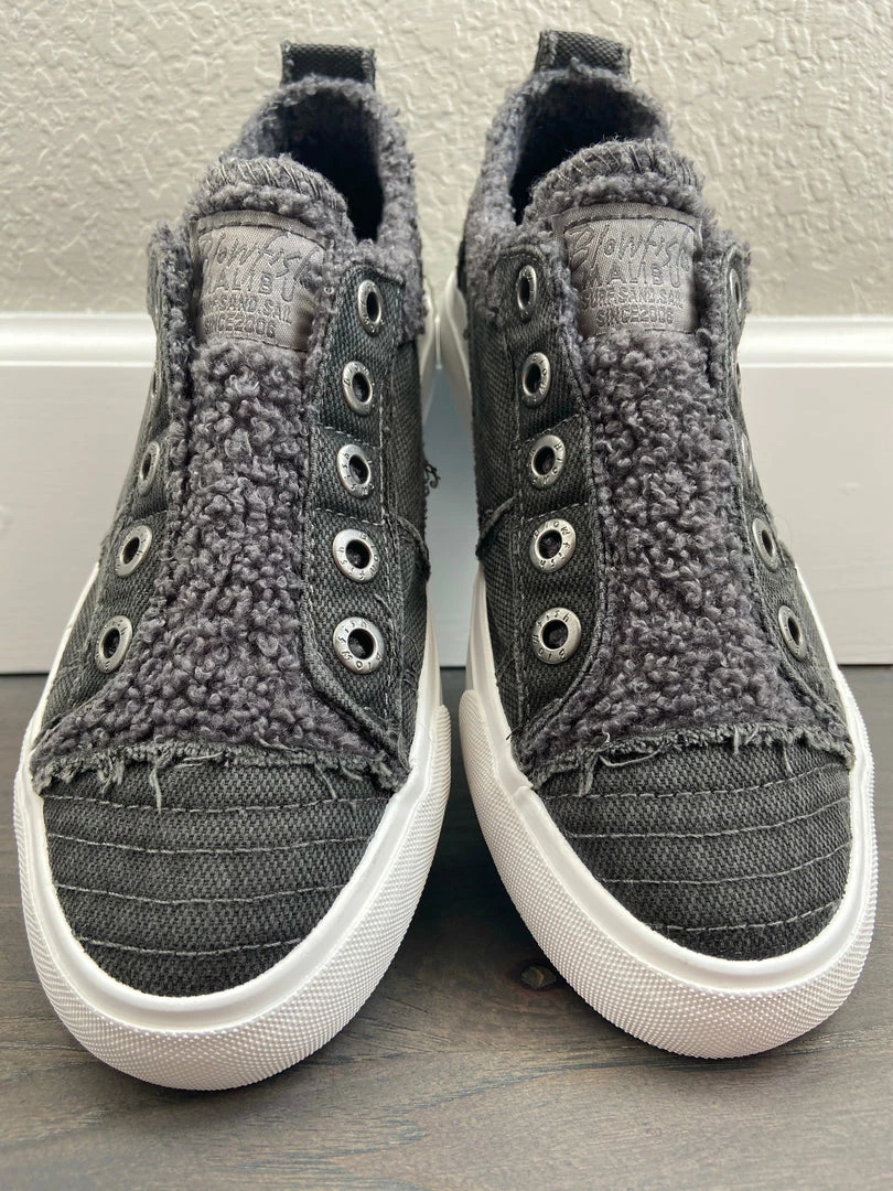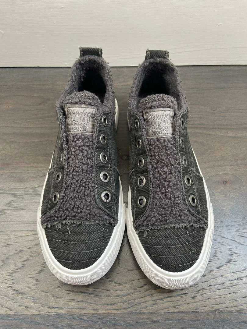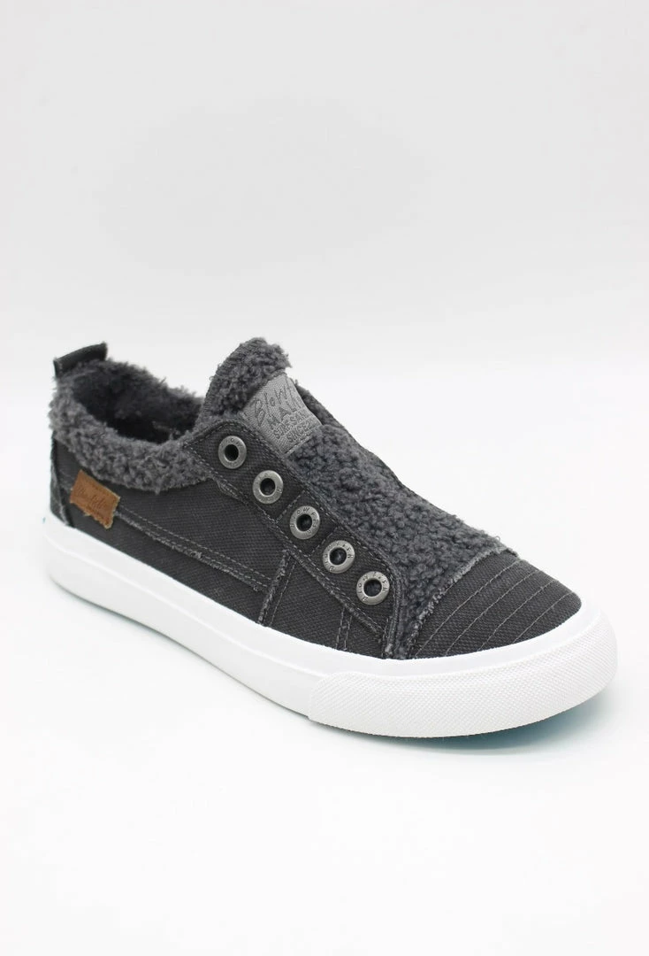 Our favorite Blowfish Playdoe Sneaker in a black smoke canvas with a faux sherpa accents. Pre-distress and laceless for easy in and out access. You won’t want to miss out on these. True to size.