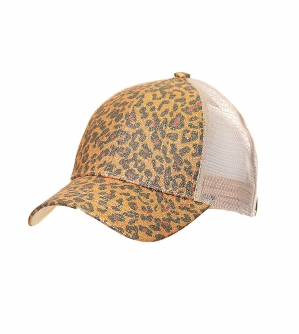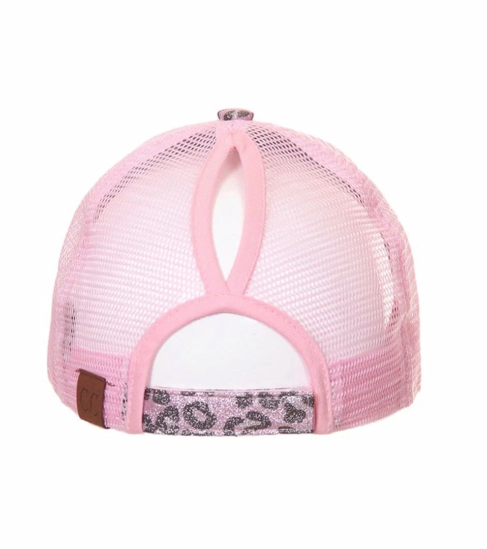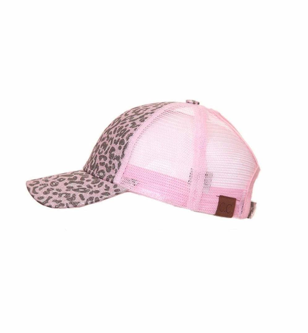 C.C cute Leopard glitter distressed mesh hat with ponytail opening. Available in brown and rose colored leopard.