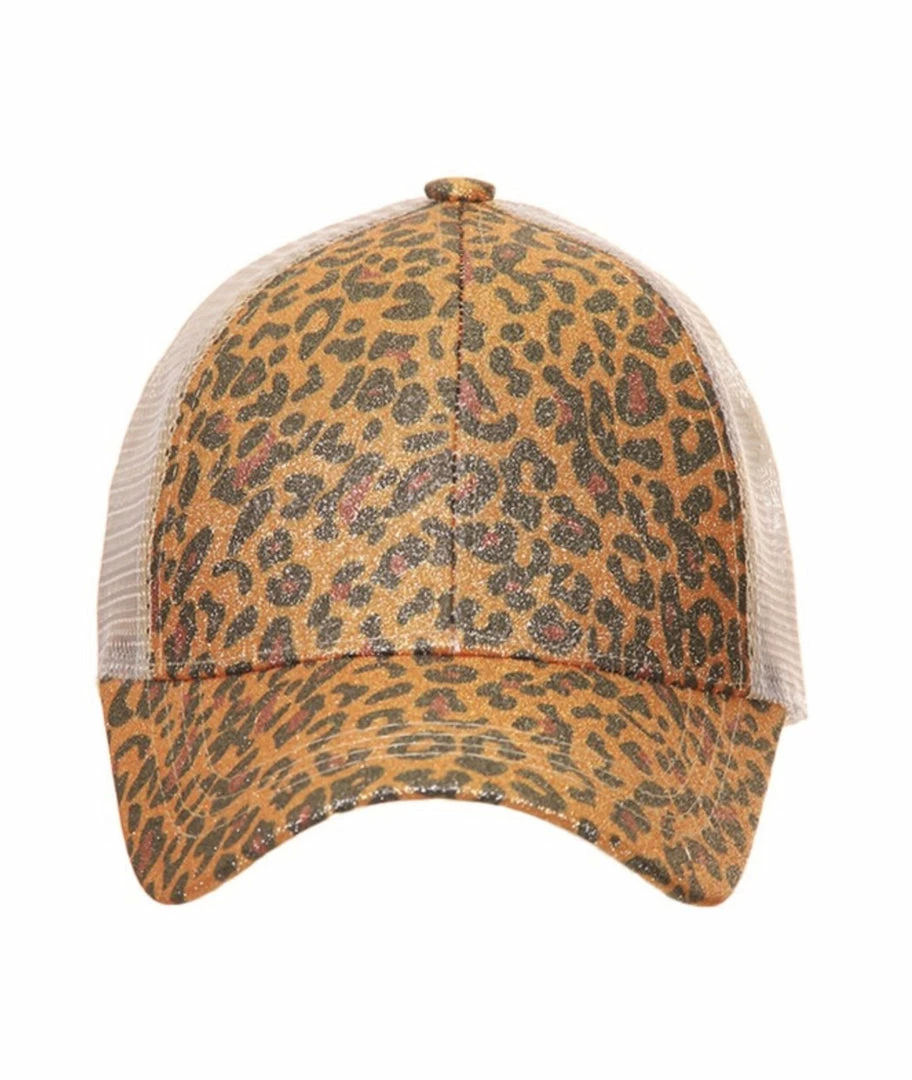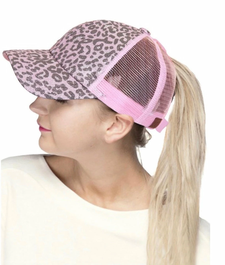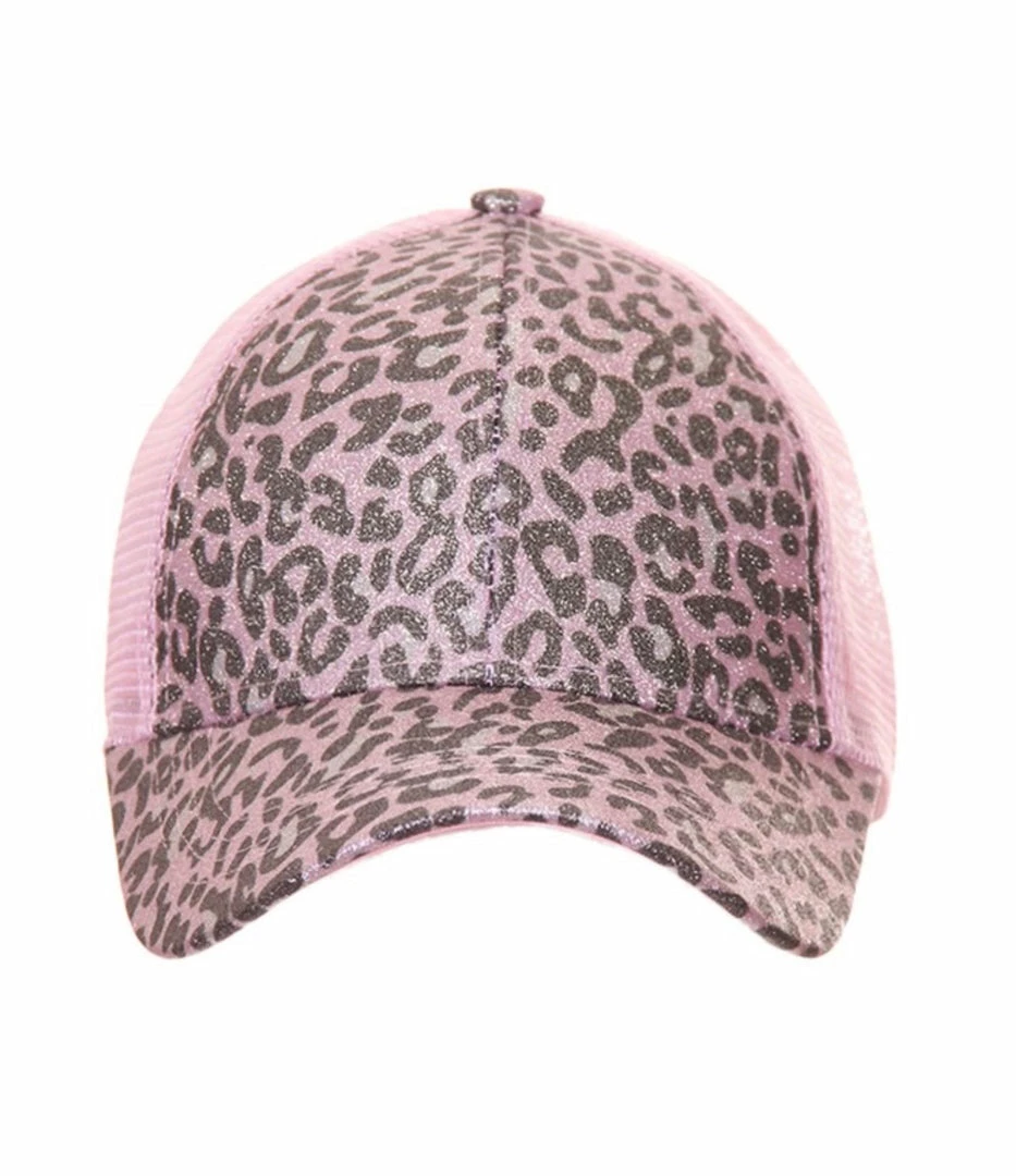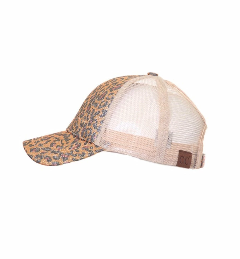 C.C cute Leopard glitter distressed mesh hat with ponytail opening. Available in brown and rose colored leopard.