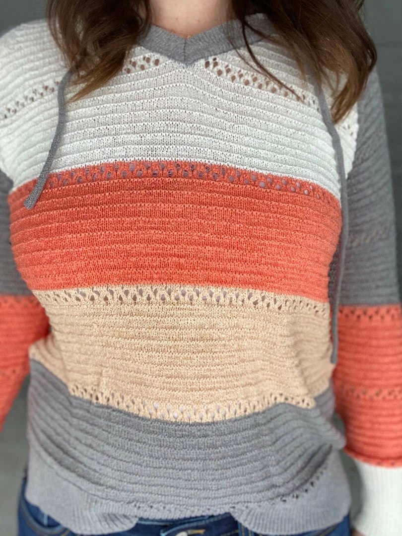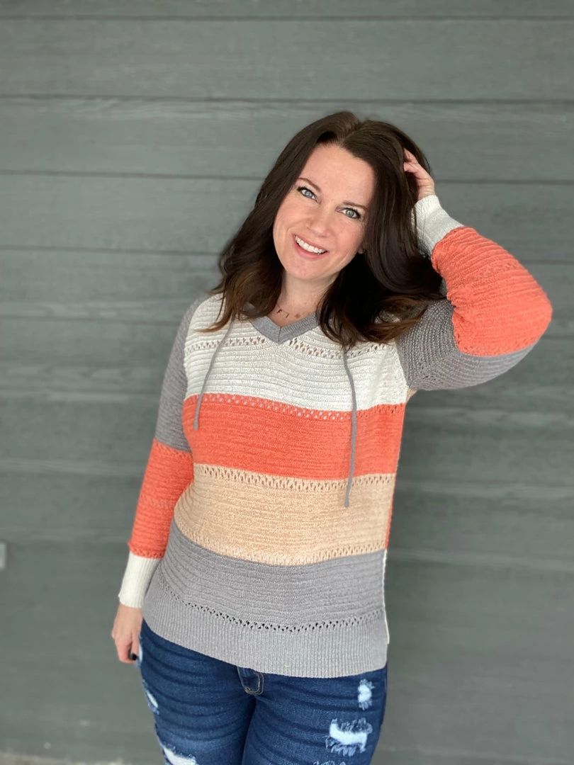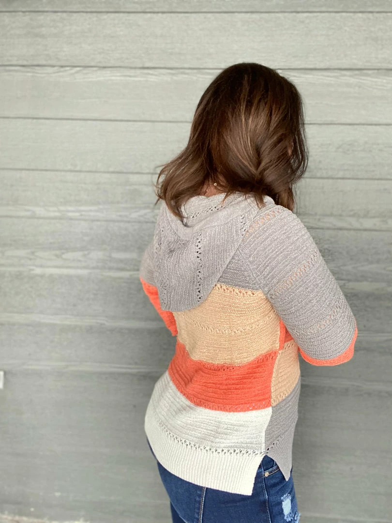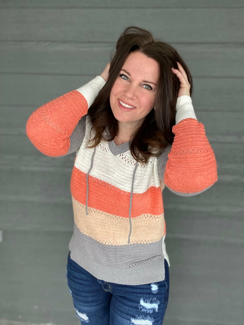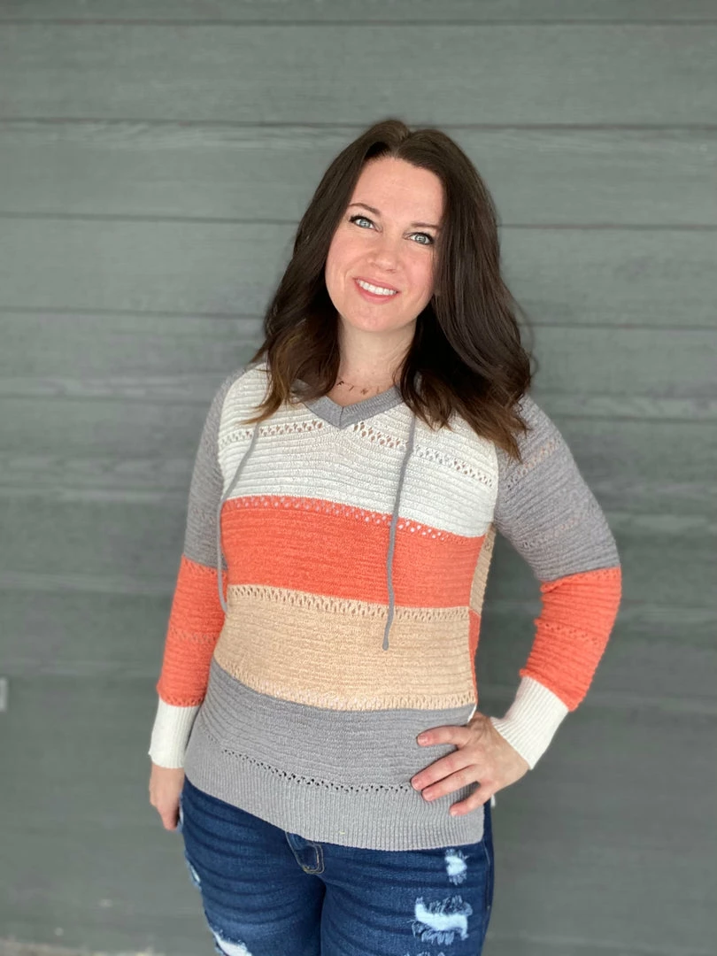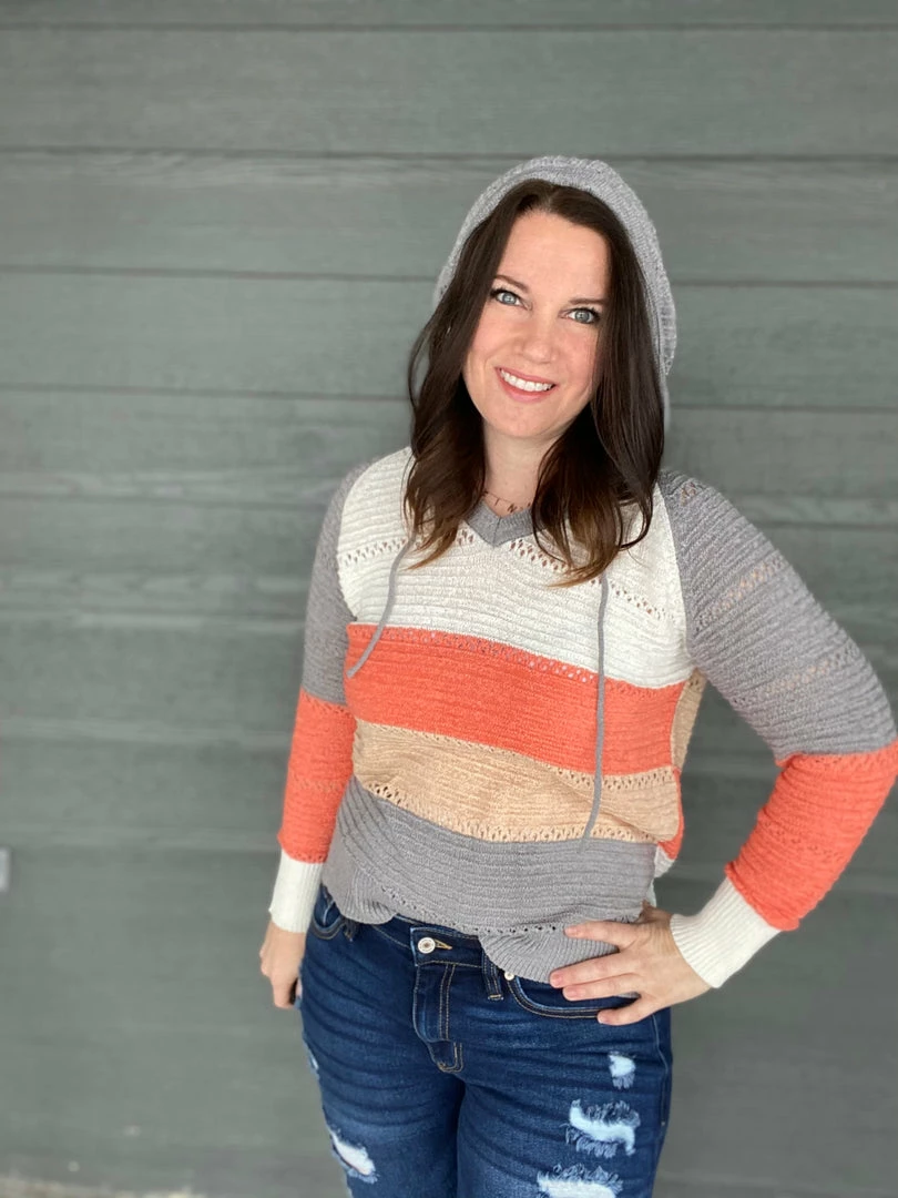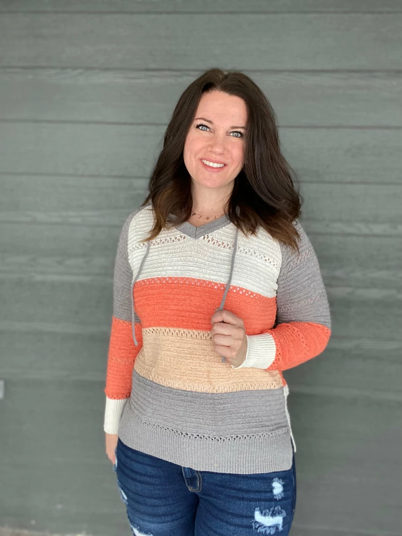 Gorgeous colorblock hooded knitted sweater. Itβs lightweight so itβs perfect to throw on on a chilly spring night. True to size. 60% acrylic and 40% nylon. Model is wearing a size small.Β
