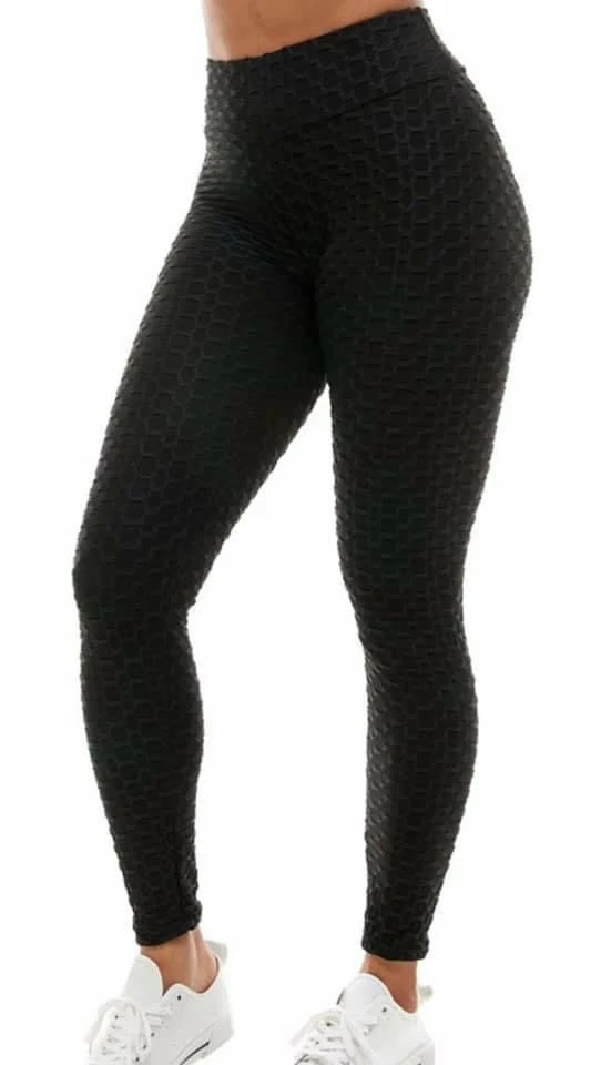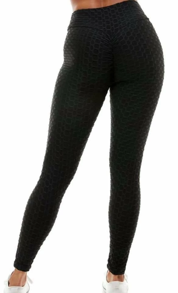Honeycomb black leggings with scrunching on the booty to make your peach look bootylicious. AKA TicTok leggings. 90% polyester and 10% spandex.