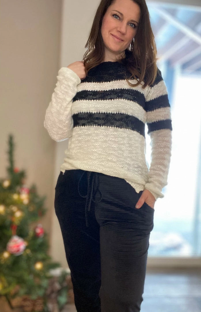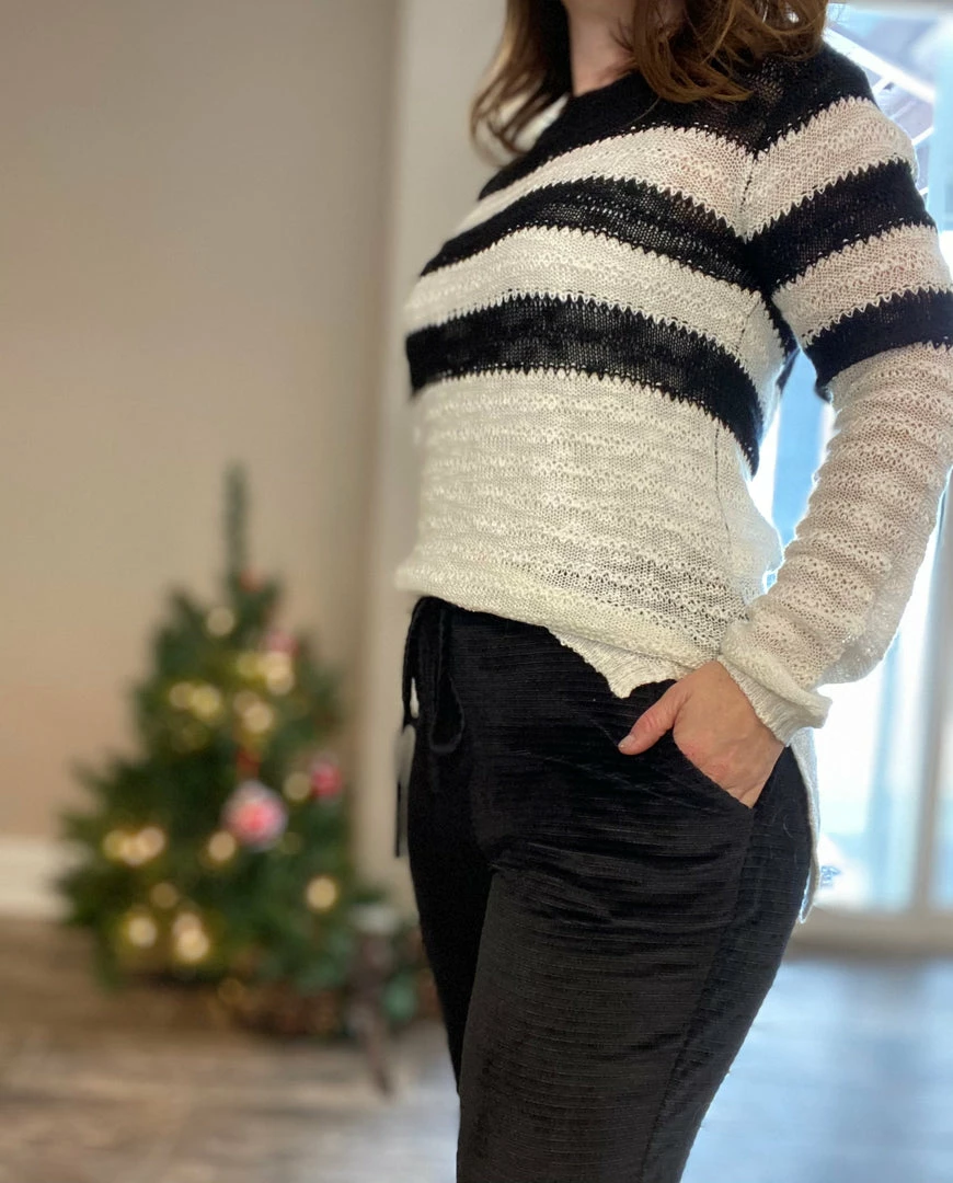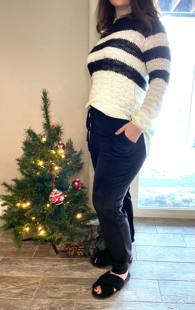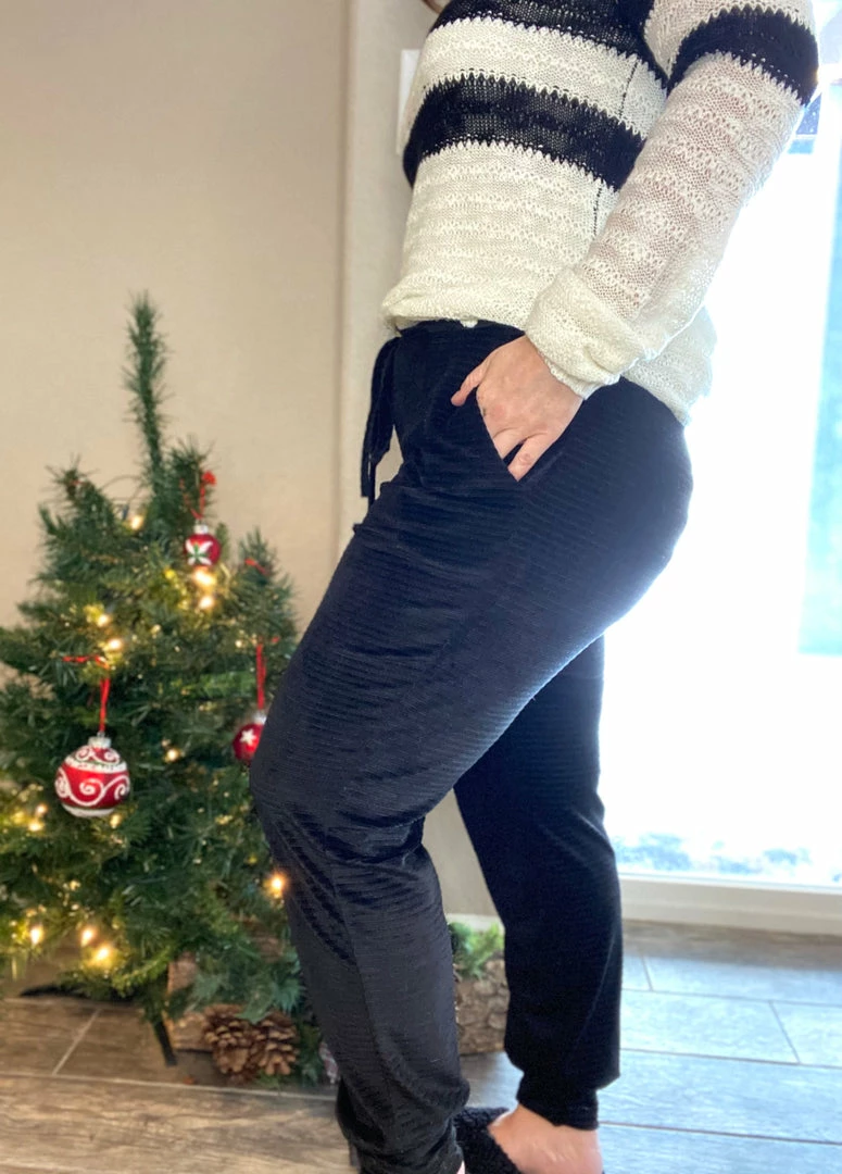 We are crushing hard on these drawstring velvety like corduroy black joggers. These are incredibly cozy and soft. True to size and stretchy. Model is wearing a size small.