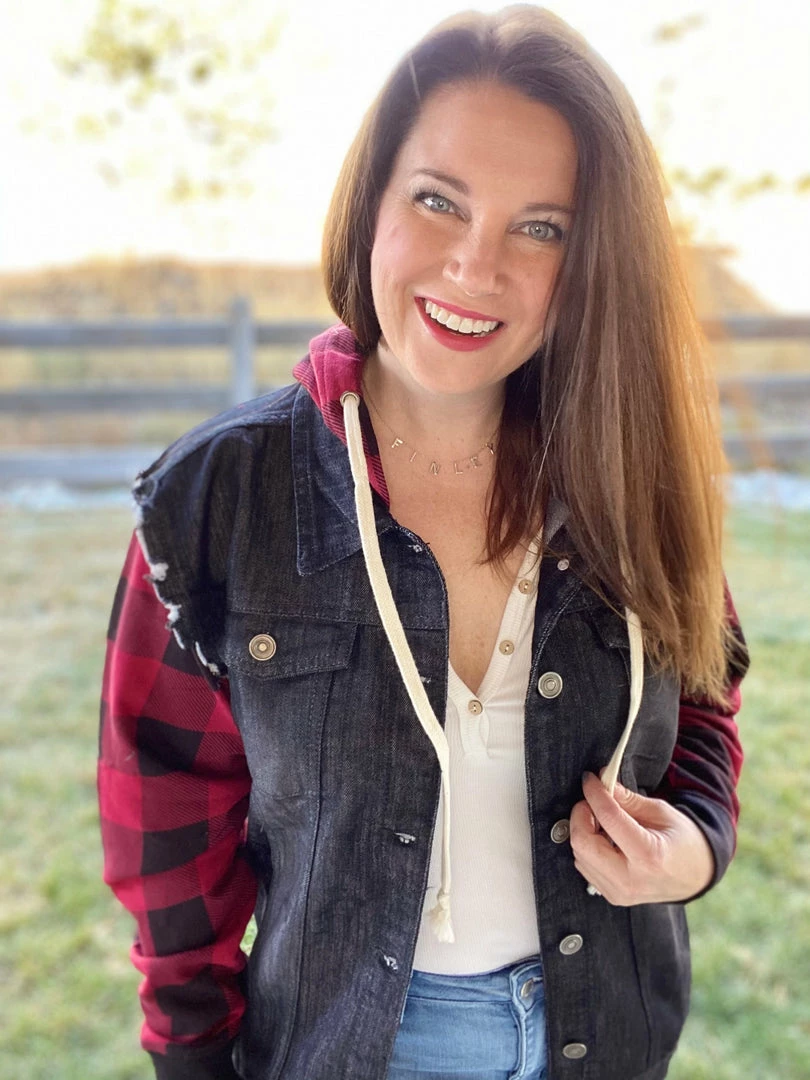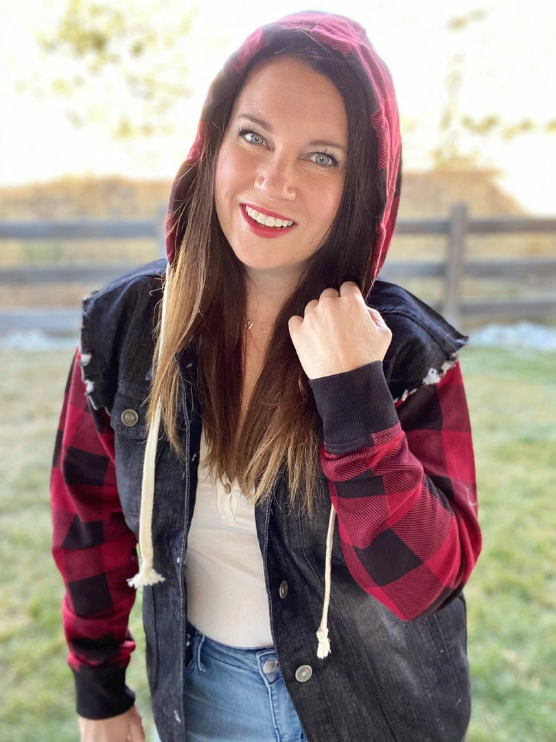 Black denim jacket with black and white Buffalo plaid sleeves and hood. Raw edges at shoulder for a fun look.Β Oversized fit. Model is wearing a size small.