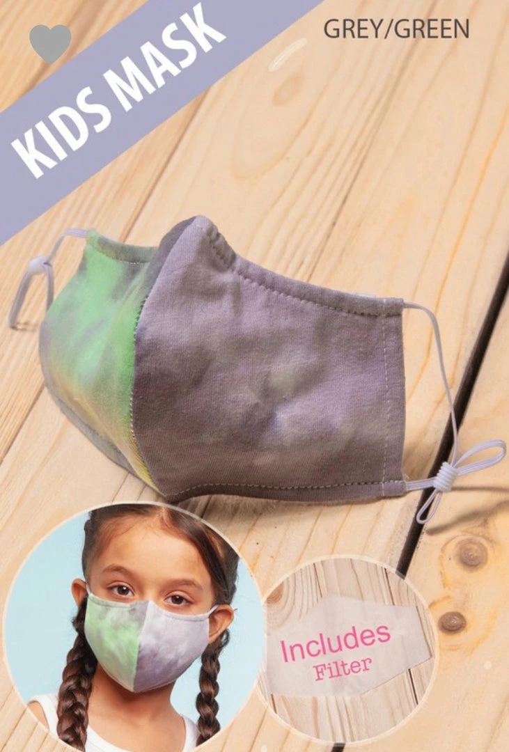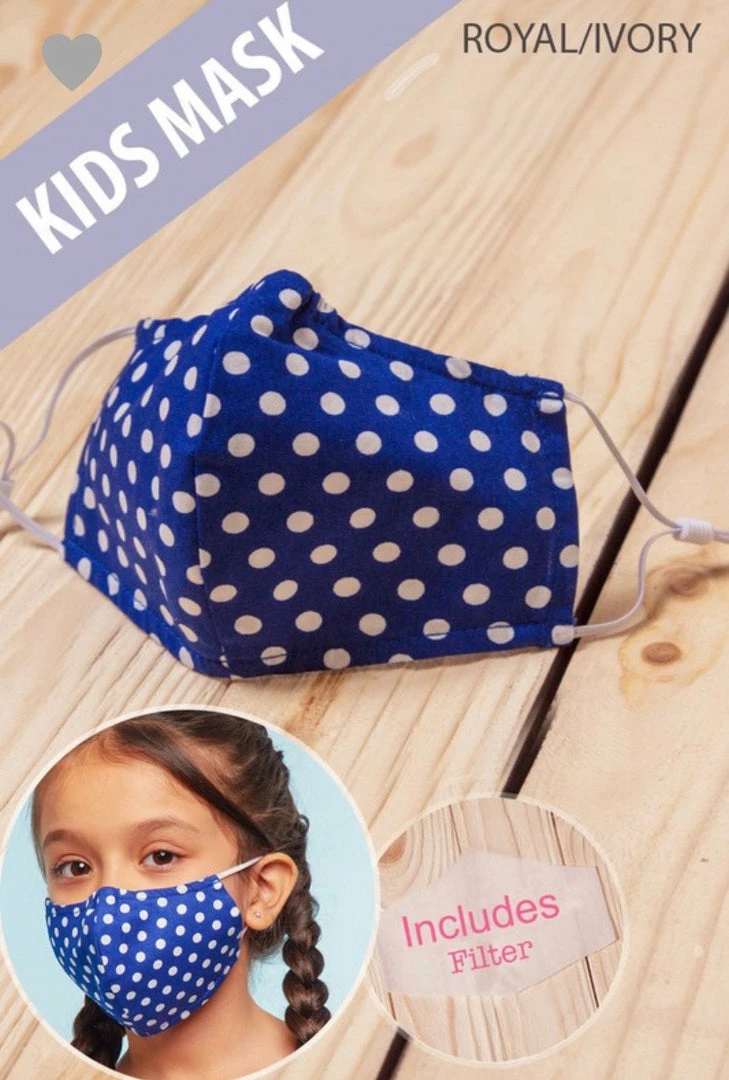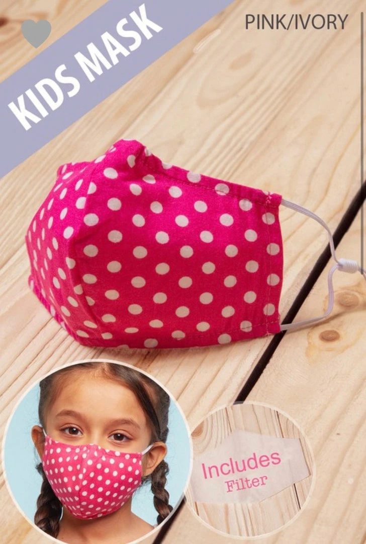 Non-medical face mask for ages 3-8. Reusable and washable. Comes with filter and elastic straps. Polka dots and grey/green are adjustable and have a fitted nose design.