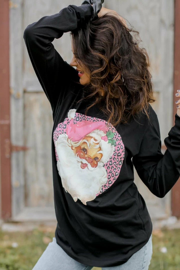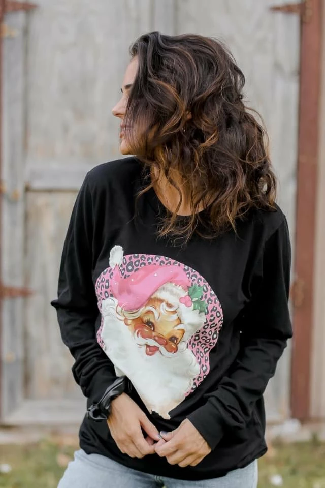 Long sleeved tee with Santa and a little bit of leopard. Our personal favorite and perfect for Christmas festivities. Unisex fit. Size down for a more fitted look. 100% cotton.