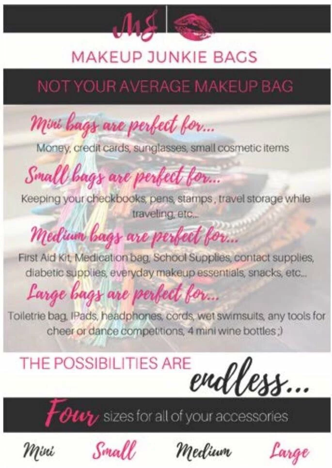 Makeup Junkie bag with flat lay and middle zipper to not dig through an endless black hole. Moisture resistant liner for an easy clean.ย Comes with coordinating tassel. LIFETIME GUARANTEE!