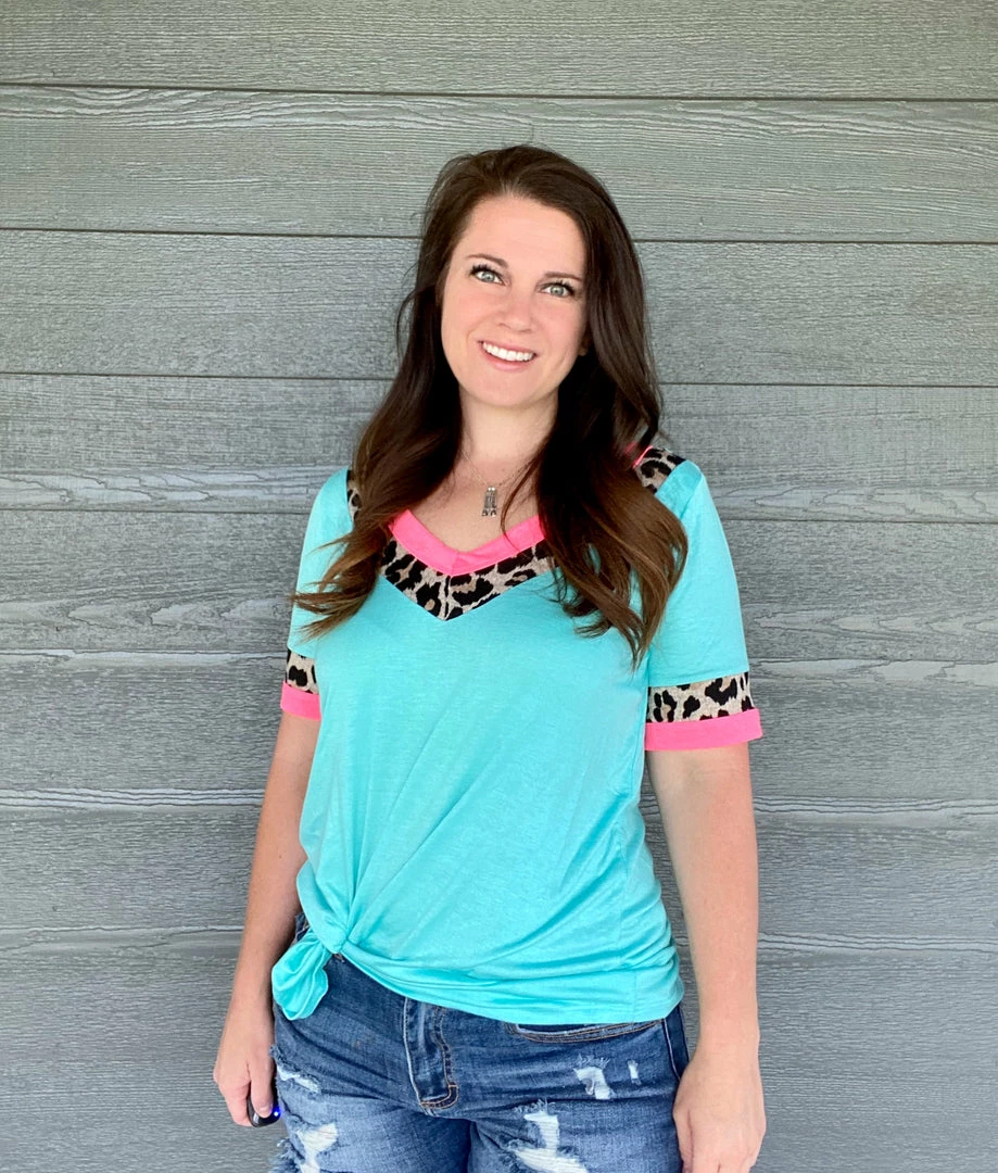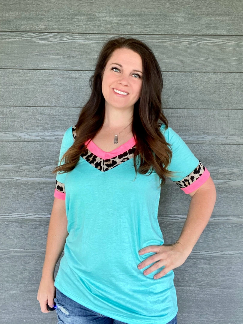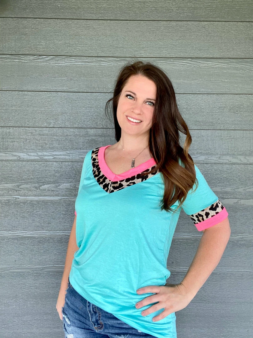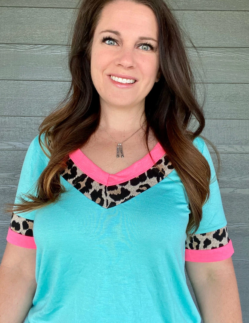 V-neck bright mint tee with neon pink and leopard accents. Relaxed fit with stretch. Model is wearing a size small. Self: 95% polyester 5% spandex.