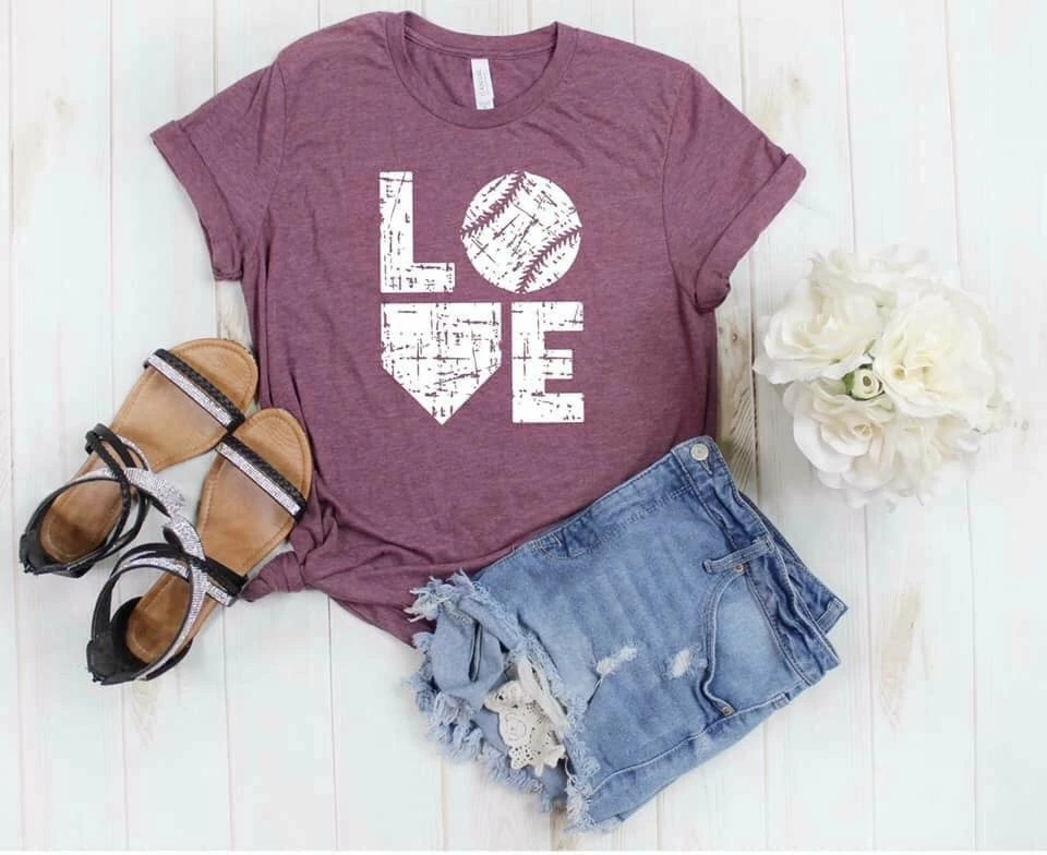 Show your love for softball and baseball games in this tee. Heather maroon with White distressed love. True to size (unisex fit). 52% cotton 48% polyester.