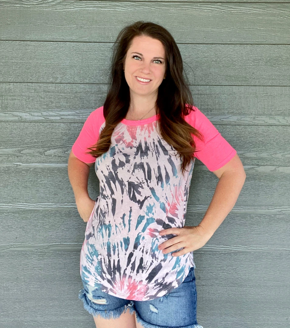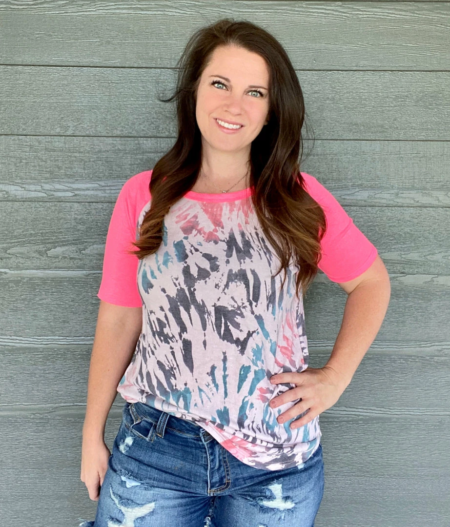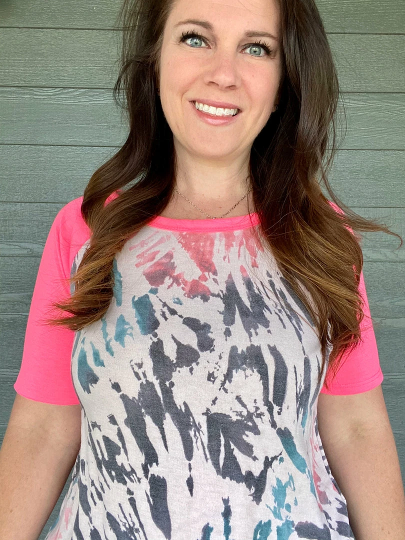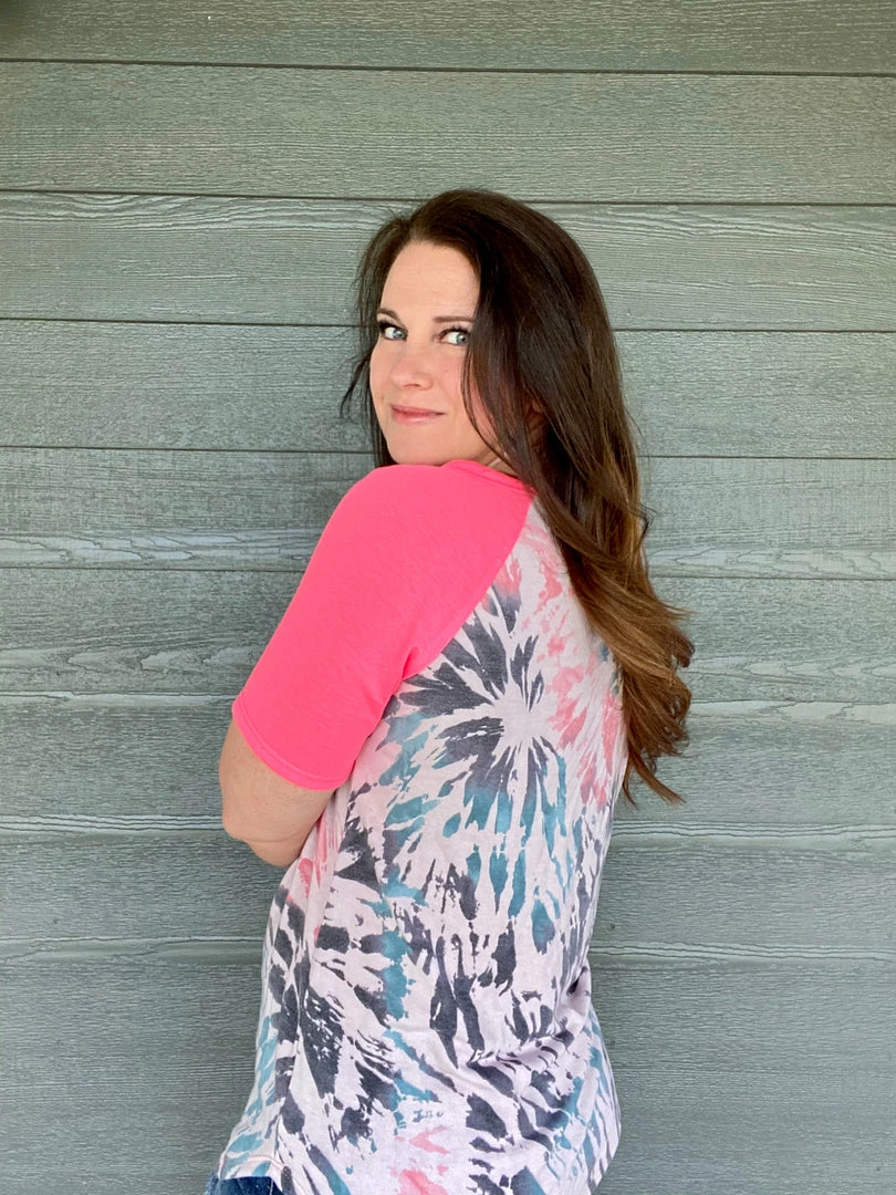 Colorful tie dye French terry with neon pink raglan sleeves. Relaxed fit. Self: 63% polyester, 33% rayon and 4% spandex. Model is wearing a size small.