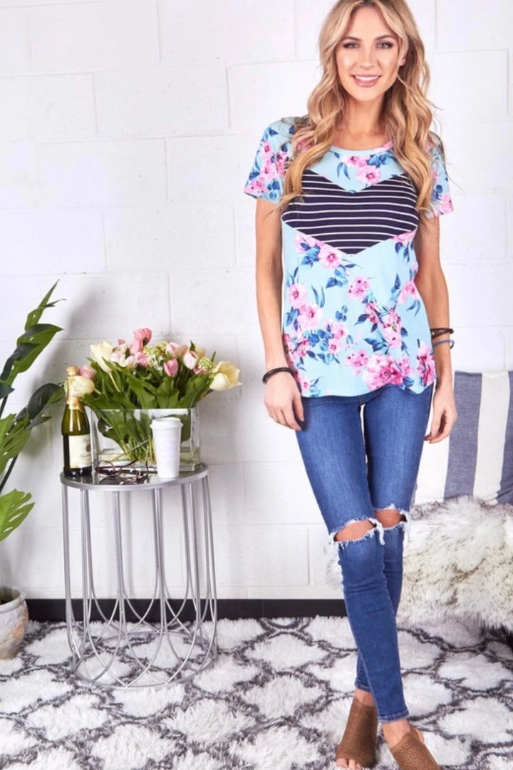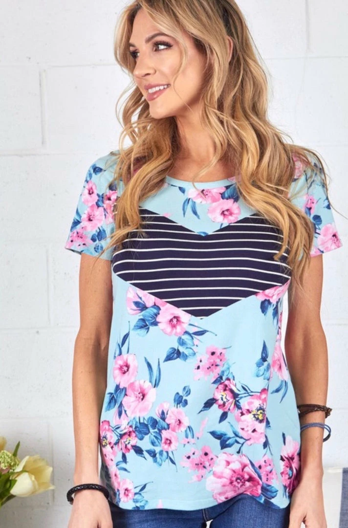 Mint floral print top with chevron black and white stripes is irresistible. Itโs buttery soft and true to size. Self: 97% polyester 3% spandex. Contrast: 95% rayon 5% spandex;