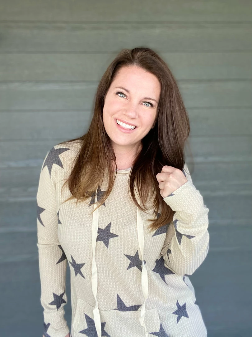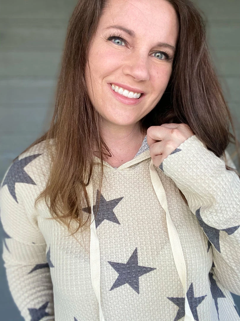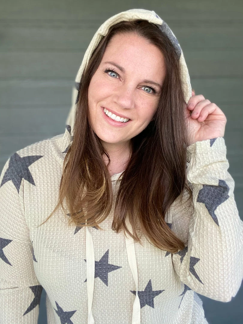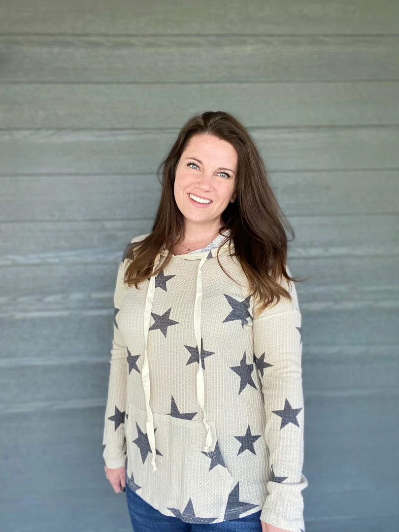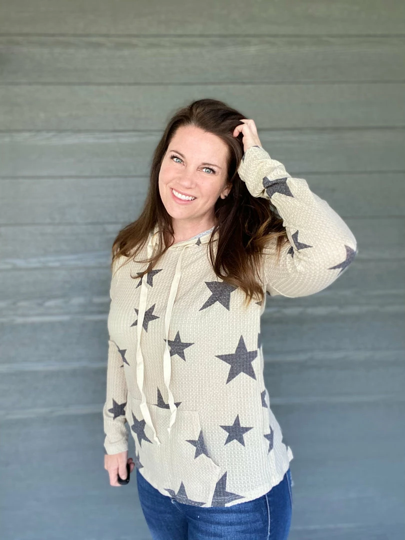 This waffle taupe charcoal star print is lightweight for a great traditional piece. We love that it has a hoodie and with a kangaroo front pocket. Add leggings and sneakers for a casual day. 95% rayon, 5% Spandex. Model is wearing a size small. Relaxed fit.