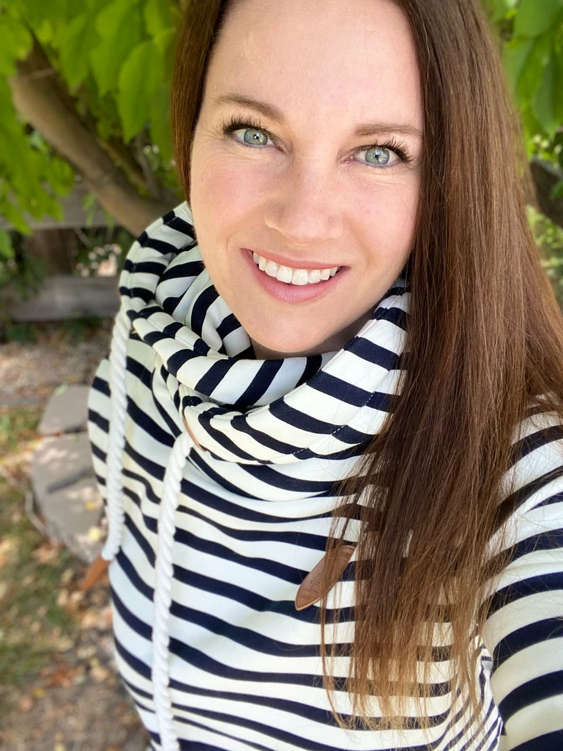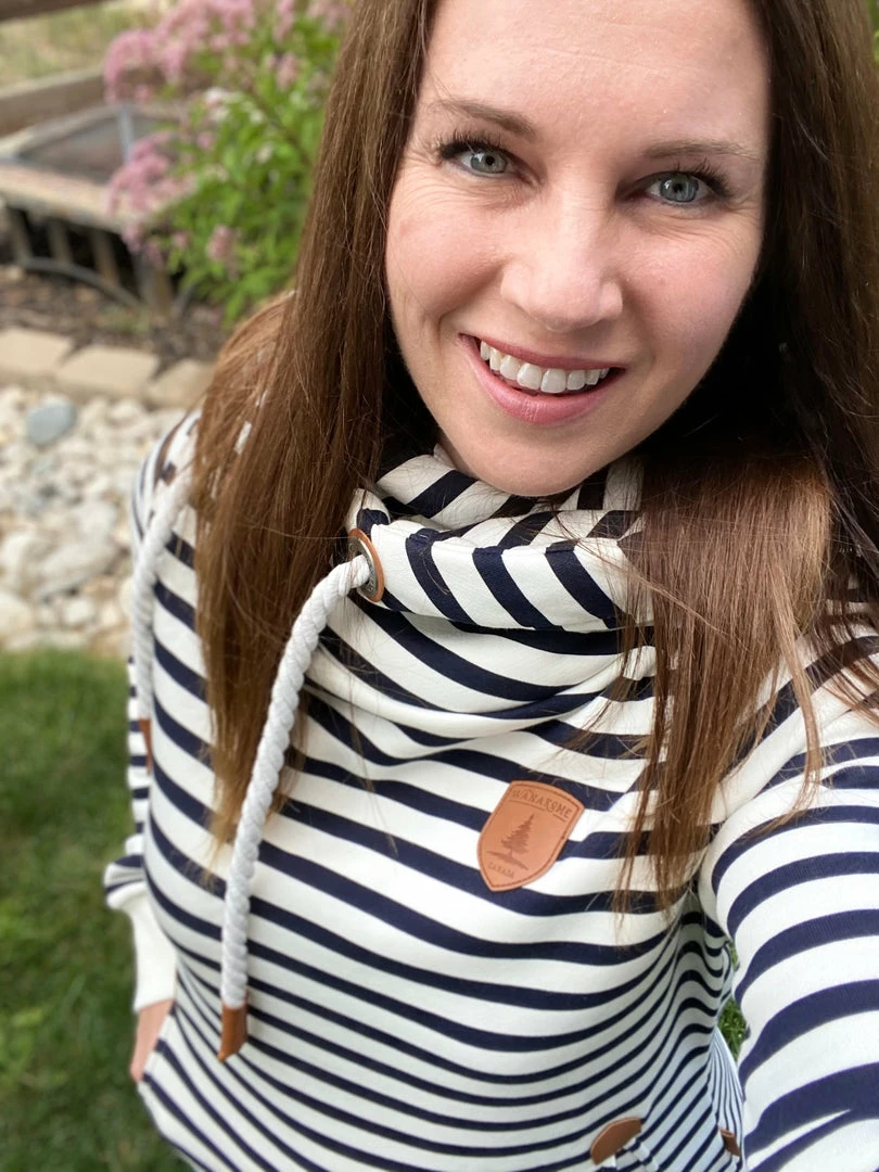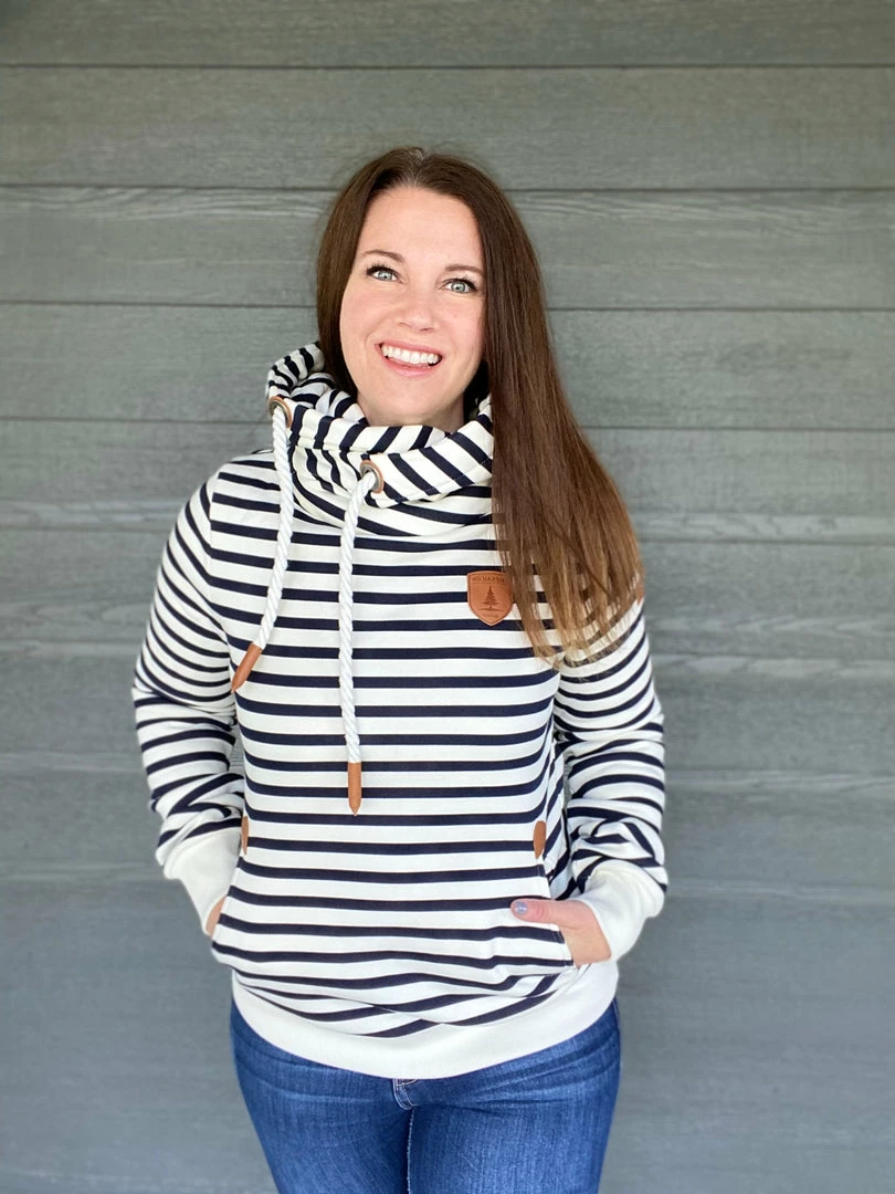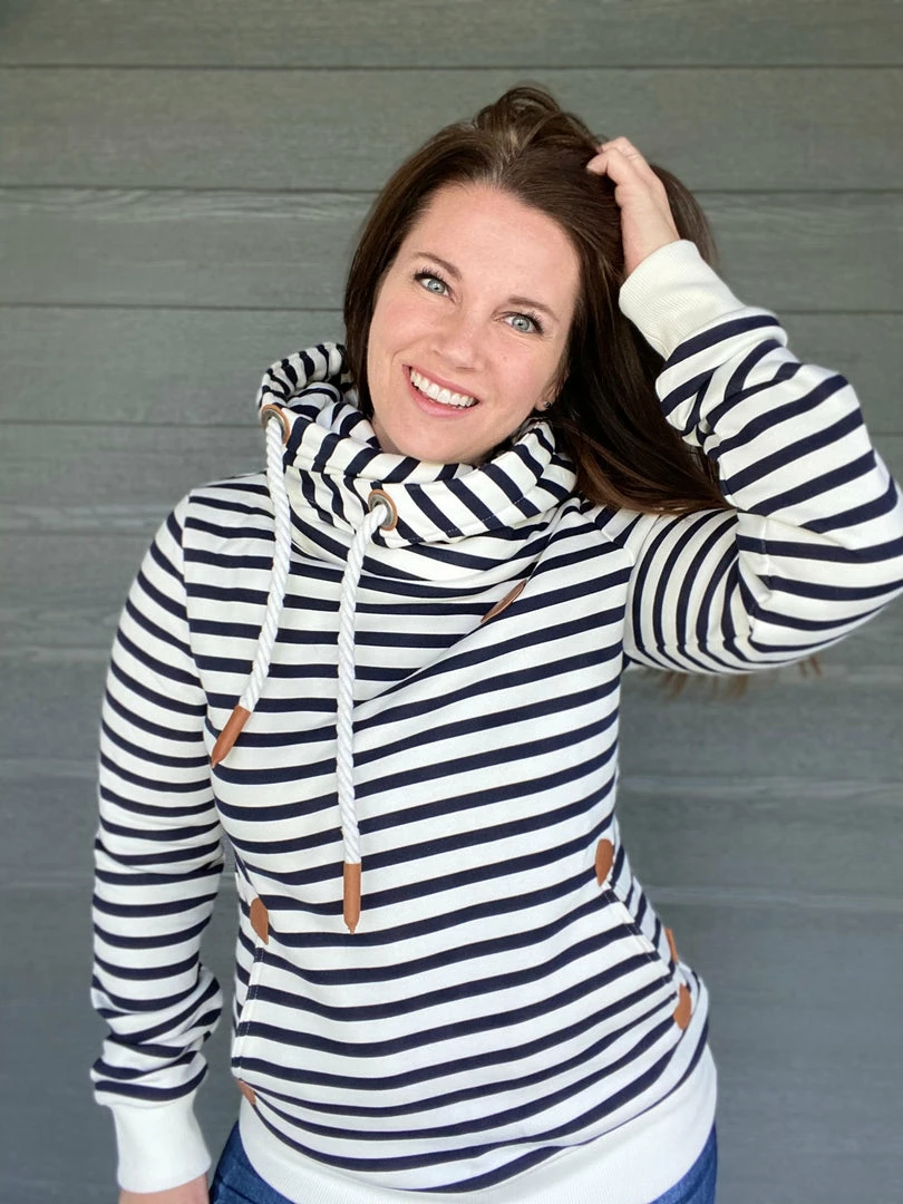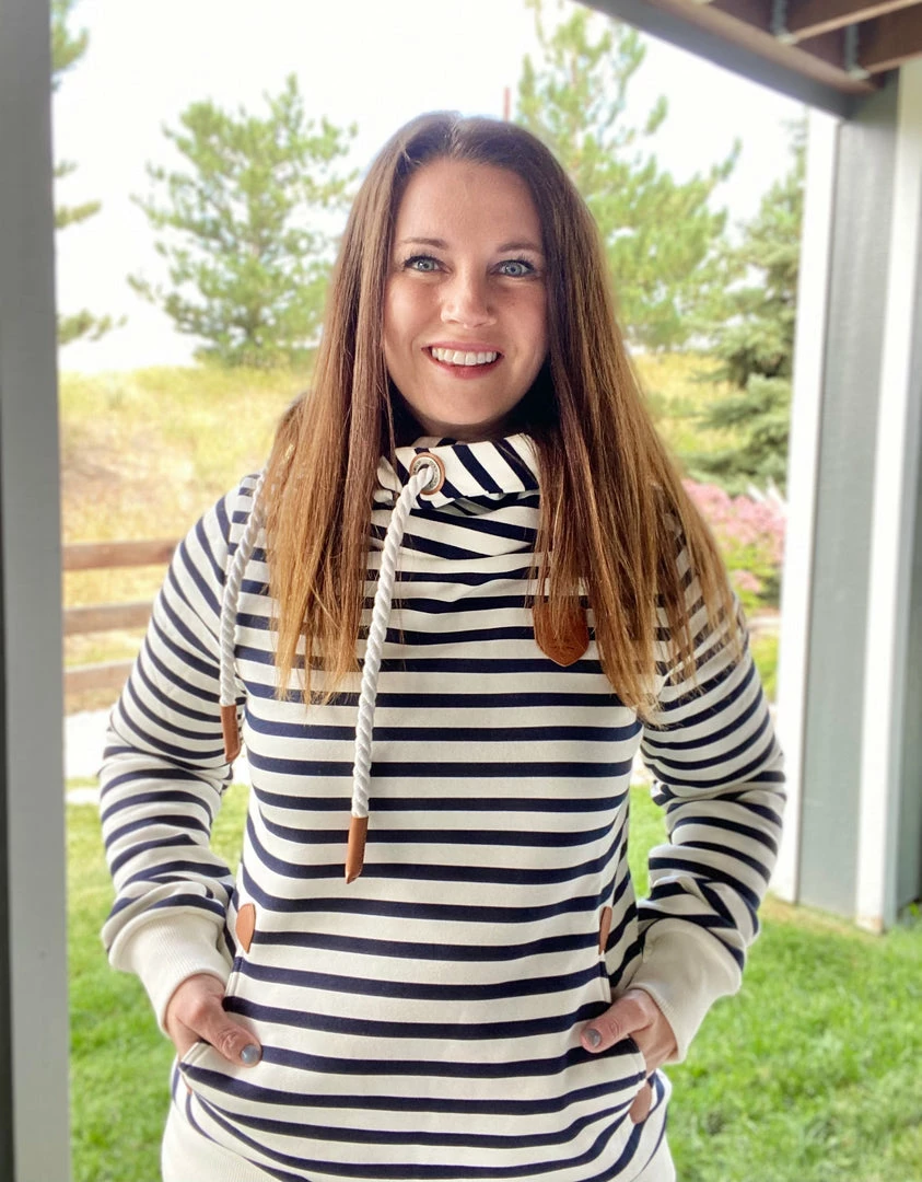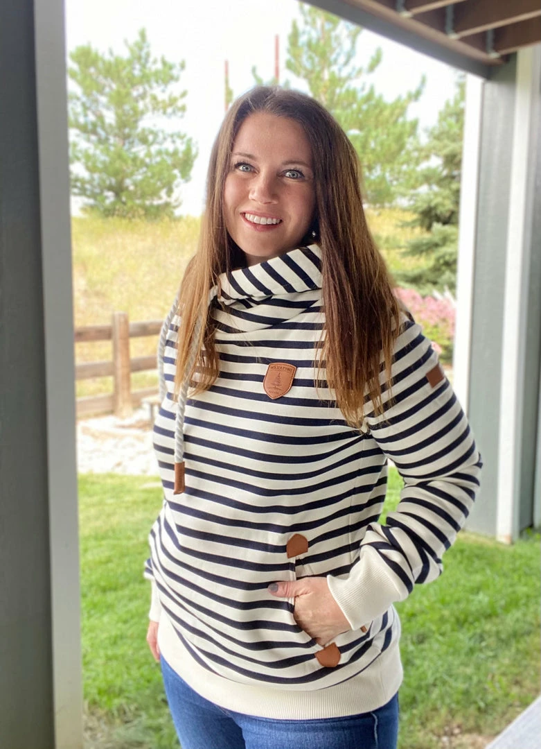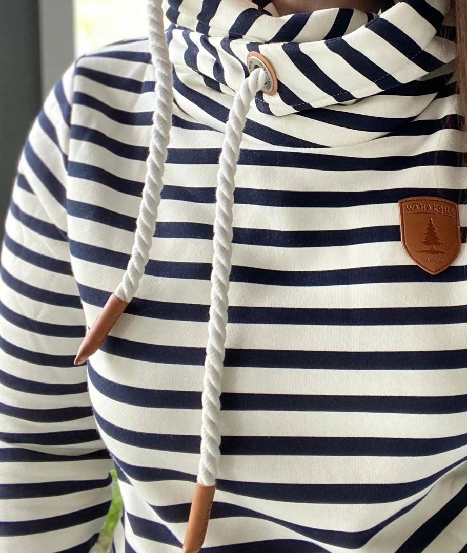 We love these Wanakome hoodies for a good reason. This navy and ivory striped hoodie features rope drawstrings, kangaroo pocket and all the little details. True to size. Medium stretch. Model is wearing a size small. 85% cotton, 15% polyester.