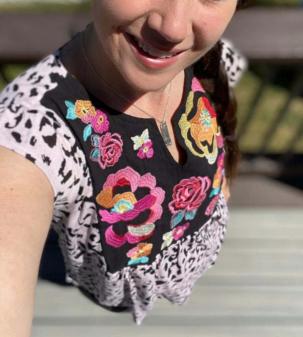 Lots of personality in this leopard print top with floral embroidery. Dress it up or down. ย Non sheer. Relaxed fit. 100% rayon.