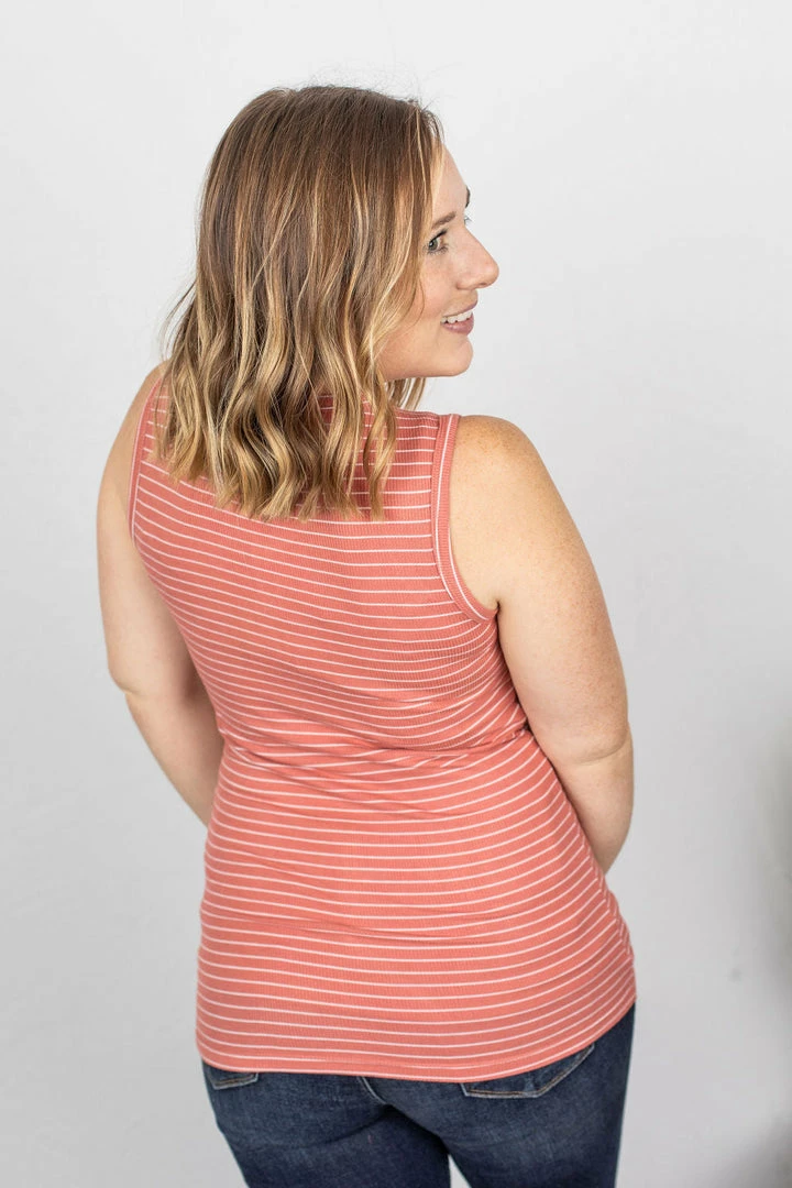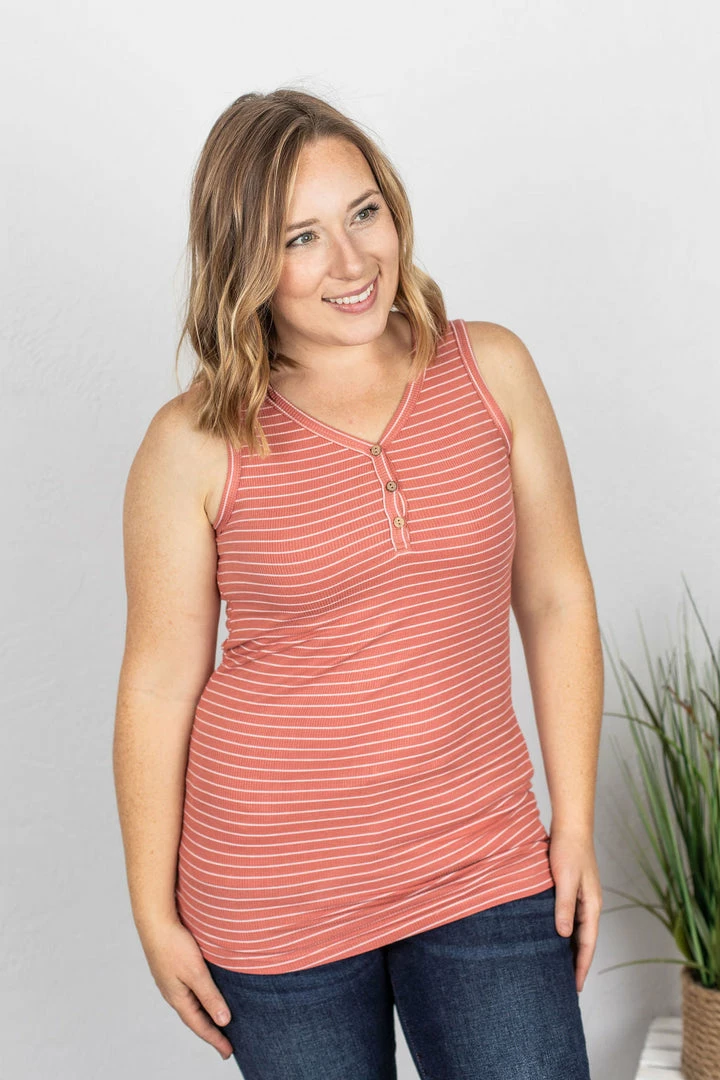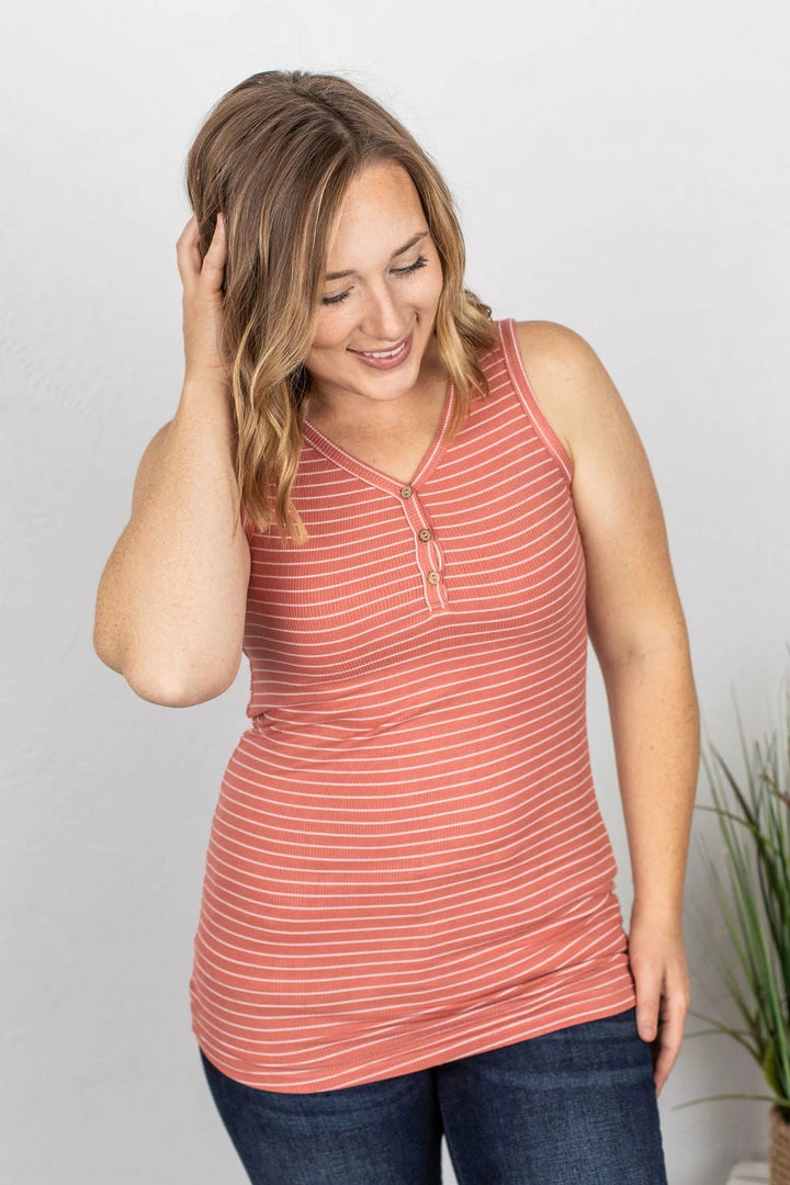 Promo 🌟 Michelle Mae Addison Henley Tank – Dark Pink W/White Stripes SHORT SLEEVES 🎁