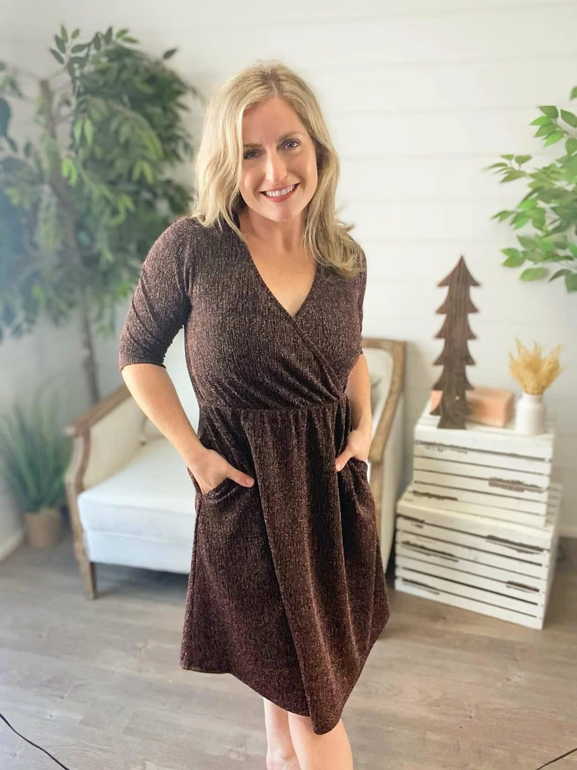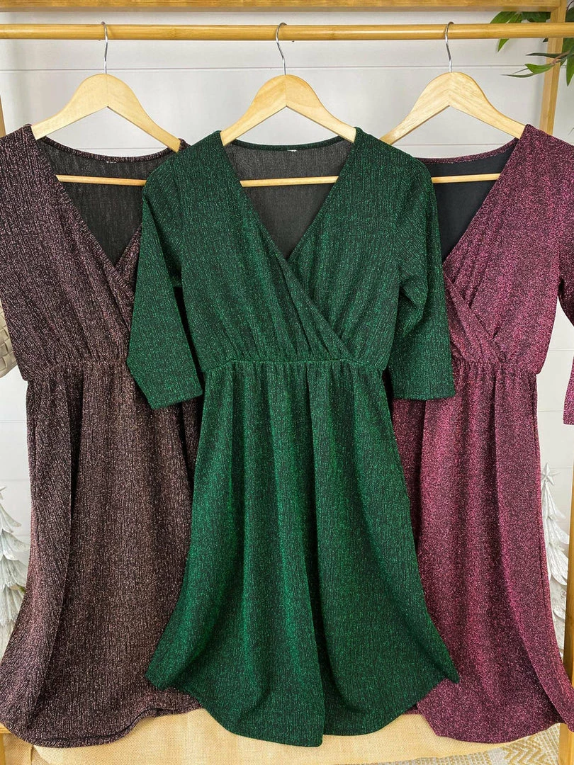 She’s aย classic, yet a little flirty. This 3/4 sleeve faux wrap, midi dress is sure to be a favorite for any occasion. New sparkle version that you will be choosing for all your holiday events! Christmas, new years, family photos and more! We are SO in love!