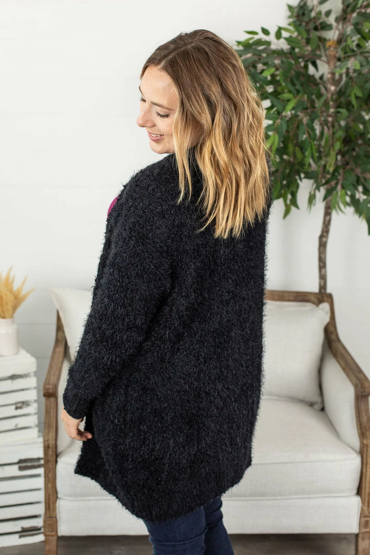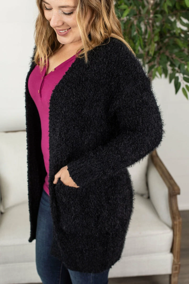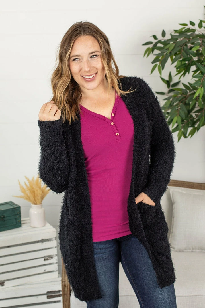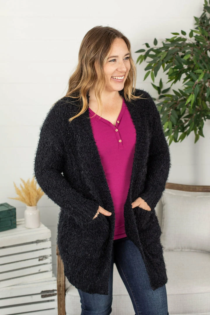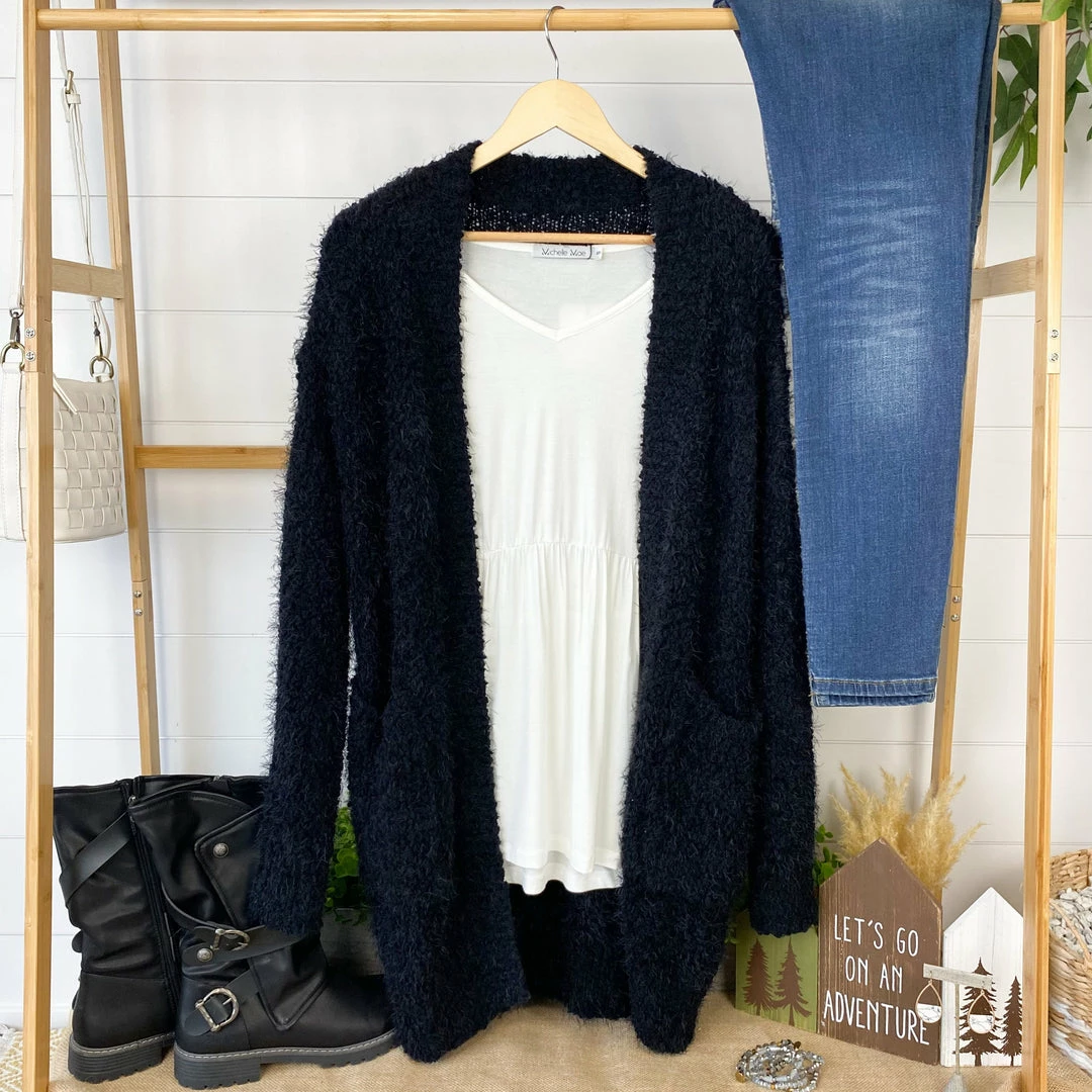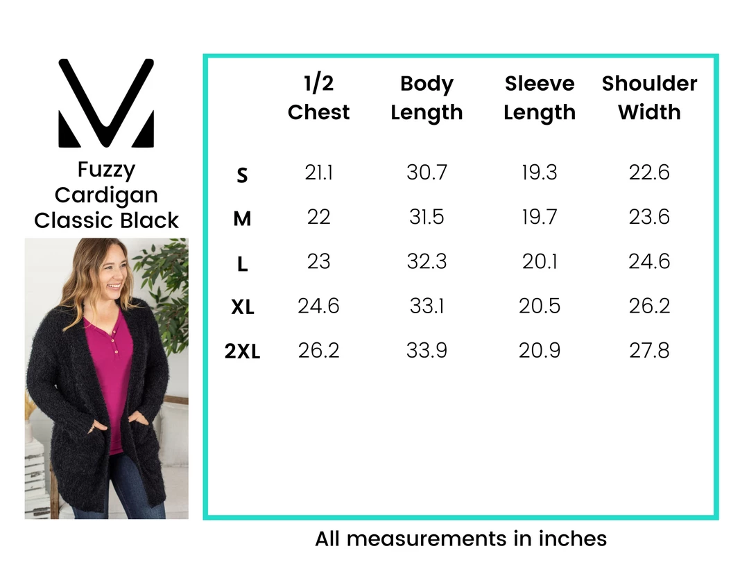 Okay, this is the SOFTEST cardigan ever! These have really good stretch, and fit a tad oversized by design (model liked her usual size, size small shown here). The fabric has good weight to it, and it runs bigger than our other fuzzy cardigans (VERY stretchy).