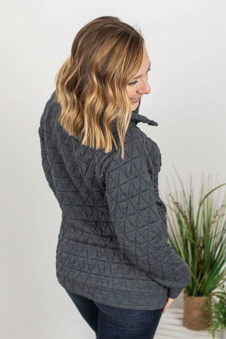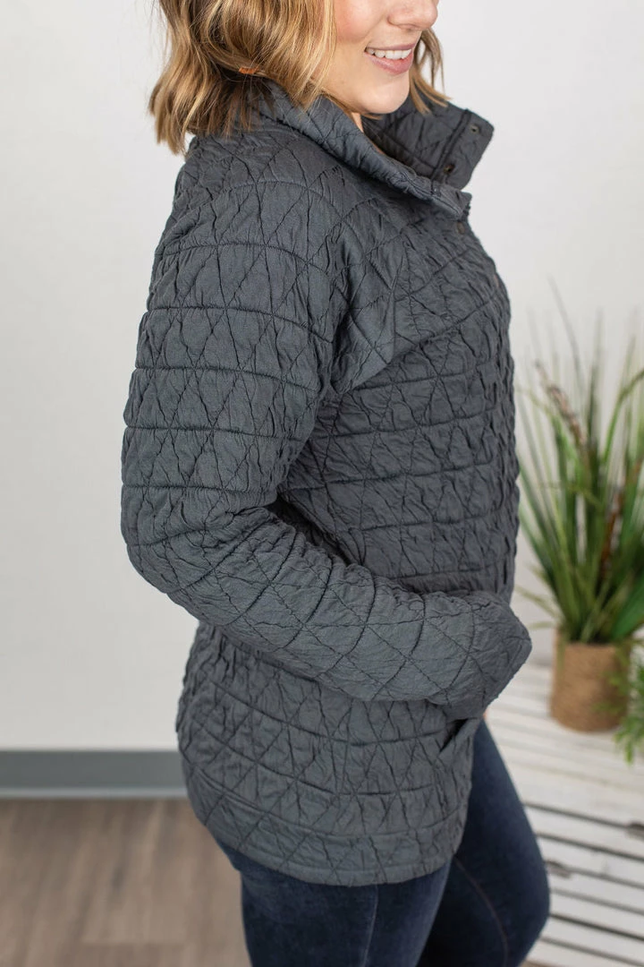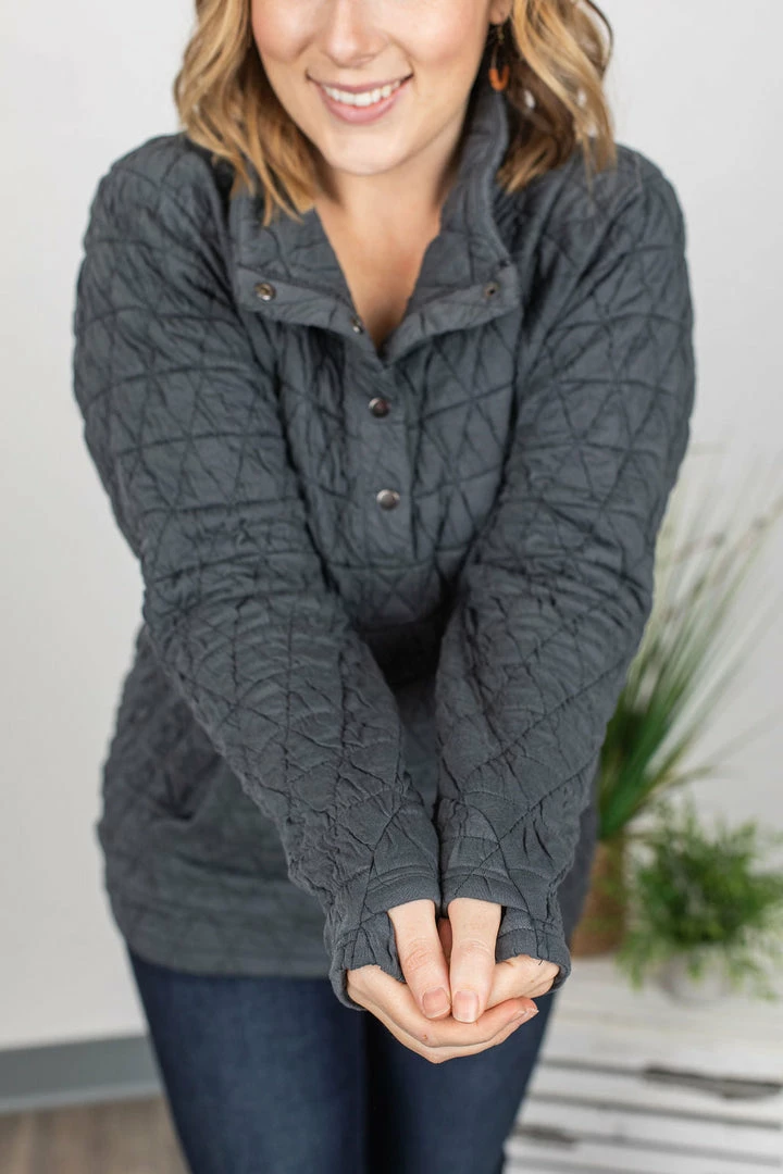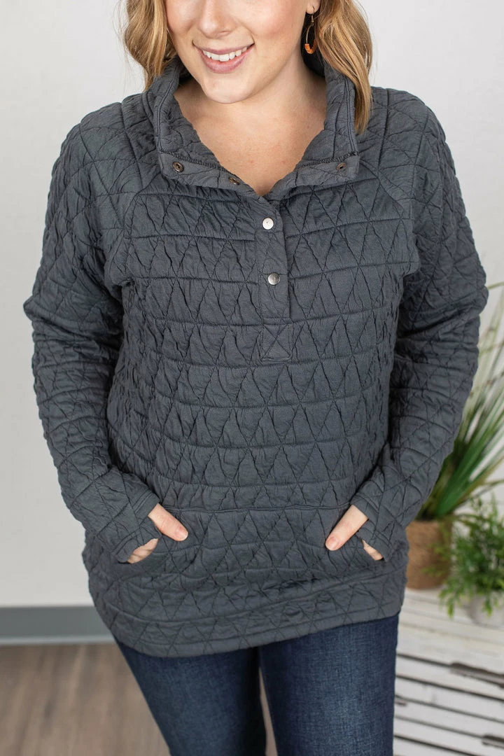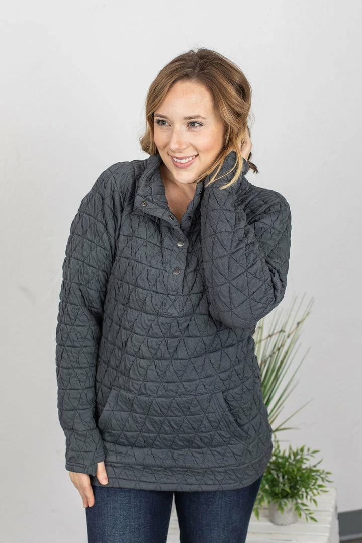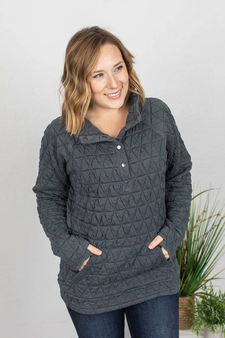 This pullover is so soft! Stunning quilted fabric with button snap details, as well as thumbholes and a kangaroo pocket! Feels like a cloud!