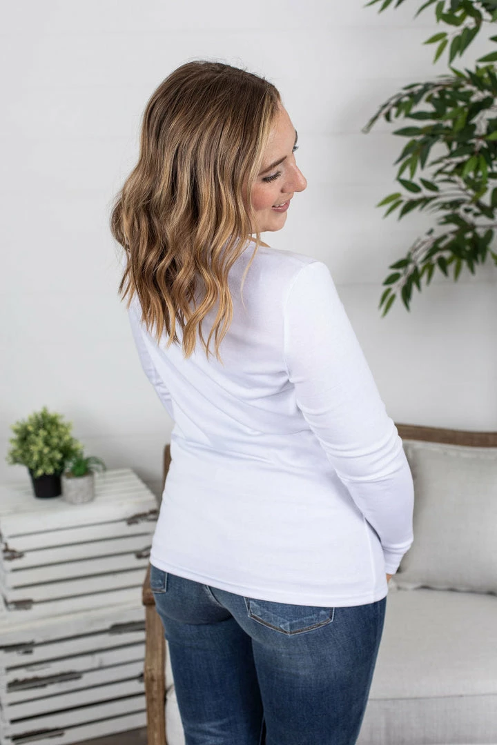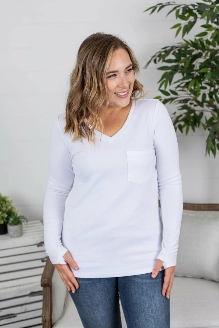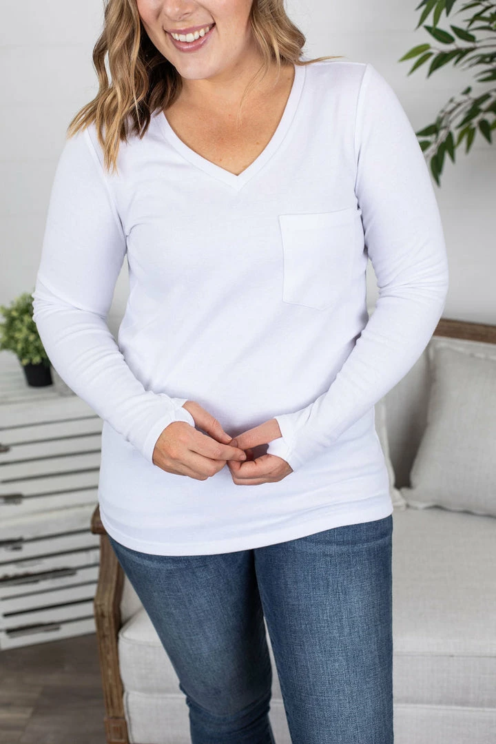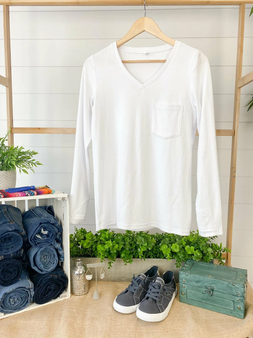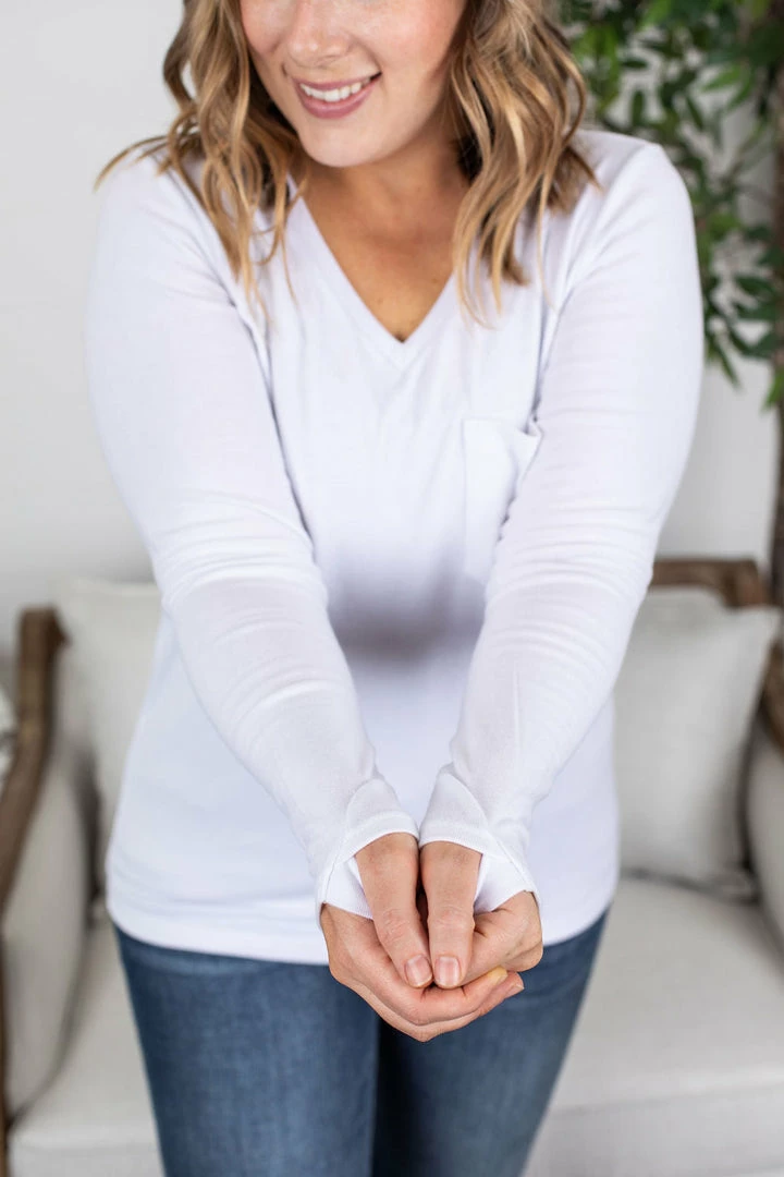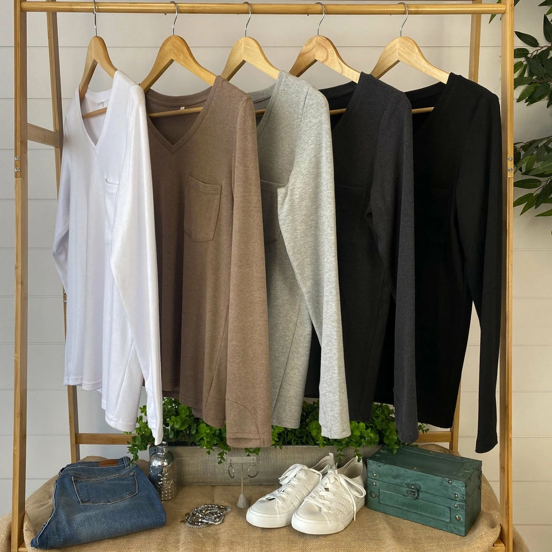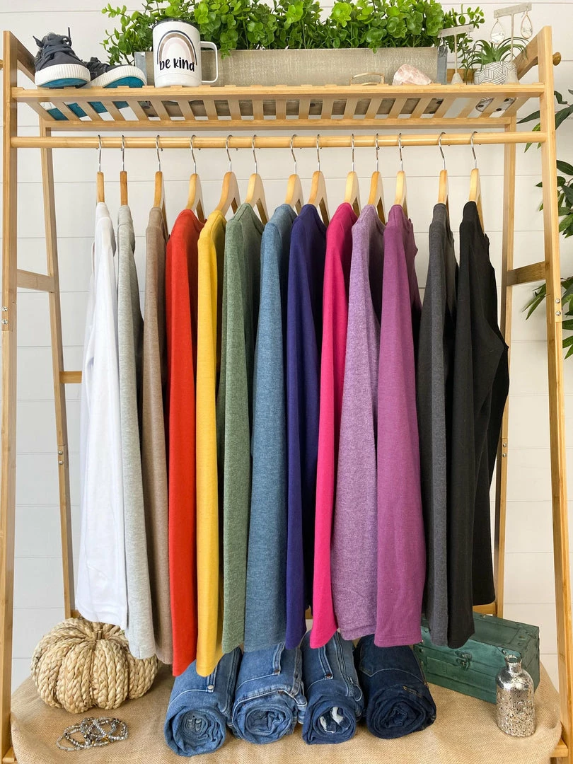 The perfect long sleeve pocket top! Amazing fabric that is warm and sure to keep you cozy during the cooler weather. These also make the perfect pairing for any vest and are super easy to layer! The are VERY soft and stretchy too, plus they have a front pocket as well as thumbholes – which we think is the perfect combination!