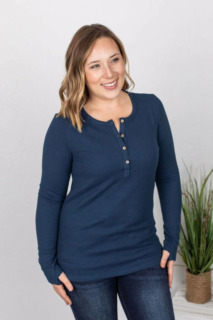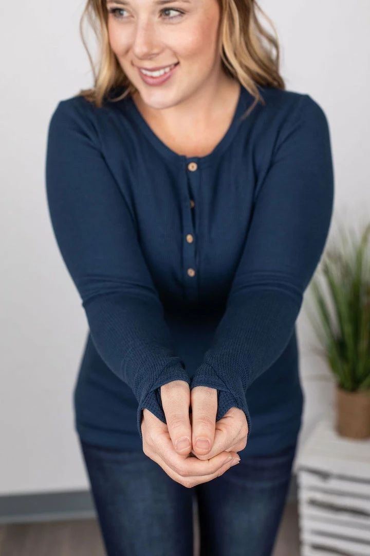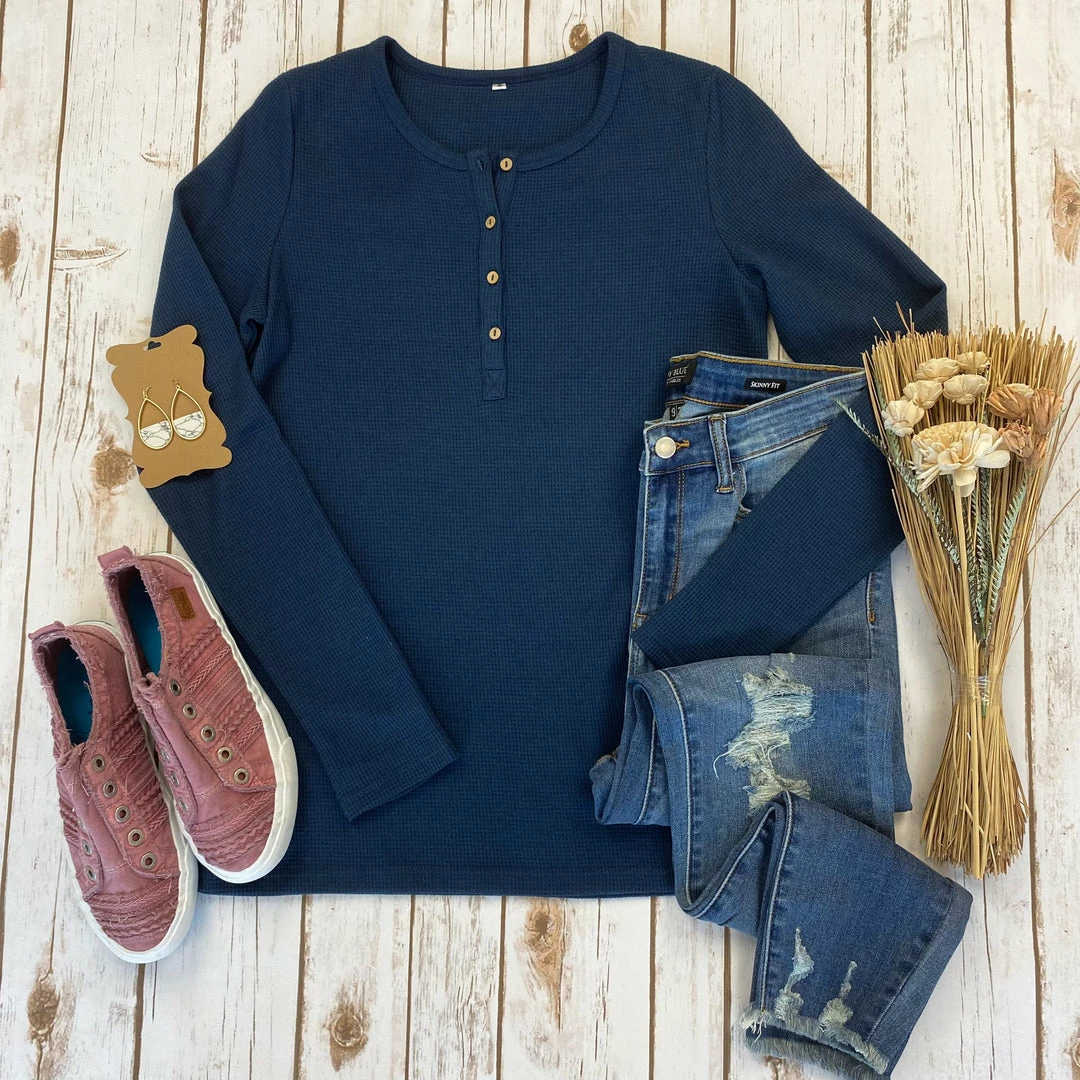 The perfect long sleeve Henley top! Amazing fabric that is warm and sure to keep you cozy during the cooler weather. These also make the perfect pairing for any vest and are super easy to layer! They feature functioning wood buttons as well as thumbholes – which we think is the perfect combination!