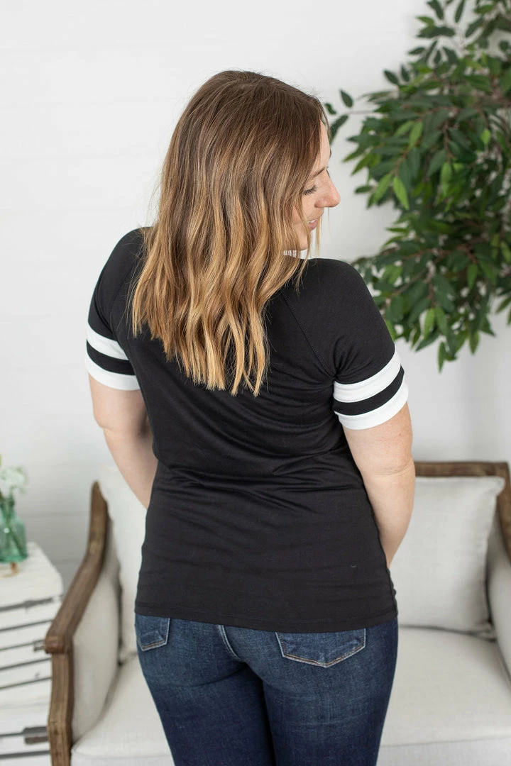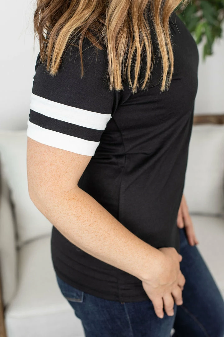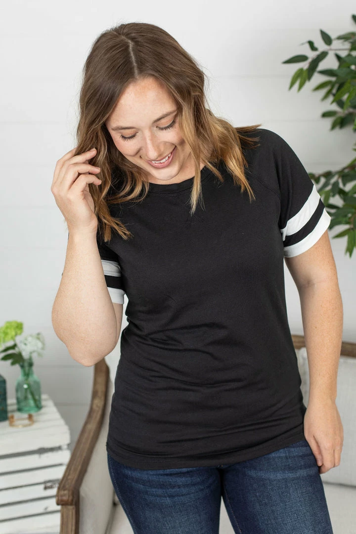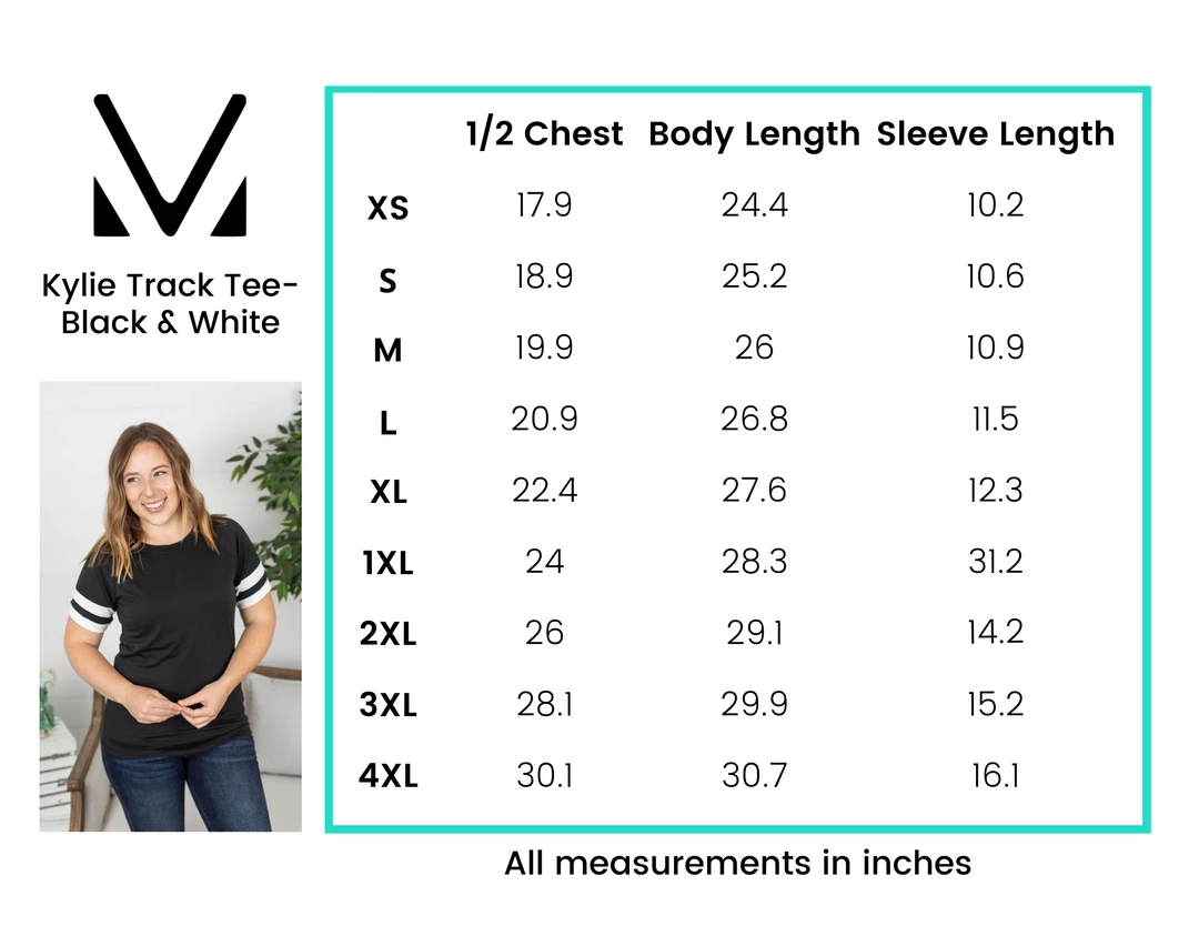 Meet Kylie! This fabric is lightweight and breathable, and highly stretchy! It has a classic crew neck with extra stithcing detail, two track stripes on each arm, and overall classic fit and feel of your new go-to comfy tee!ย