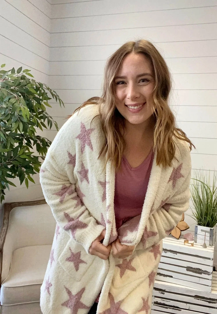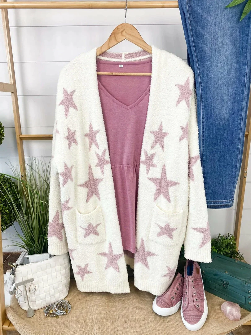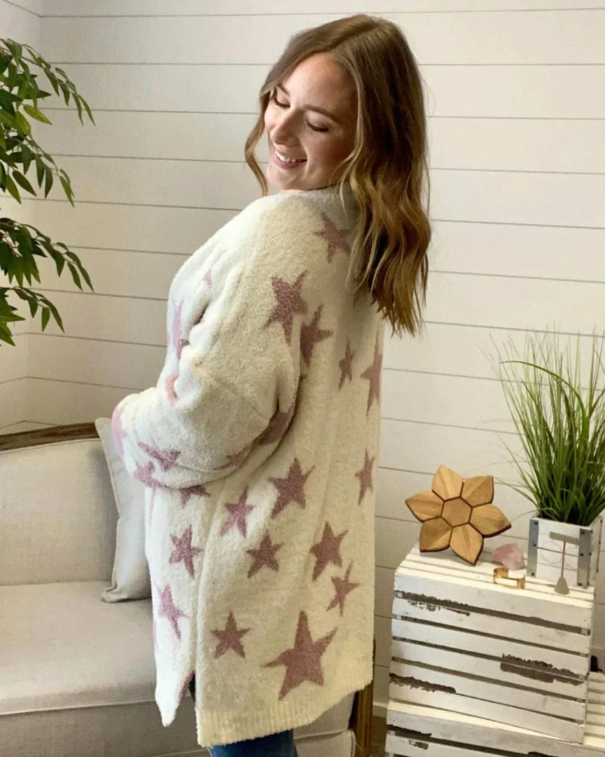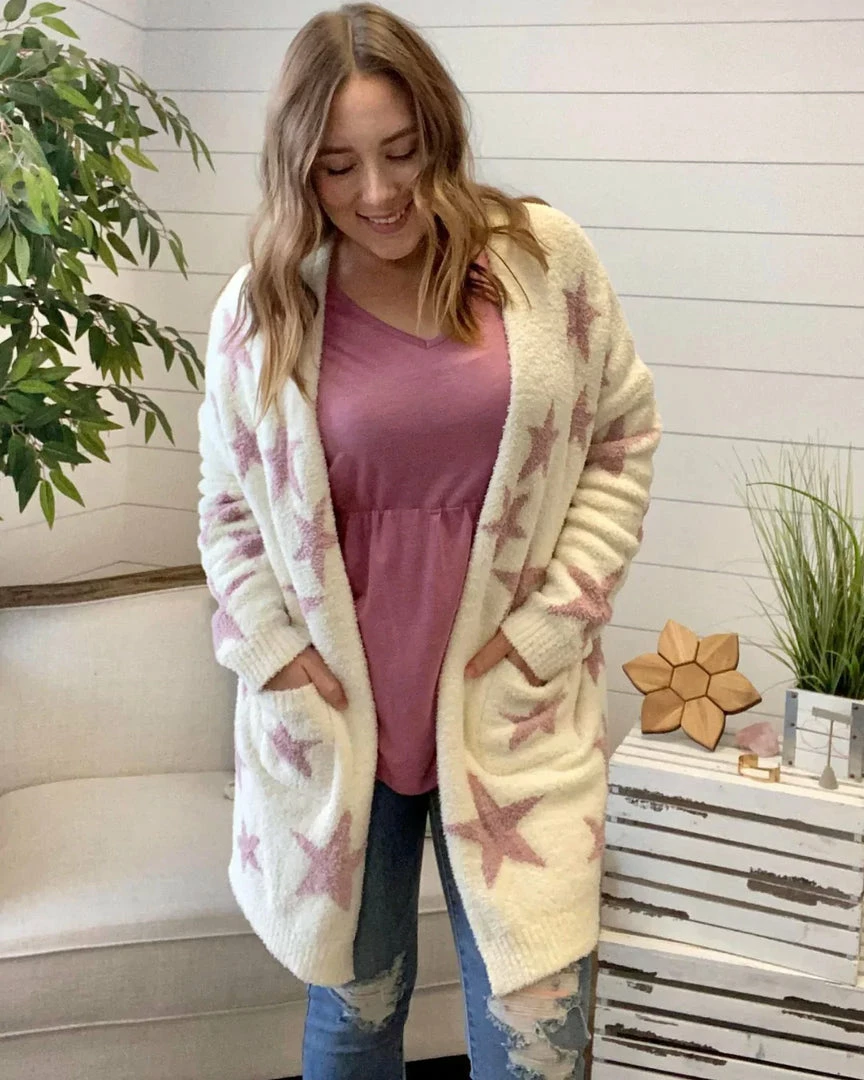 Okay, this cardigan is SOFT (like our best selling blankets)! These have really good stretch, and fit a tad oversized by design (model liked her usual size,). The fabric has good weight to it,Β making it extra cozy!Β