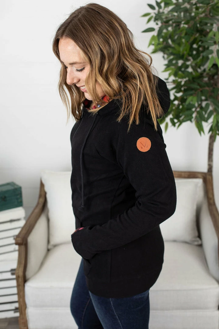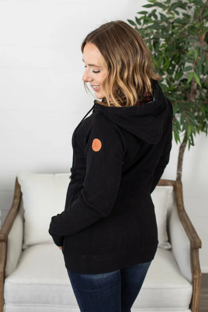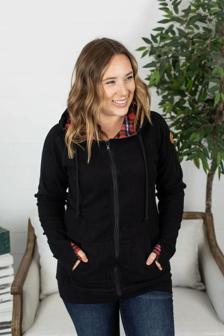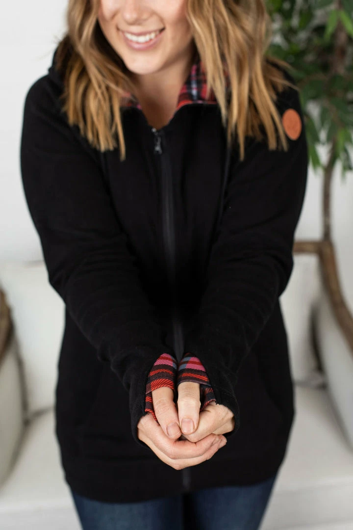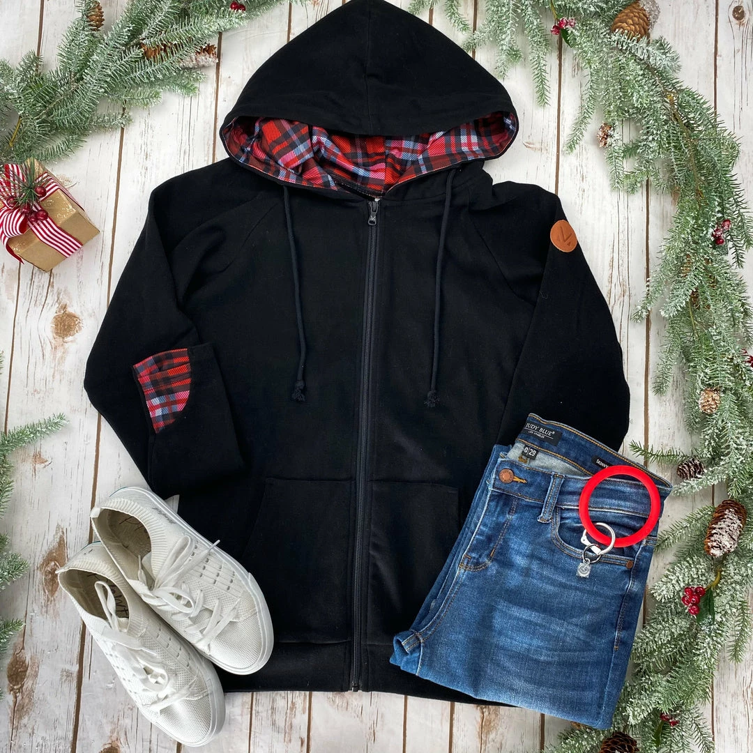 This fullzip sweatshirt is made with your favorite, triple-stretch fabric!Β Classic front zipper with a plaid lined interior hood! Pockets (of course), plus accented thumbholes too! These have great stretch and run true to size.Β