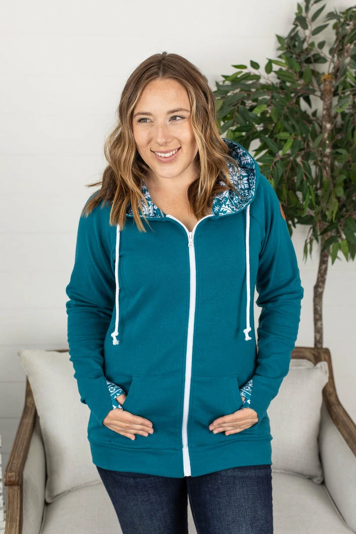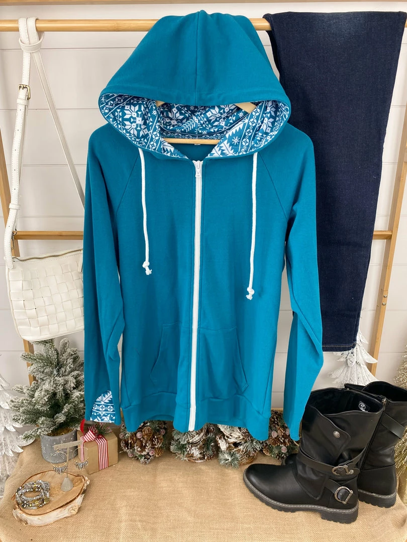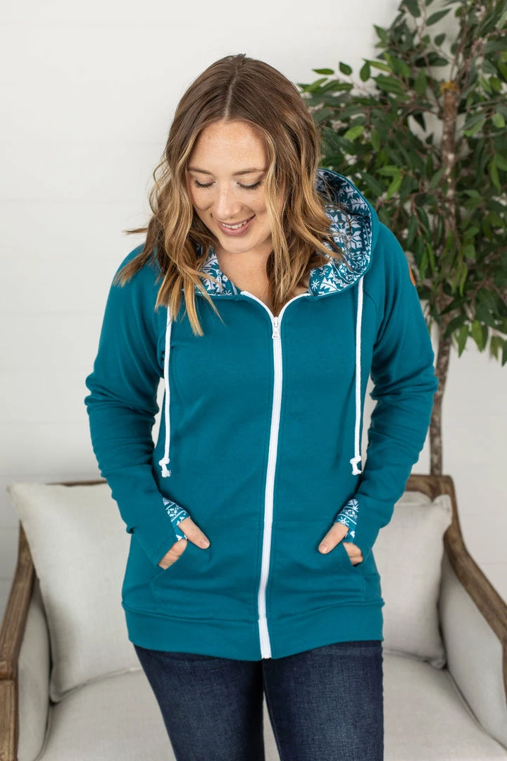 This fullzip sweatshirt is made with your favorite, triple-stretch fabric!Β Classic front zipper (rose gold zipper to boot)Β – with a blush color lined interior hood! Pockets (of course), plus accented thumbholes too! These have great stretch and run true to size.Β