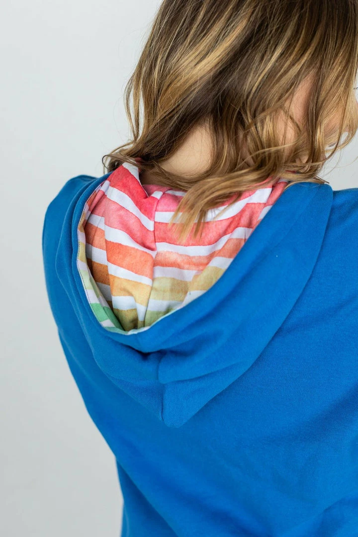 Your favorite triple stretch fabric – now in the classic half-zip style! A stunning bright blue with RAINBOW accents! This has a half-zip front, kangaroo pocket, and thumbholes!
