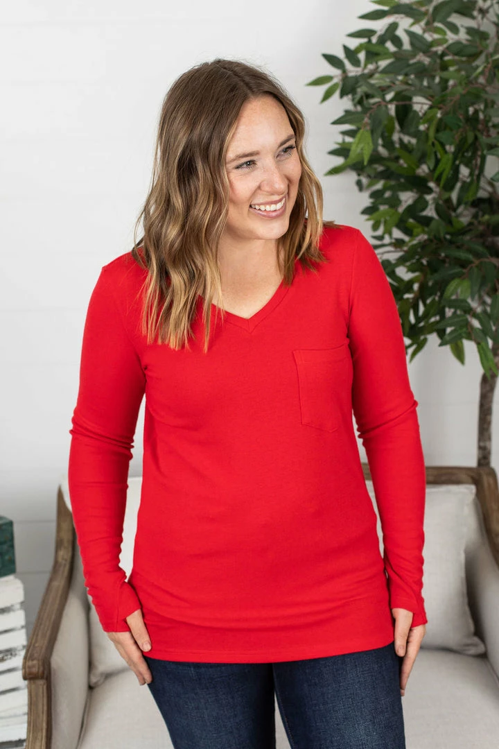 The perfect long sleeve pocket top! Amazing fabric that is warm and sure to keep you cozy during the cooler weather. These also make the perfect pairing for any vest and are super easy to layer! The are VERY soft and stretchy too, plus they have a front pocket as well as thumbholes – which we think is the perfect combination!
