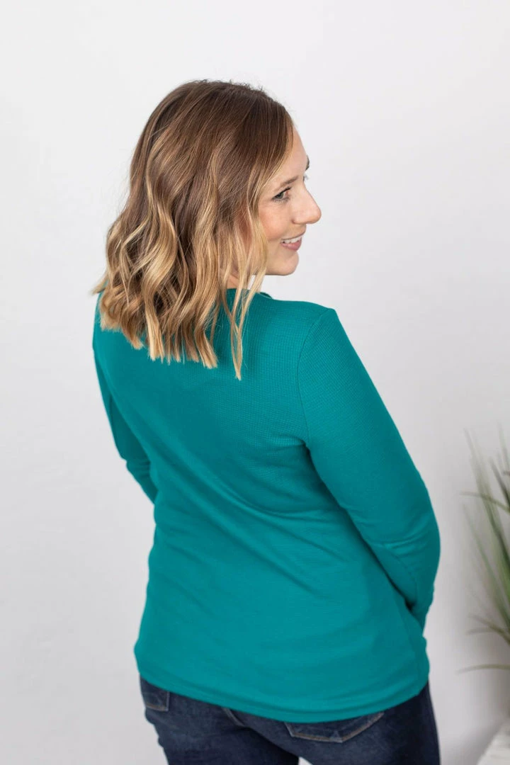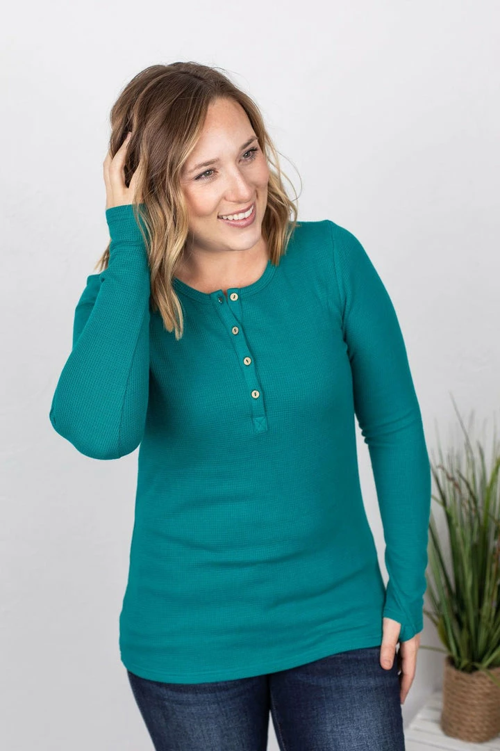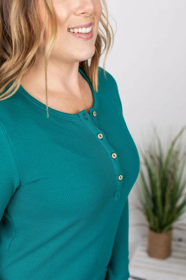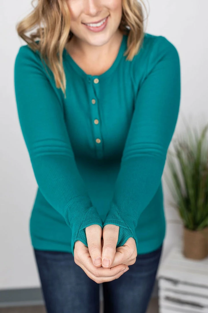The perfect long sleeve Henley top! Amazing fabric that is warm and sure to keep you cozy during the cooler weather. These also make the perfect pairing for any vest and are super easy to layer! They feature functioning wood buttons as well as thumbholes – which we think is the perfect combination!