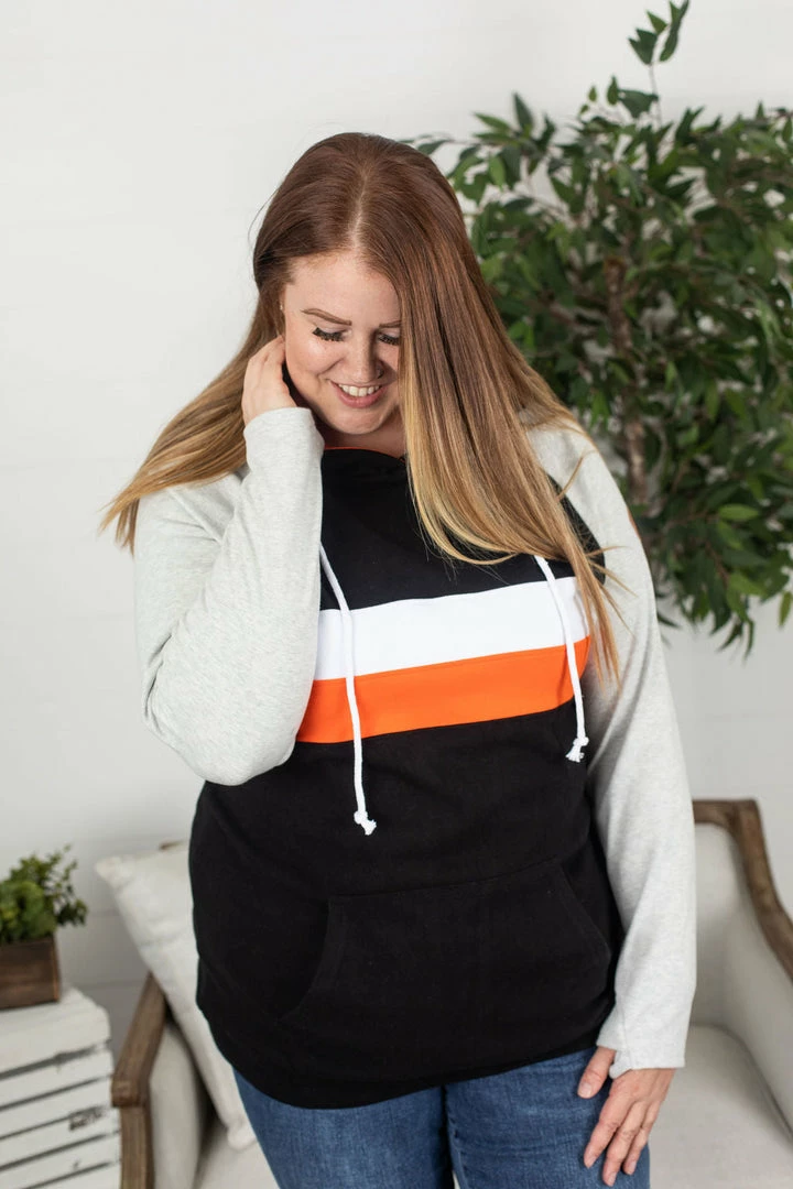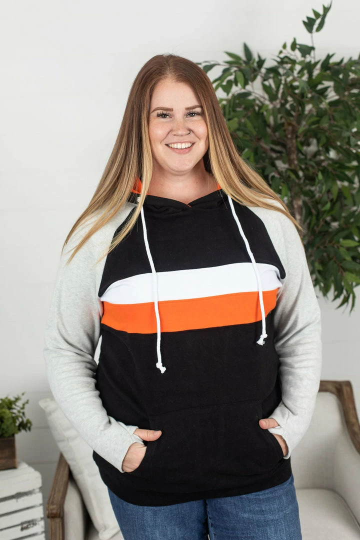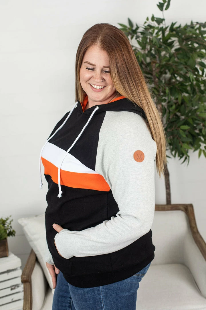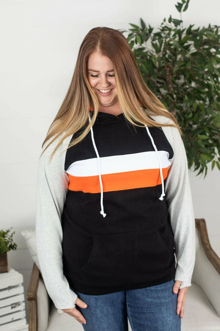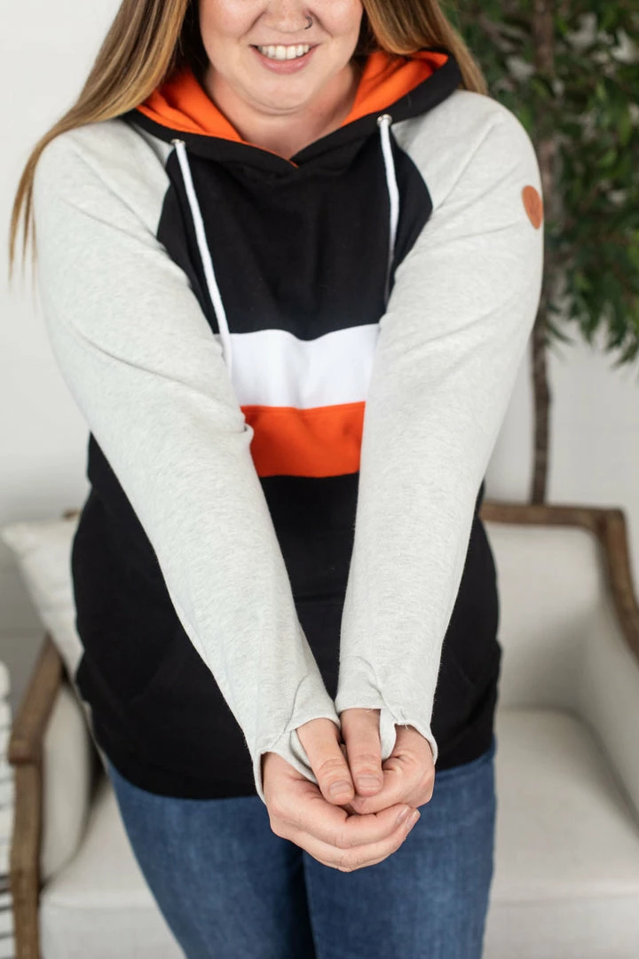 Get ready to get cozy! The Ryan features your favorite triple stretch fabric, a single-hood design with coordinating interior lined hood, centered neck detailing, front kangaroo pocket, thumbholes, and fun colorblocking design as well, and accent strings!
