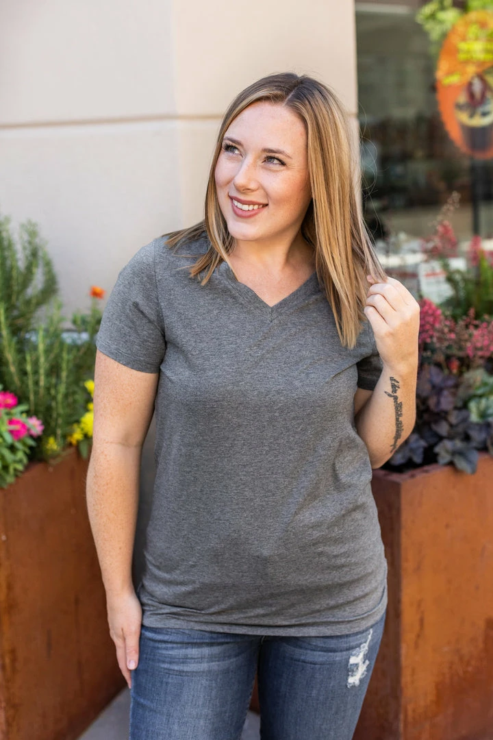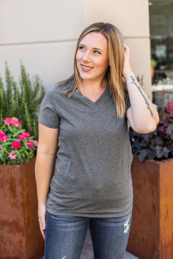 Finally, the PERFECT tee! This fabric is luxurious and amazing! Thicker but not too thick, stretchy, and runs true to size! Plus a cute v-neck that’s not too deep so its flattering on everyone! Runs true to size!ย