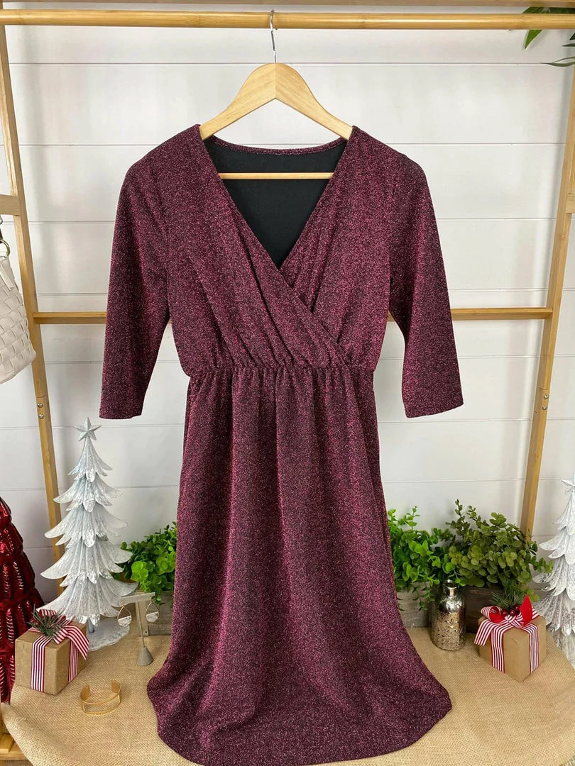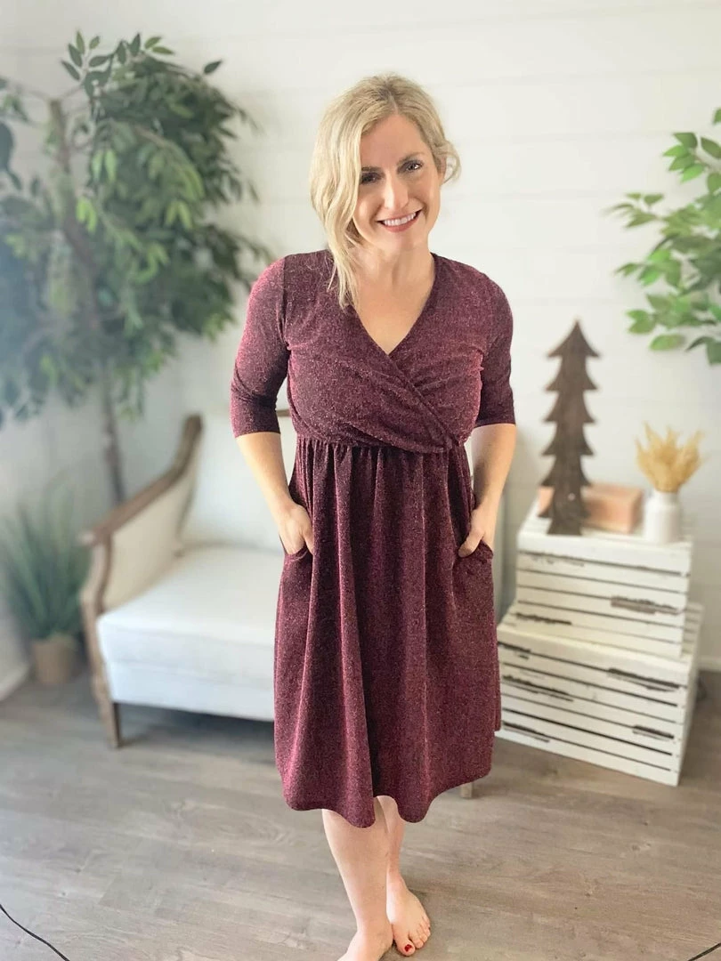 She’s a classic, yet a little flirty. This 3/4 sleeve faux wrap, midi dress is sure to be a favorite for any occasion. New sparkle version that you will be choosing for all your holiday events! Christmas, new years, family photos and more! We are SO in love!