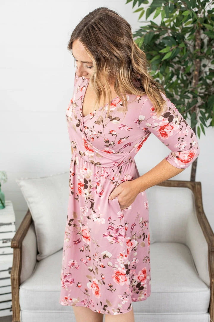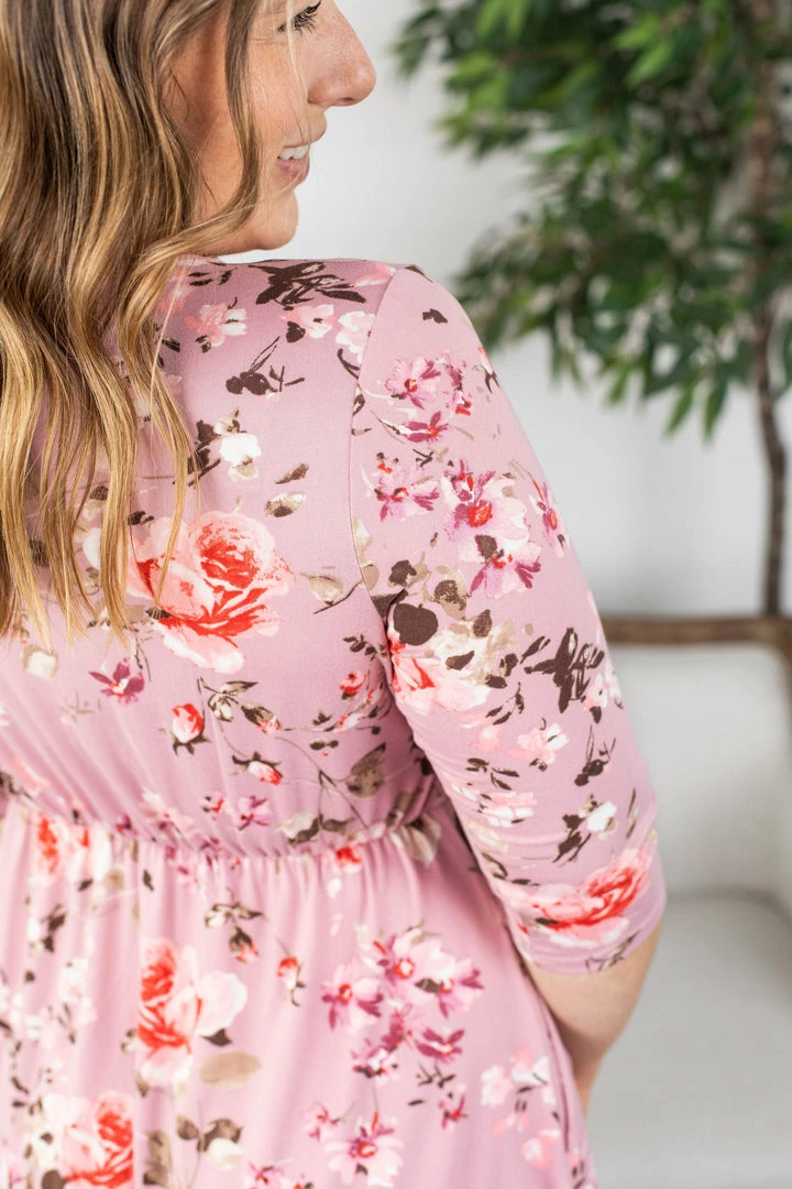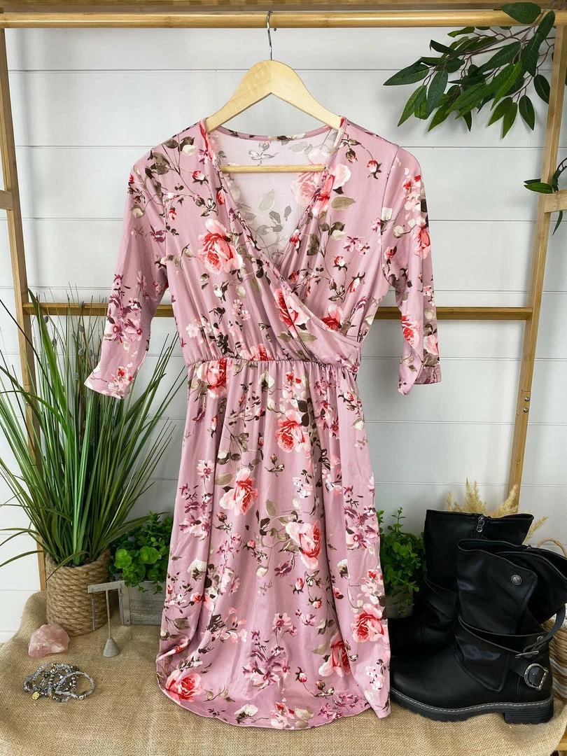 She’s a classic, yet a little flirty. This 3/4 sleeve faux wrap, midi dress is sure to be a favorite for any occasion. She can go from stilettos to cowgirl boots in a flash.