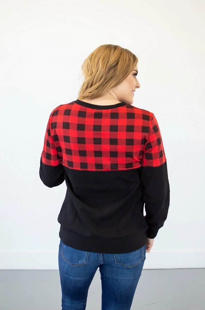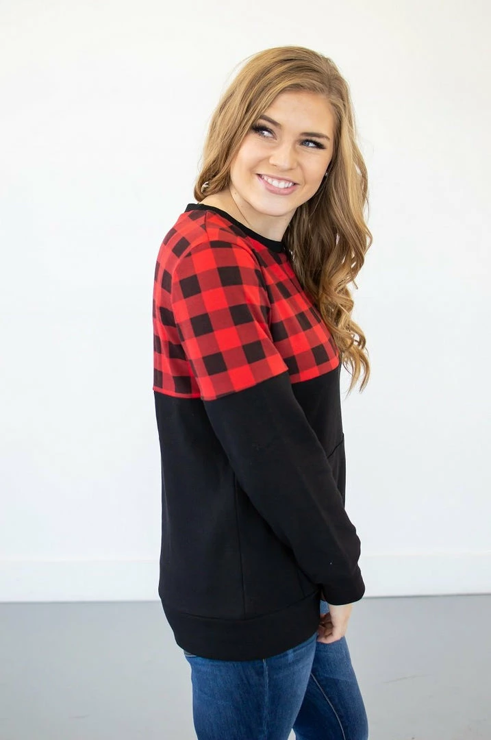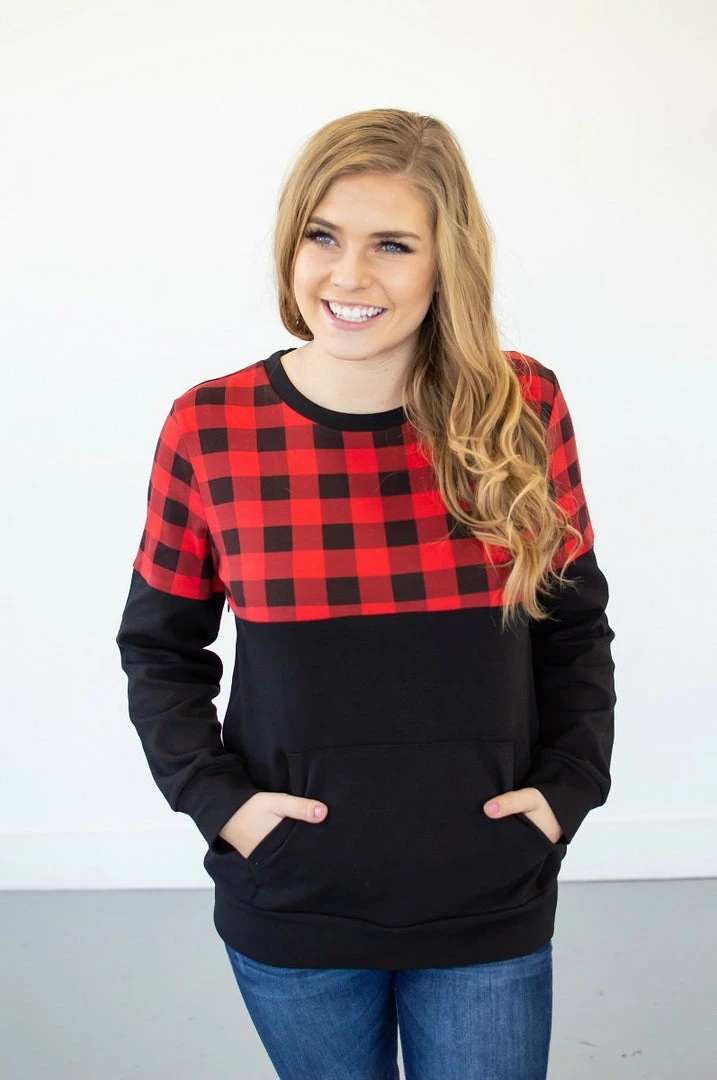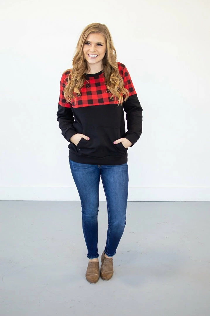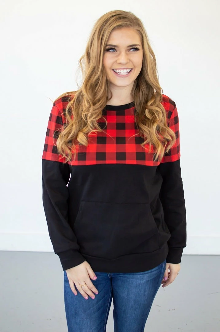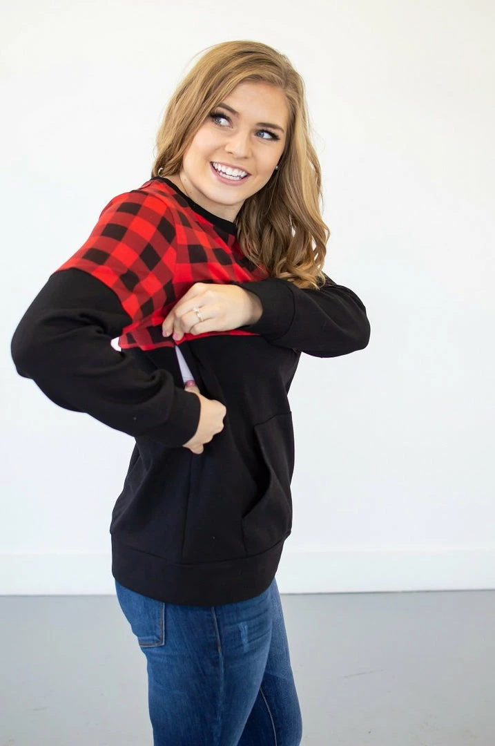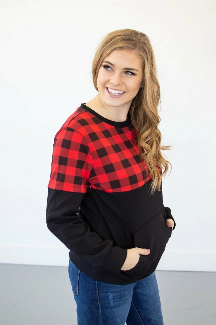 If you have been waiting for a crew neck pullover that is too good to be true…your wait is over! This buffalo plaid crew neck has a kangaroo pocket, the perfect fit, delicious stretch AND it is available in a nursing friendly option! See..we told you she was perfect!!!