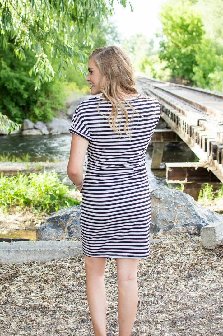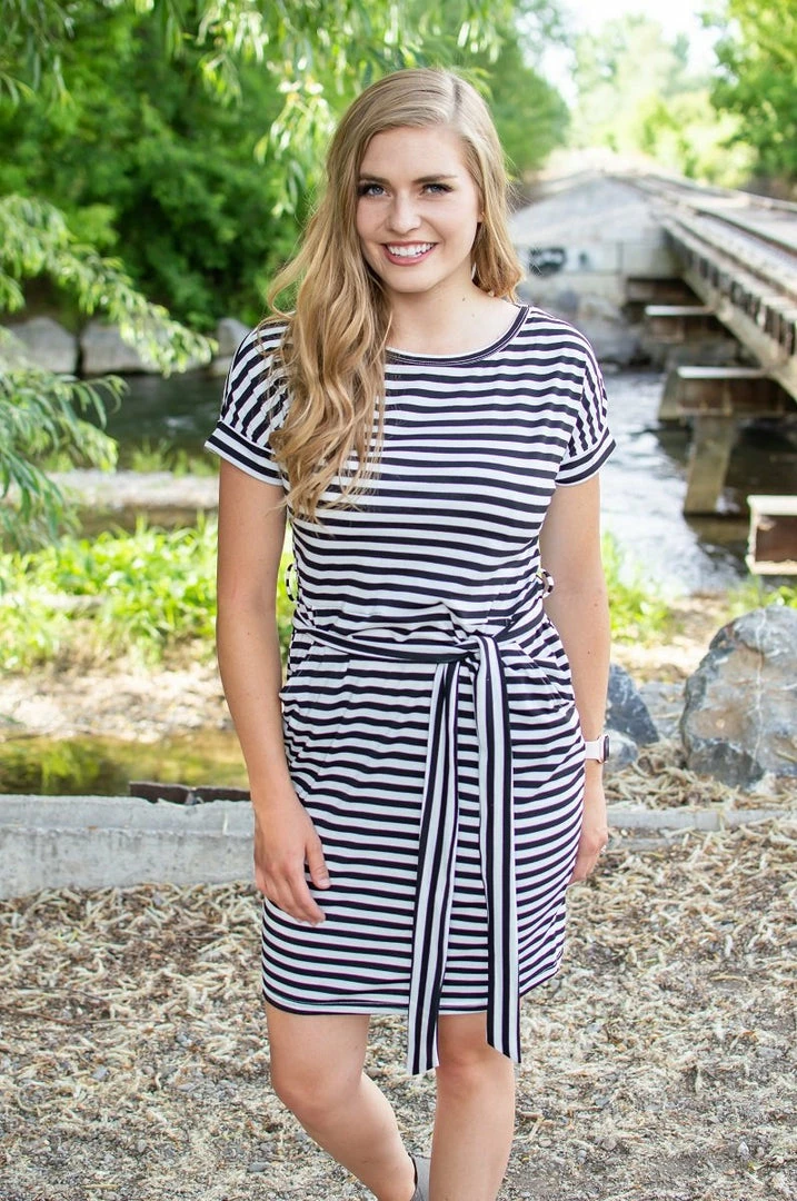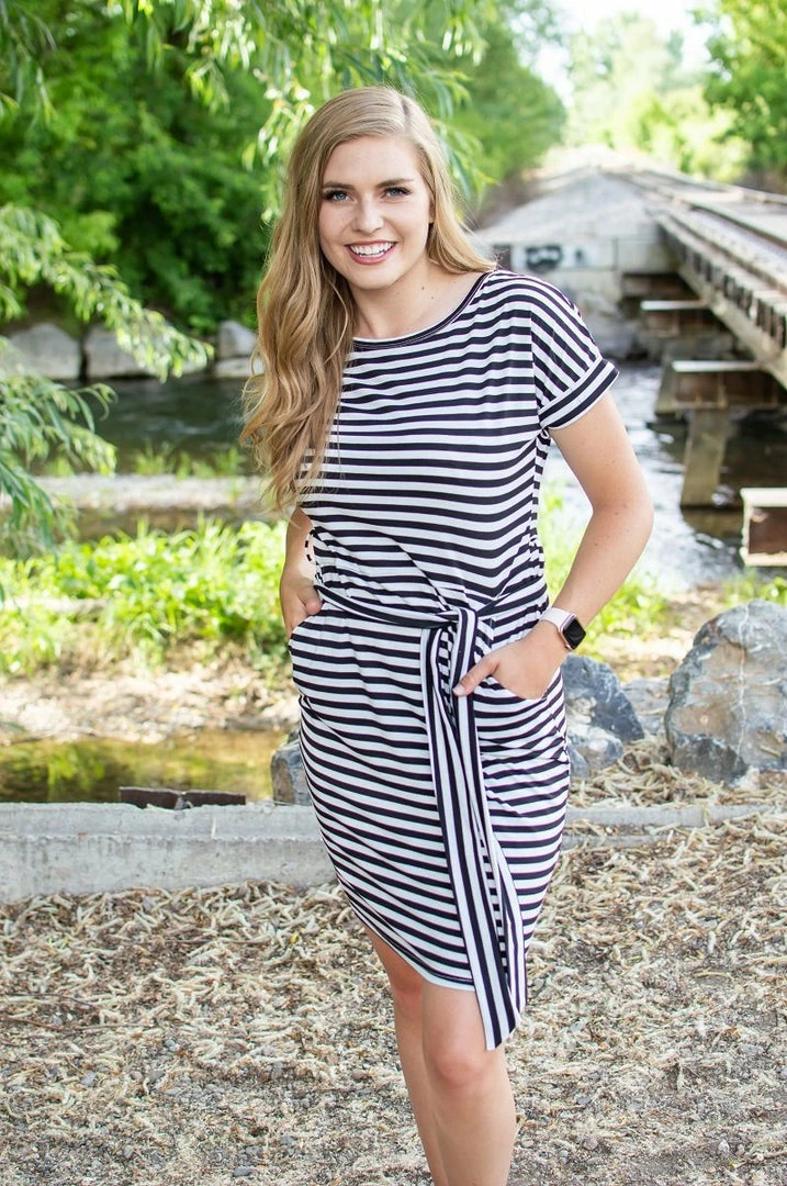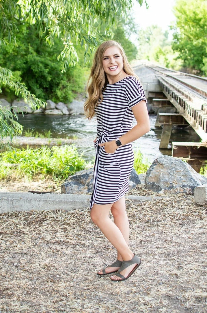 Summer is here, and so is the heat! Beat the heat in this gorgeous striped dress with pockets! The large stripes and perfectly placed belt make this a standout from other “t-shirt dresses”. A dressier look for those nice occasions or a casual look for day to day wear!