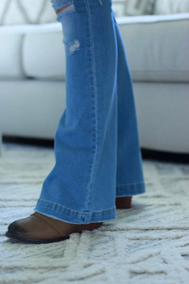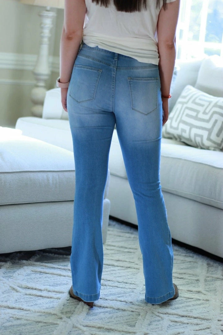 These high waisted flare jeans are perfect for any occasion! The adorable button fly waist and slight distressing gives these the perfect amount of detail for an every day pair of flare jeans! Wear them on a date or on a casual outing!