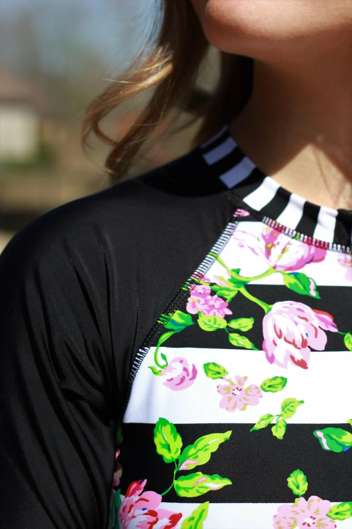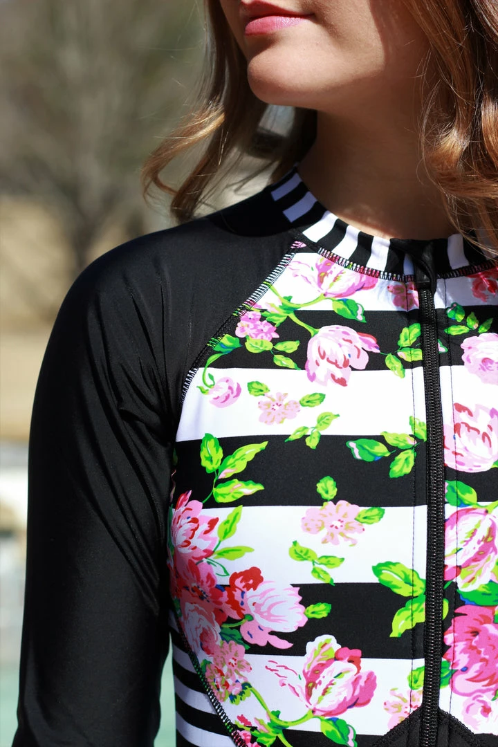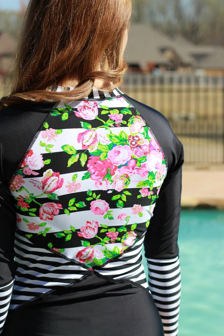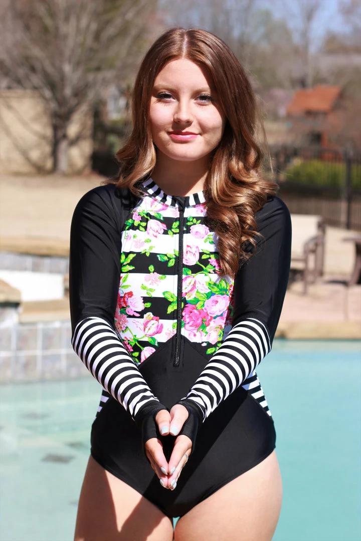 It’s unique, its gorgeous, and its amazingly flattering and comfortable! Stand out this year at the pool, beach or wherever your vacation might take you with this gorgeous Floral and Striped Long Sleeve Swimsuit!