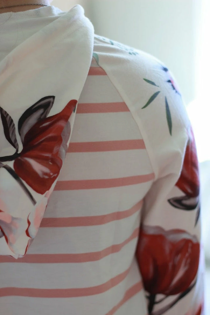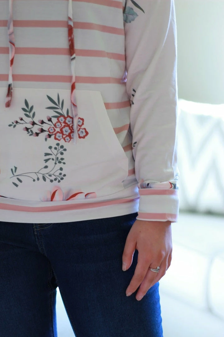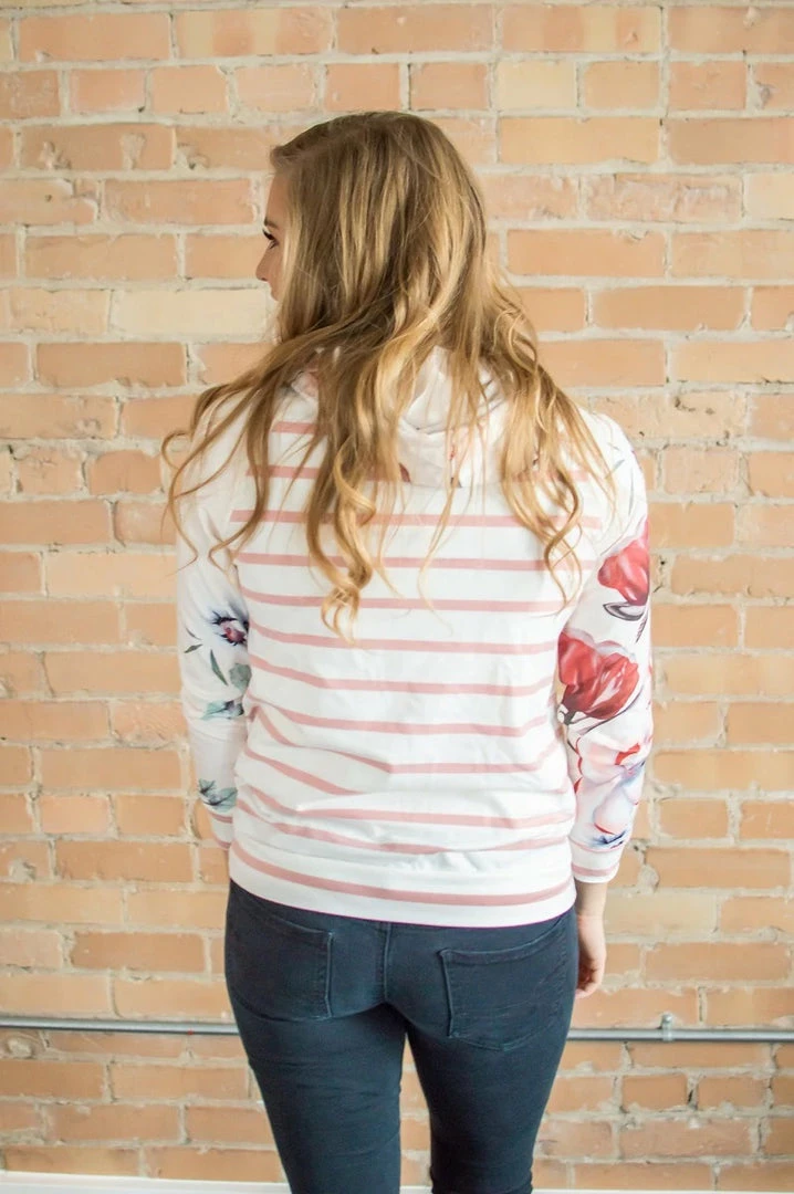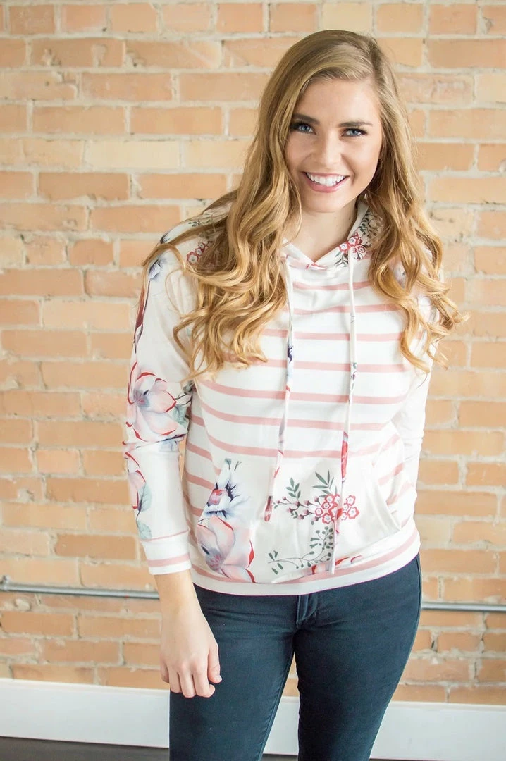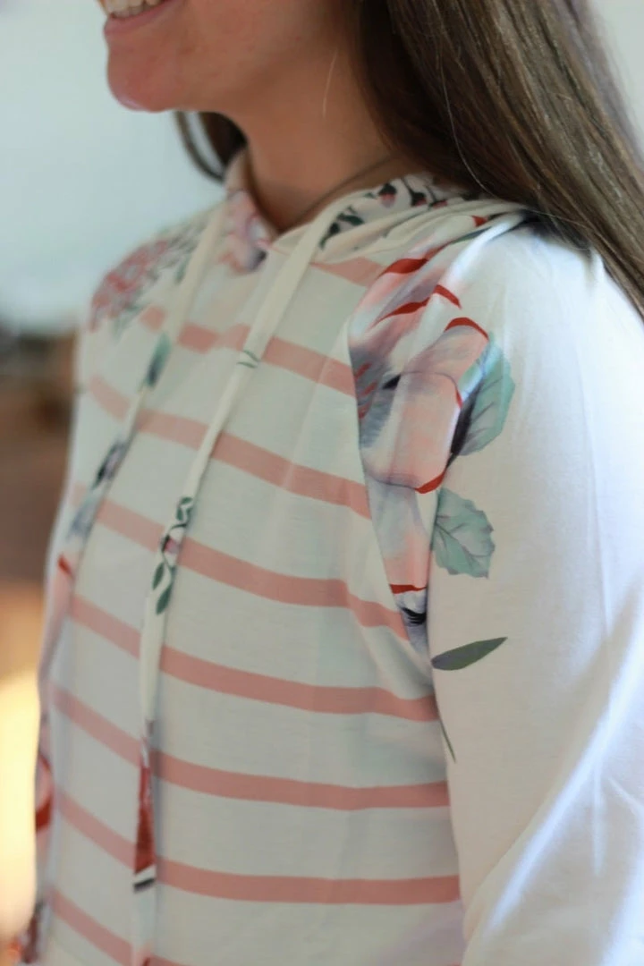 This floral and striped pullover hoodie is just what the doctor ordered for spring! Perfect with your favorite pair of jeans and sneakers or a cute vest, jeans and boots for these cold winter months!