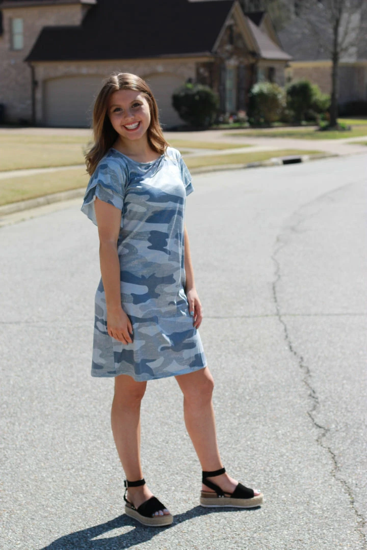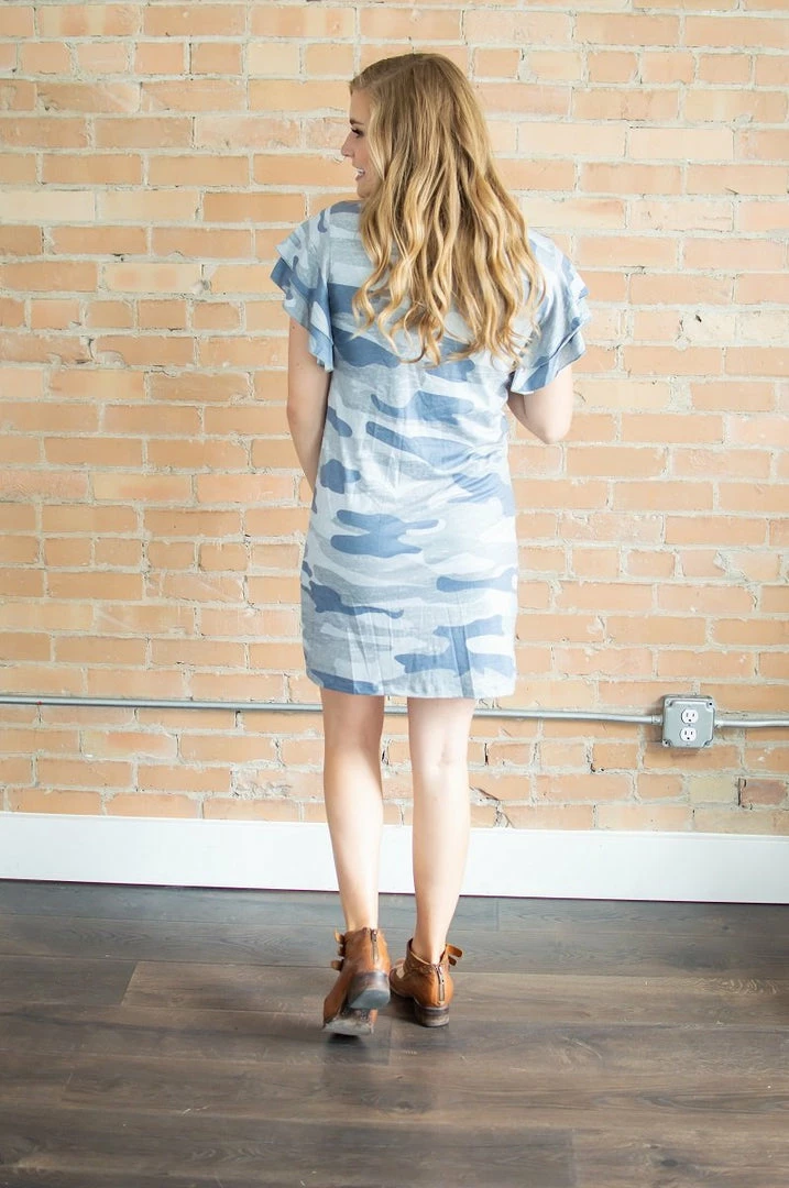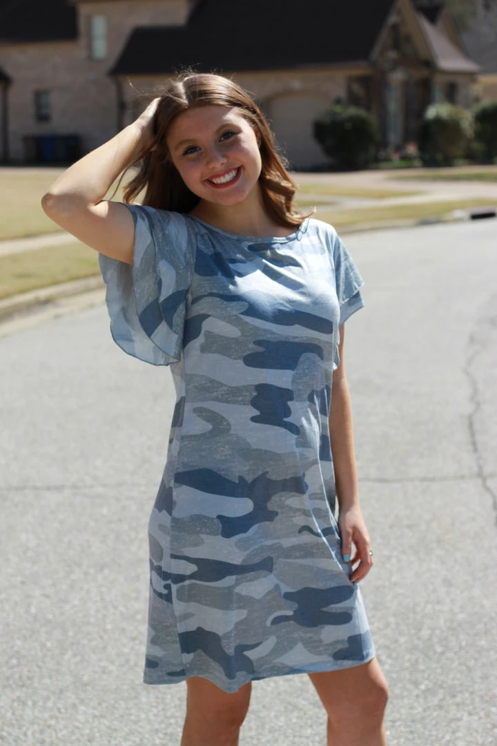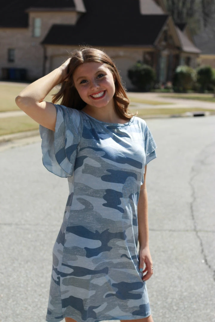 Bring style and sass to your summer wardrobe with this Flutter Sleeve Dress in Camo. The poly spandex fabric is soft and ultra comfortable and flattering on all body types!