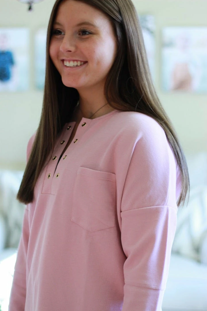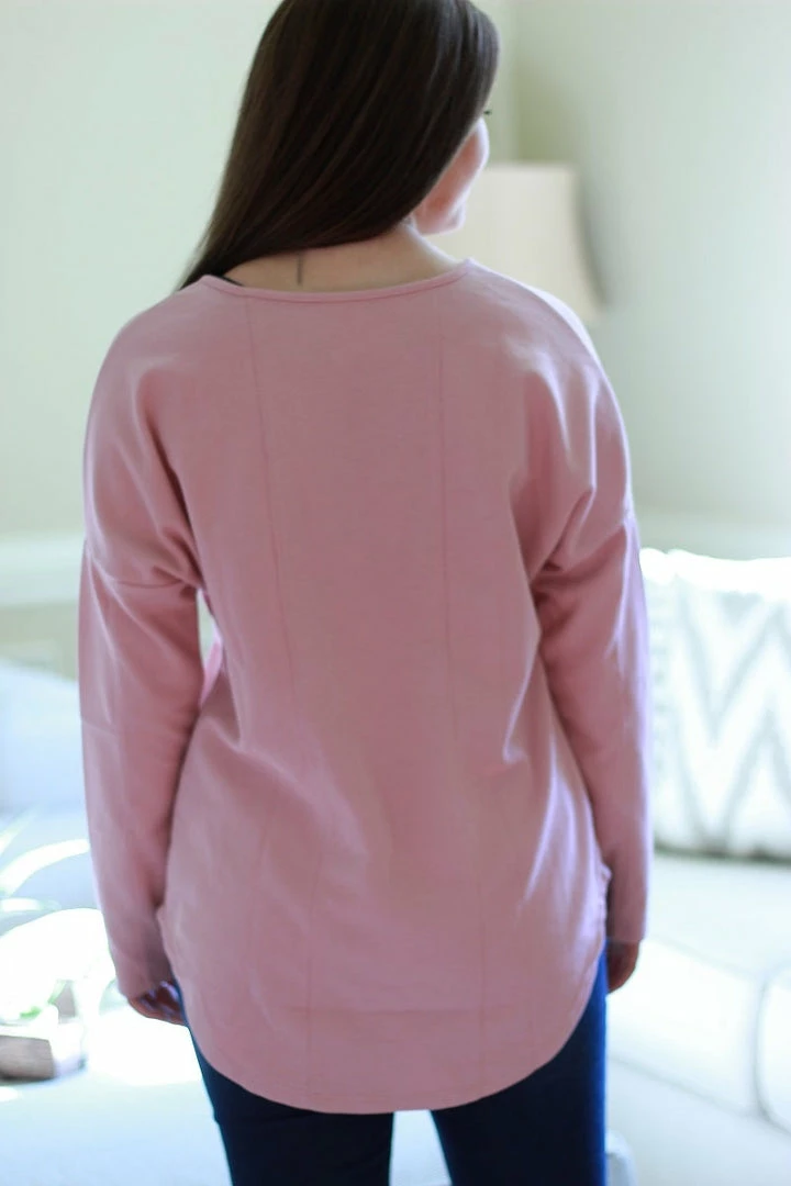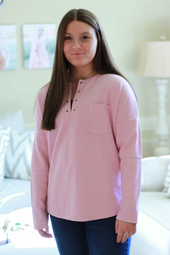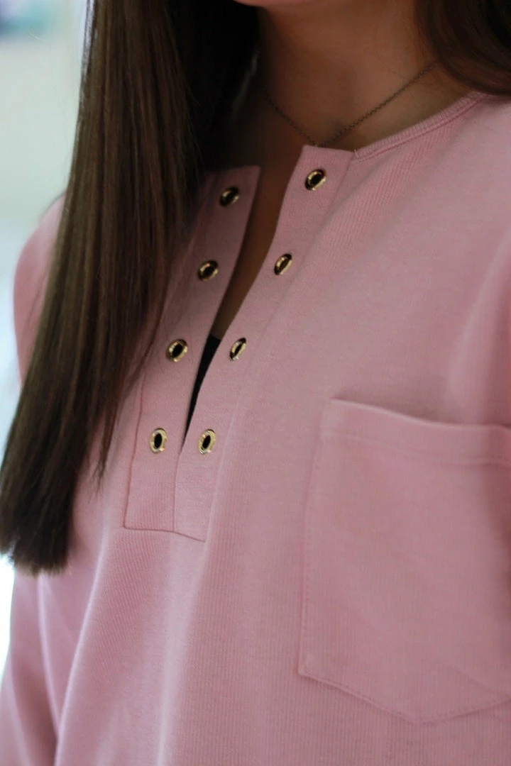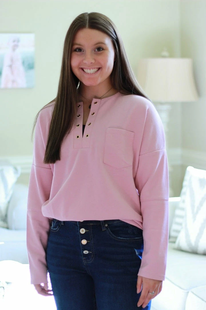 This pink long sleeve shirt is simple, with the cutest details! A simple pocket and lace up front. The arm and back sleeve make this top stand out from other casual pink long sleeve shirts. Mid-weight, perfect for spring.