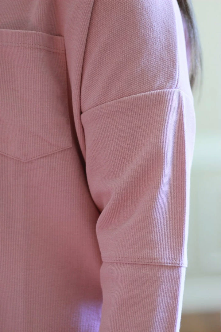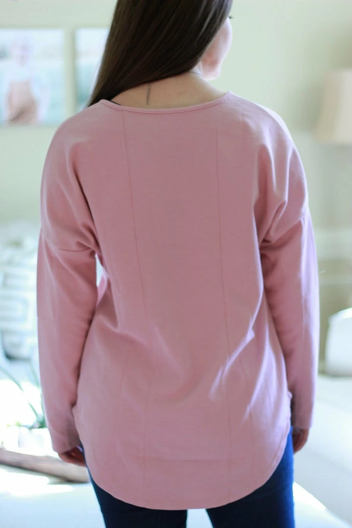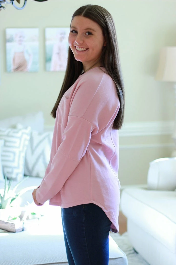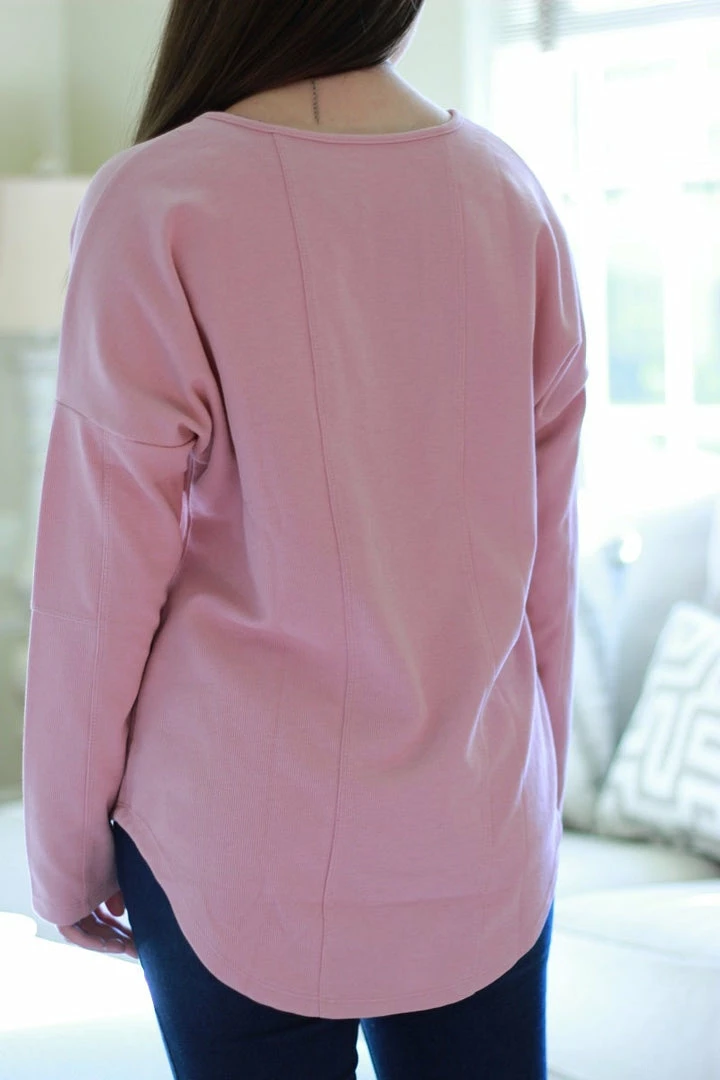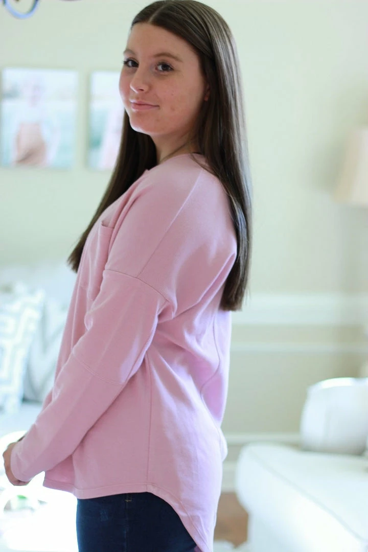 This pink long sleeve shirt is simple, with the cutest details! A simple pocket and lace up front. The arm and back sleeve make this top stand out from other casual pink long sleeve shirts. Mid-weight, perfect for spring.